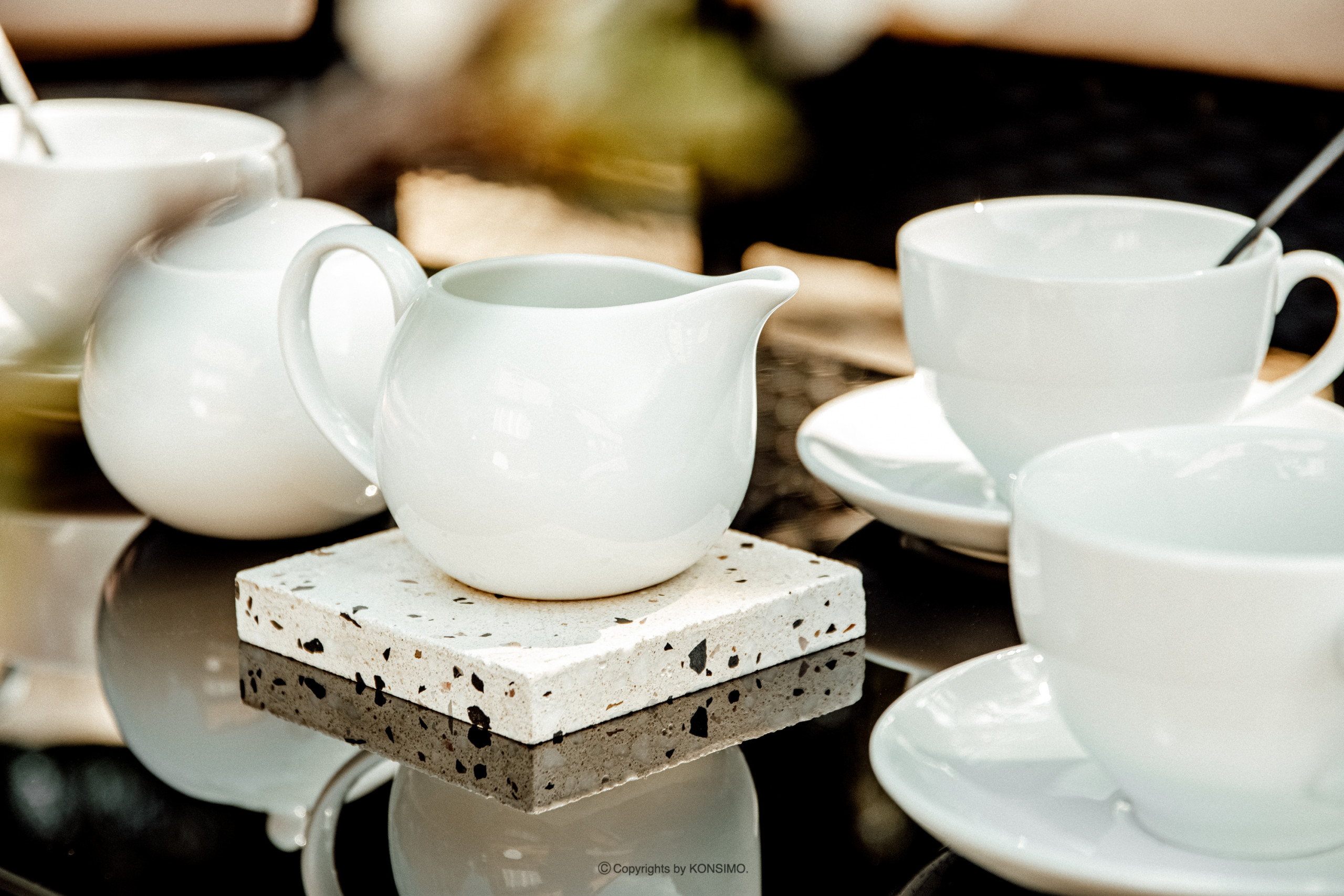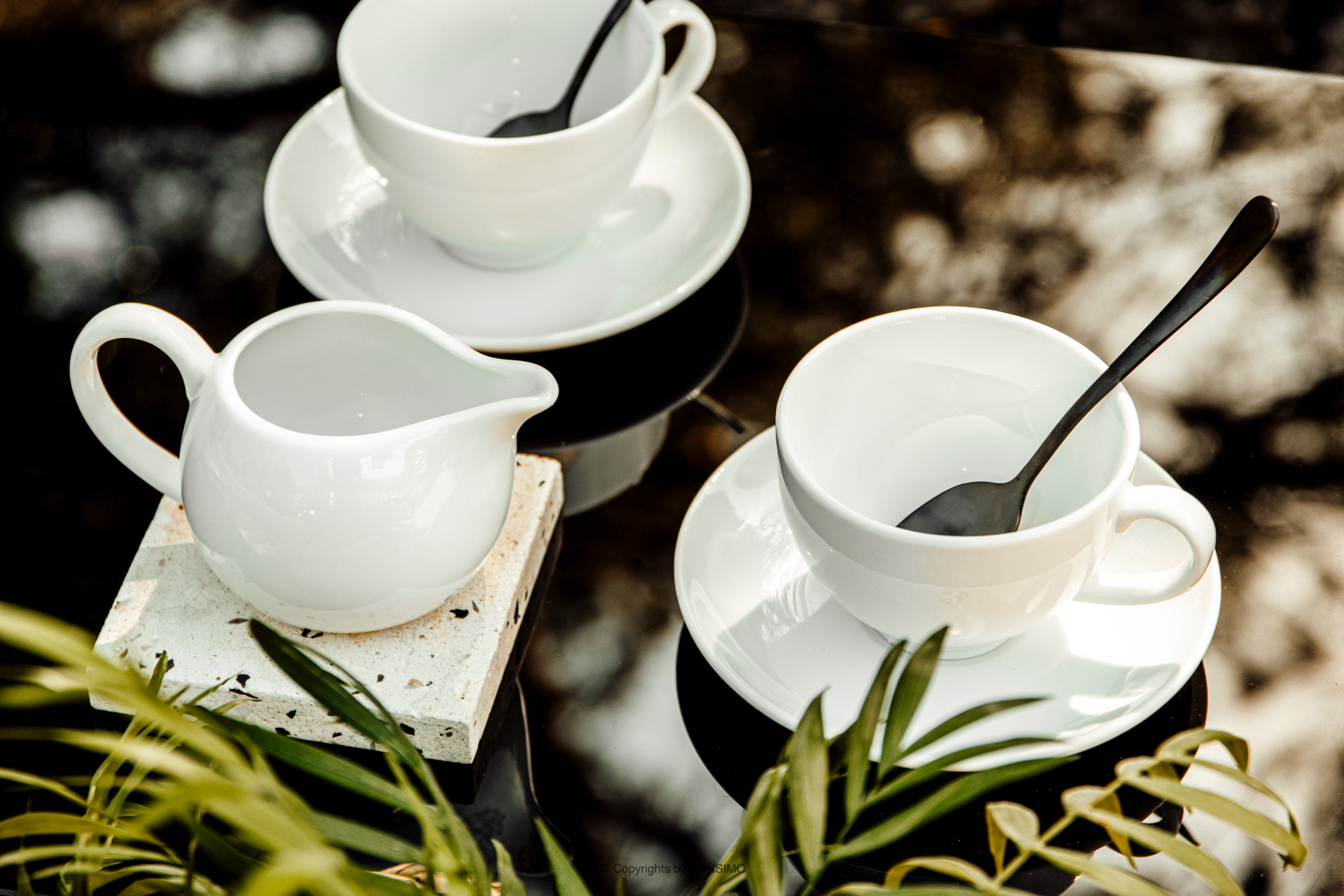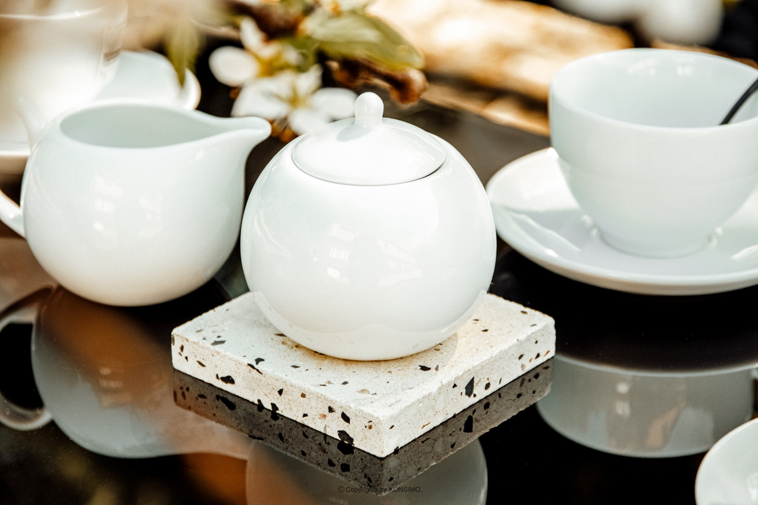 Die universelle weiße Tasse eignet sich für Zuhause, Restaurants oder Cafés. Sie haben ein großes Fassungsvermögen und eignen sich daher perfekt zum Servieren von leckerem Tee oder duftendem Kaffee. Die weiße Tasse eignet sich hervorragend als Ergänzung zu einem eleganten Tisch für familiäre Feiern, ist aber auch nützlich für ein Treffen mit Freunden am Nachmittag.
