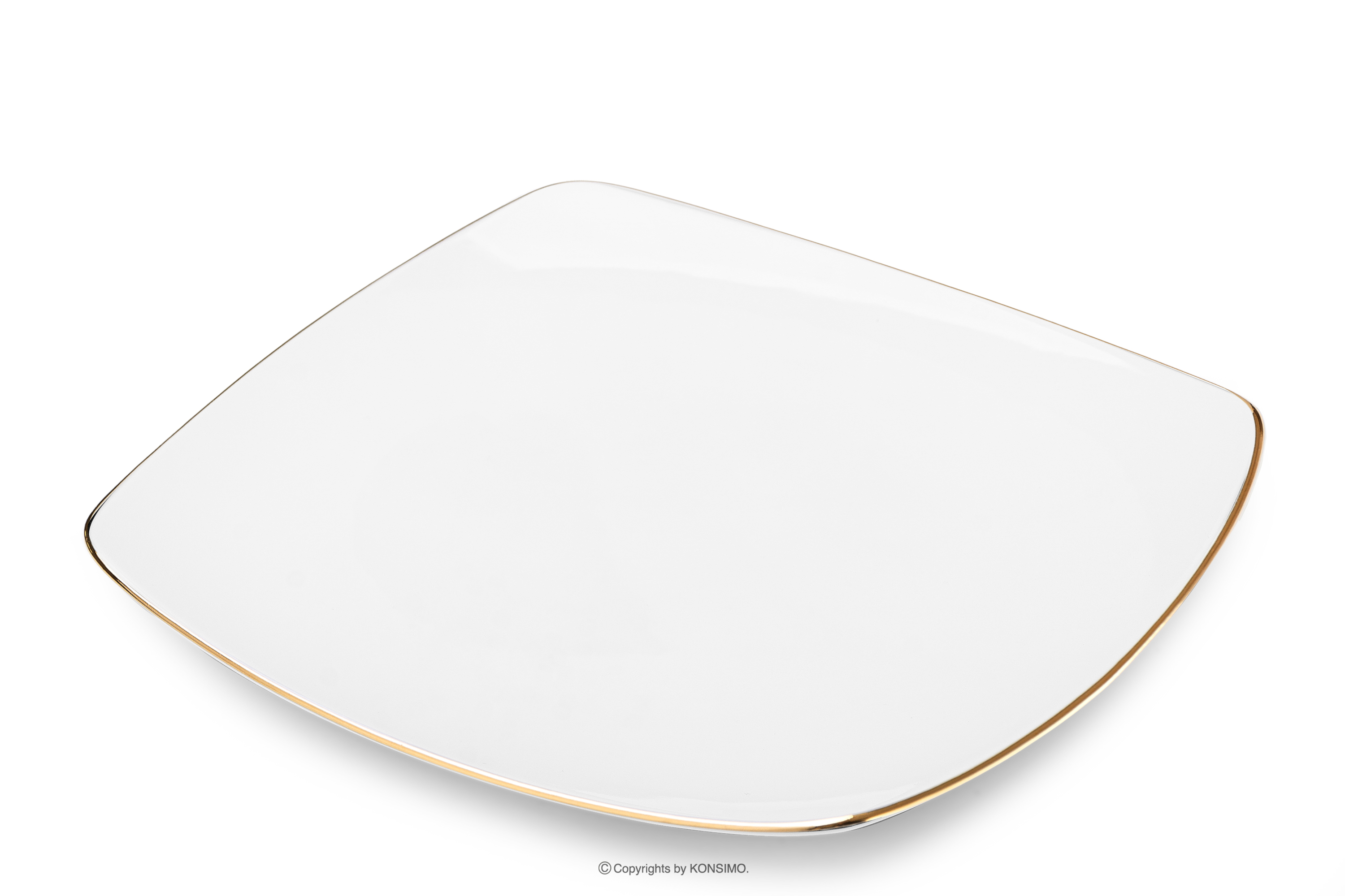 Der Speiseteller der Goldlinie ist ein Produkt, das die Quintessenz von Stil und Klasse darstellt. Sein einzigartiges Design, das auf einer quadratischen Form basiert, verleiht jedem Stück einen modernen Charakter. Die zarte Linie am Rand verleiht ihm einen subtilen Glanz, der ihn nicht nur zu einem perfekten Funktionselement, sondern auch zu einem dekorativen Element macht, das die Aufmerksamkeit auf sich zieht.