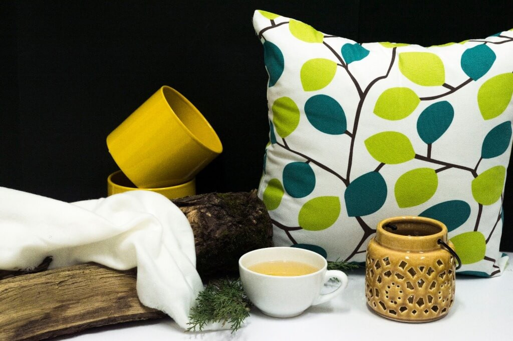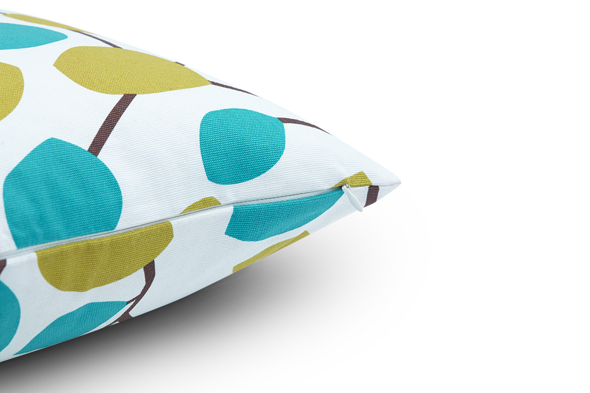 Grüntürkise Muster auf weißem Hintergrund schmücken den Raum wunderschön. Sie sind aus hochwertiger Baumwolle gefertigt. Das scheinbar kleine Kissen verleiht dem Interieur einen modernen Charakter und vervollständigt den Raum, der in ähnlichem Stil eingerichtet ist. Eine bequeme Kopfstütze oder Rückenlehne ist ein unverzichtbares Element der Entspannung nach einem anstrengenden Arbeitstag, daher lohnt es sich, sich um einen schönen Kissenbezug zu kümmern, der dies ermöglicht und gleichzeitig den Raum schmückt.