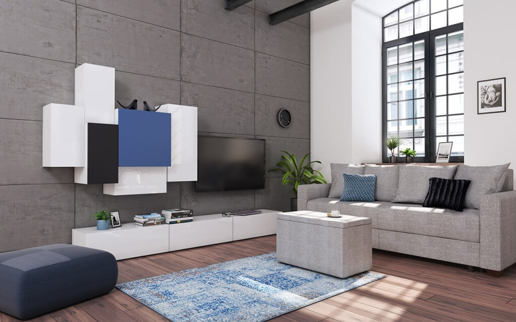 Der moderne große hängende Regal SCAVO ist ein praktisches und funktionales Möbelstück, das in jedem modernistischen Interieur Verwendung finden wird. Der Hochglanzlaminat in Weiß-Blau-Schwarz, die einfache Konstruktion und das einzigartige Design betonen den modernen Stil des Regals und verleihen ihm einen unverwechselbaren Charakter. Die geräumigen Regalböden bieten Platz für viele Kleidungsstücke und andere Haushaltsgegenstände.