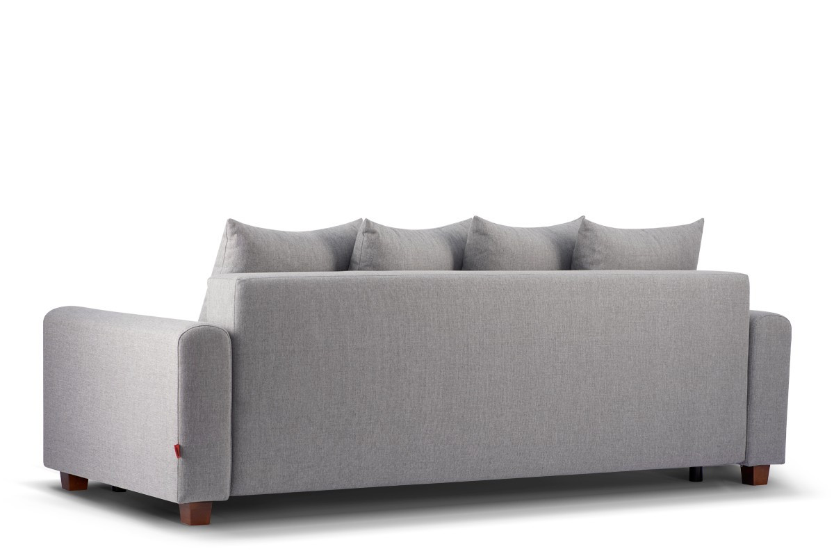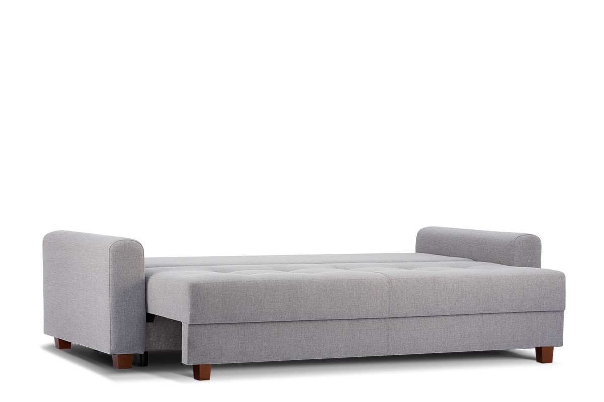 Entworfen mit Funktionalität im Sinn, ist das moderne graue Schlafsofa REVO tagsüber ein bequemes Sofa und verwandelt sich nachts in ein breites und praktisches Bett. Dank des Ausziehmechanismus lässt sich das Sofa DL schnell und effizient ausklappen - es reicht aus, die Rückenlehne nach vorne zu neigen. Ein großer Stauraum bietet Platz für Bettwäsche und mehr.