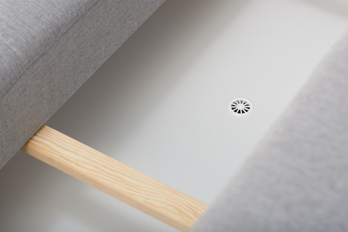 - Gestell: Holzfaserplatte 3,2 mm, innen weiße 16-mm-Spanplatte, außen mit technischem Oberstoff gepolstert