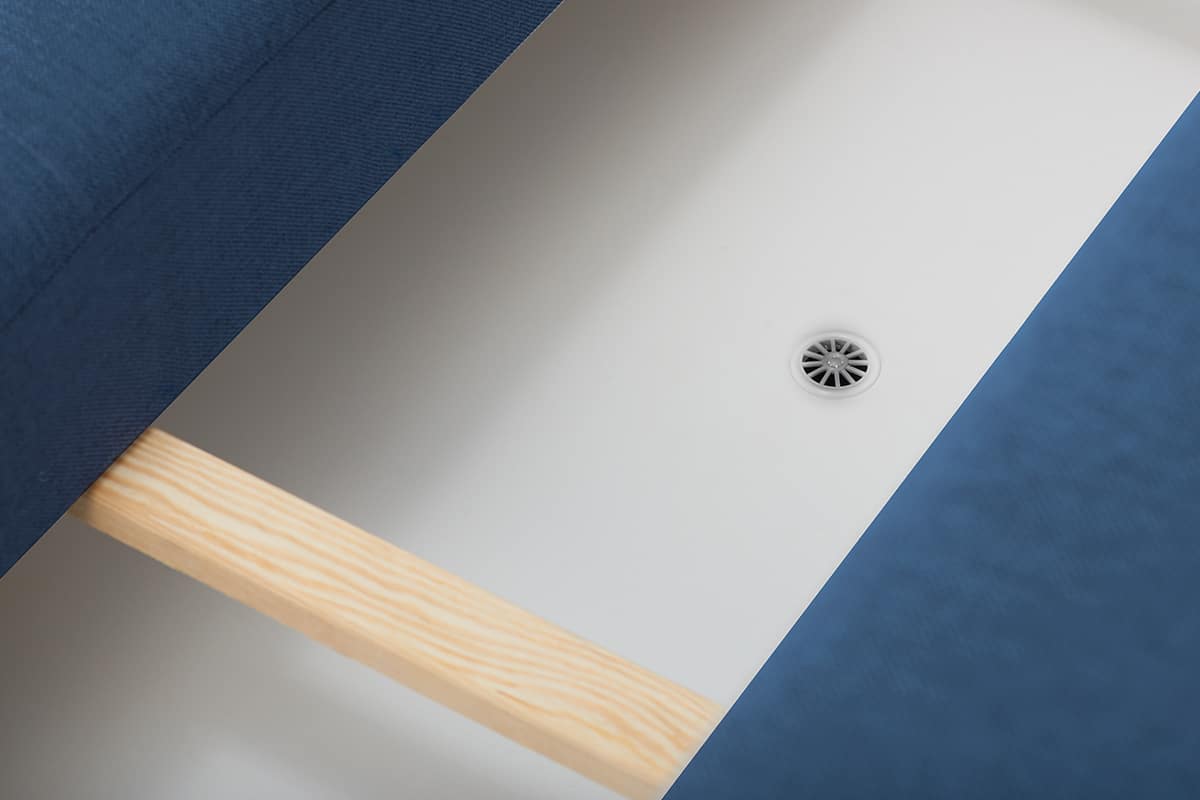 - Gestell: Holzfaserplatte 3,2 mm, innen weiße 16-mm-Spanplatte, außen mit technischem Oberstoff gepolstert