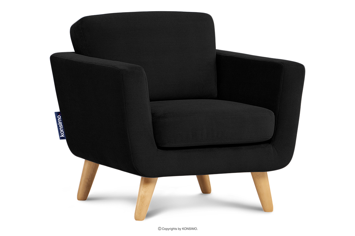 Der schwarze skandinavische Sessel aus der TAGIO-Kollektion ist ein Produkt aus hochwertigen Materialien. Das Design ist von der Region Nordeuropa inspiriert. Ein zusätzliches Merkmal dieses Möbels ist der Kissenbezug, der eine ästhetisch versteckte Reißverschluss-Tasche enthält. Der TAGIO-Sessel ist mit Samtstoff bezogen, der sich unglaublich angenehm anfühlt und gleichzeitig abrieb- und pillingbeständig ist.