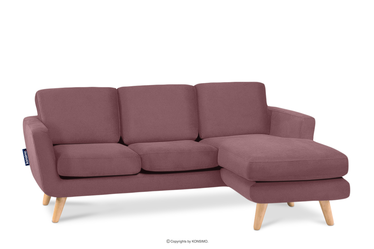 Das rosa skandinavische Ecksofa rechts mit Ottomane aus der TAGIO-Kollektion ist ein Produkt aus hochwertigen Materialien. Das Design ist von der Region Nordeuropa inspiriert. Ein zusätzliches Merkmal dieses Möbels ist der Bezug der Kissen, der ästhetisch versteckte Reißverschluss-Tunnel enthält. Das TAGIO-Ecksofa ist mit samtigem Stoff bezogen, der sich unglaublich angenehm anfühlt und gleichzeitig abrieb- und pillingfest ist.