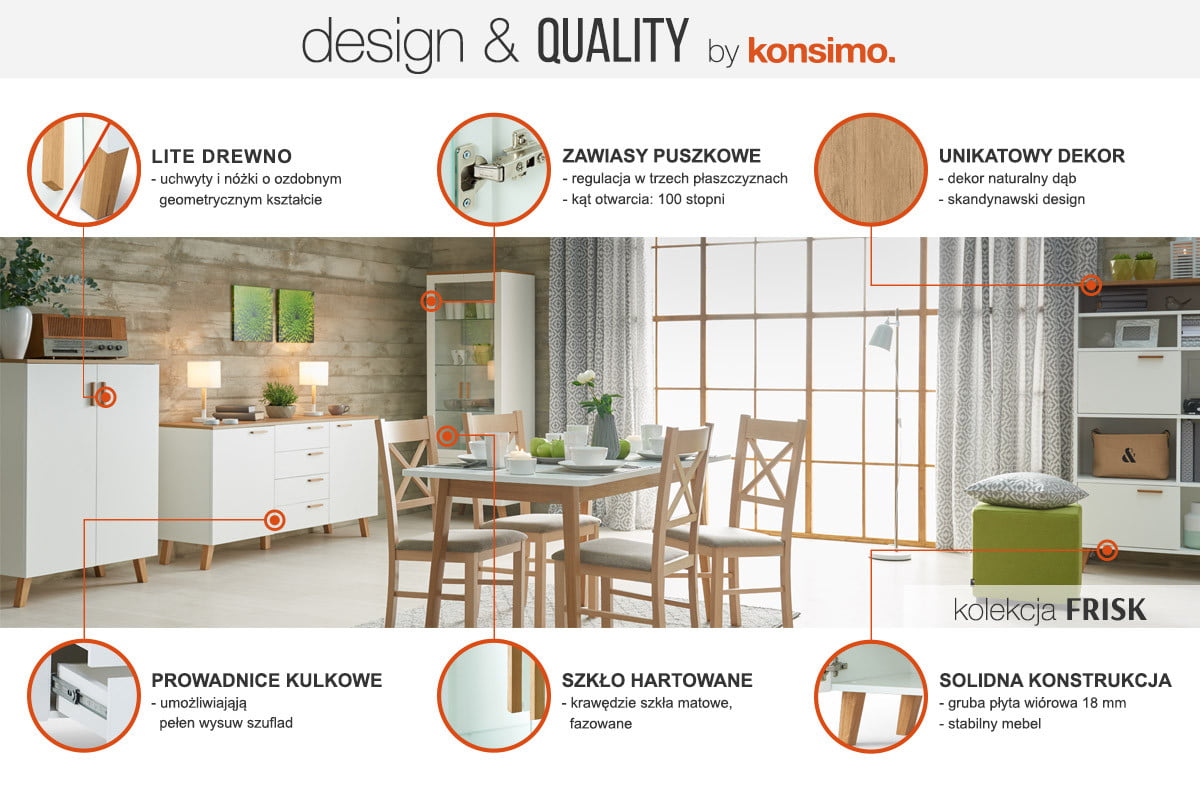 Die Designer der skandinavischen Kommode aus der FRISK-Kollektion haben nicht nur auf das Design, sondern auch auf höchste Qualität geachtet. Die Konstruktion wird von stabilen Beinen aus Massivholz unterstützt - dadurch ist die Kommode stabil und hält auch großen Belastungen stand. Die spezielle Befestigung der Rückwand verstärkt das Möbelstück zusätzlich, und die strapazierfähigen Scharniere, die in drei Ebenen verstellbar sind, erleichtern die Nutzung.