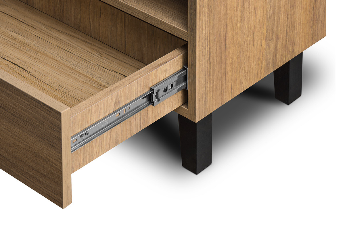 Der Besitz von AV-Geräten, wie zum Beispiel einem Fernseher, erfordert die Ausstattung mit entsprechenden Möbeln. Das Laminat in natürlicher Eichenfarbe, die Holzbeine und die Veredelungen betonen seinen skandinavischen Stil und verleihen ihm Eleganz. Die überraschende Kapazität des Regals und der Schubladen ermöglicht die Aufbewahrung verschiedener Gegenstände, wodurch wir eine bessere Ordnung bewahren und gleichzeitig einen leichten Zugang zu benötigtem Zubehör gewährleisten können. Es wurden Kugelführungen verwendet, die sich durch eine vollständige Auszugsmöglichkeit auszeichnen, sowie Dosenbeschläge als zusätzliche Ausstattung.