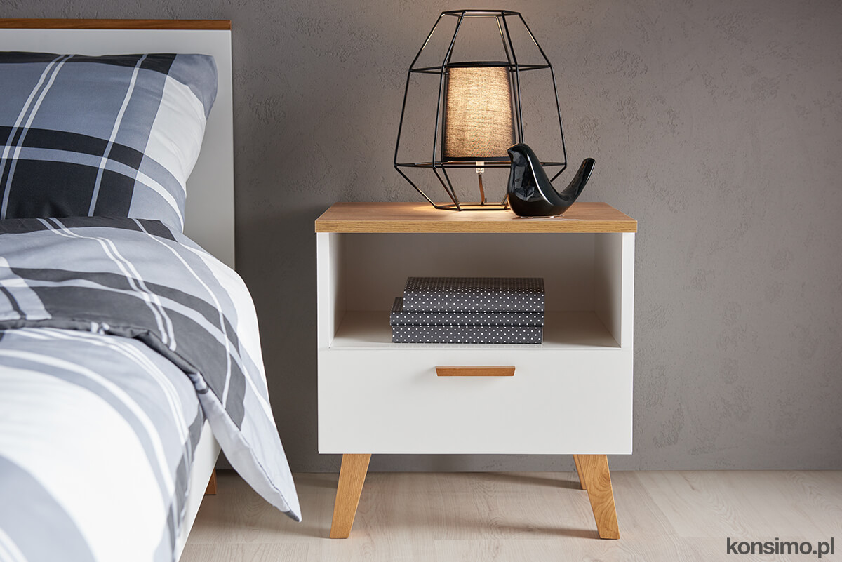 Modern, ästhetisch und äußerst praktisch - der weiße skandinavische Nachttisch aus der FRISK-Kollektion wird sowohl Erwachsenen als auch Jugendlichen gefallen. Die robuste Oberfläche wird zum idealen Ort für eine Nachttischlampe und ein Buch. Die tiefe Schublade mit Vollauszug bietet Platz für alle benötigten Accessoires. Der Nachttisch ist aus robustem, laminiertem Holz gefertigt.