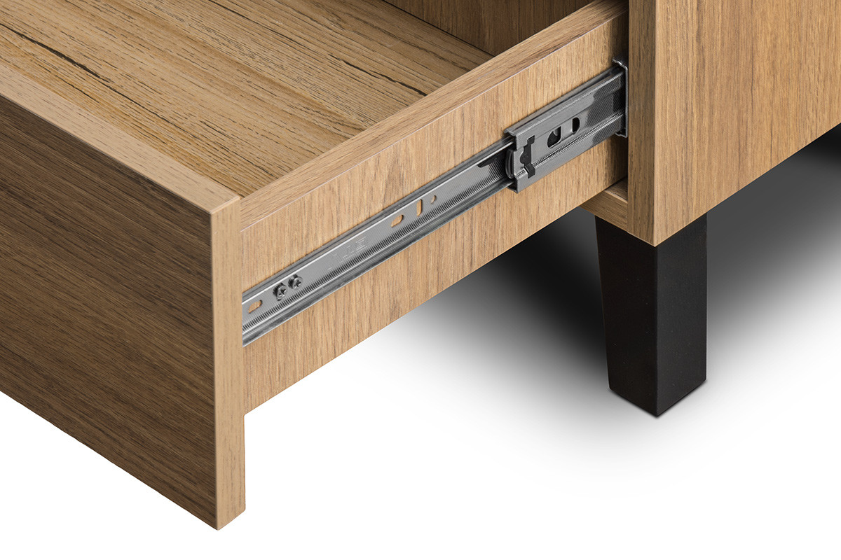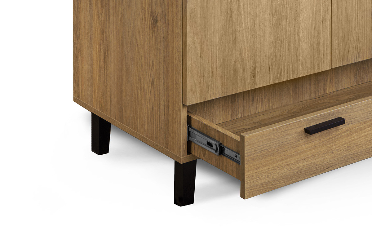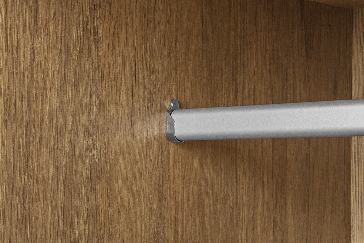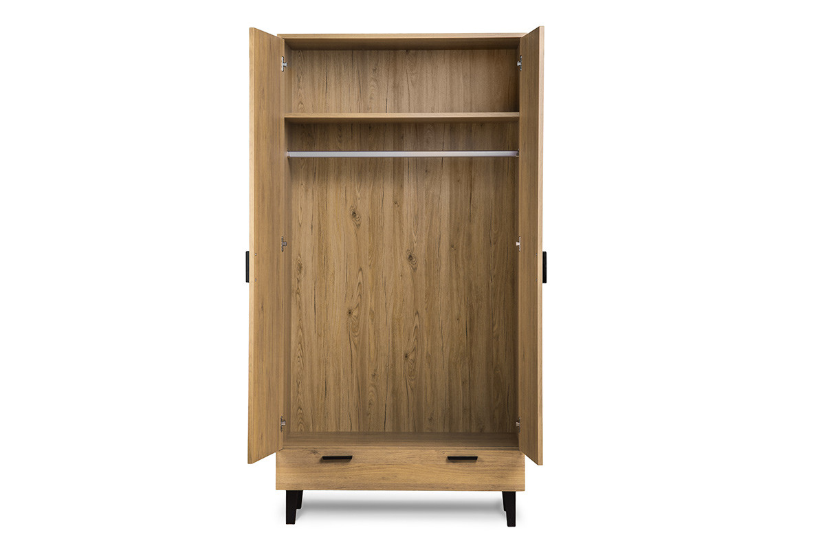 Breites und geräumiges oberes Regal, stabile Kleiderstange, und unten eine leise und bequem herausziehbare, geräumige Schublade. All dies haben die Designer des Kleiderschranks aus der skandinavischen Kollektion FRISK bedacht. Er ist aus sehr strapazierfähigem Holzwerkstoff mit holzähnlicher Beschichtung gefertigt. Die Konstruktion wird zusätzlich durch eine spezielle Befestigung der Rückwand stabilisiert. Zuverlässige Funktionalität des Schranks gewährleisten hochwertige Dosenbeschläge, kugelgelagerte hydraulische Schubladenschienen sowie bequeme, stabile Griffe aus Buchenholz.