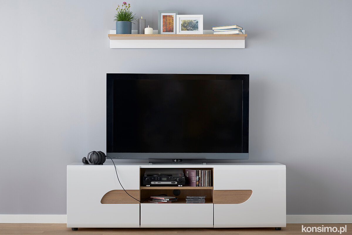 Große Arbeitsplatte, geräumige Regale und eine Schublade bieten viel Platz für Elektronik, Zeitungen oder Platten. Erhältlich in weißem oder holzähnlichem Laminat. Die Einschnitte an den Schranktüren betonen den modernen Stil des Schranks und verleihen ihm einen innovativen Charakter. Der Schrank hat 3 Regale und eine Schublade mit Soft-Close-Funktion und "Push-to-Open"-Öffnung. Hergestellt aus stabilem laminiertem Holzimitat - er zeichnet sich sowohl durch sein elegantes Aussehen als auch durch seine außergewöhnliche Stabilität aus.