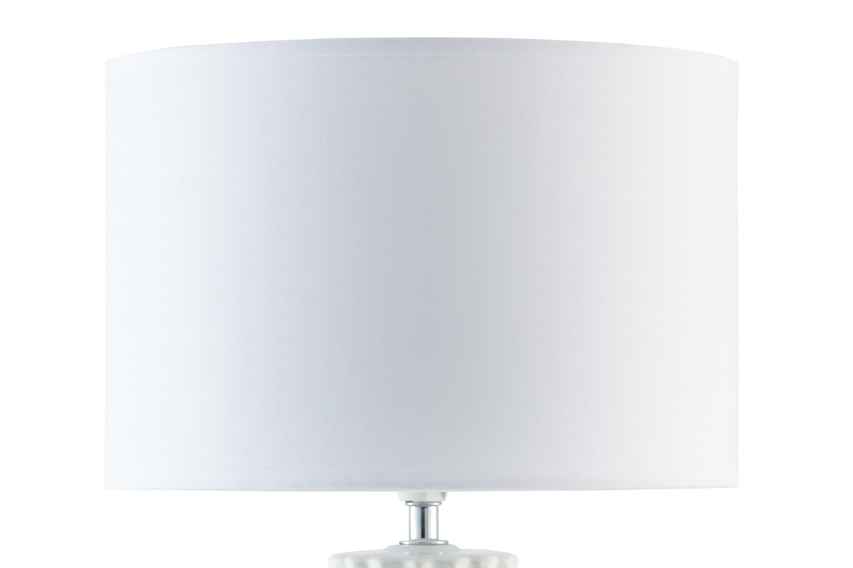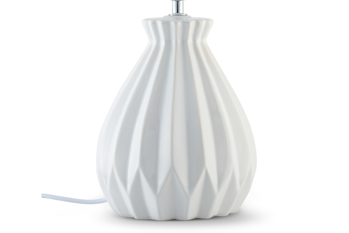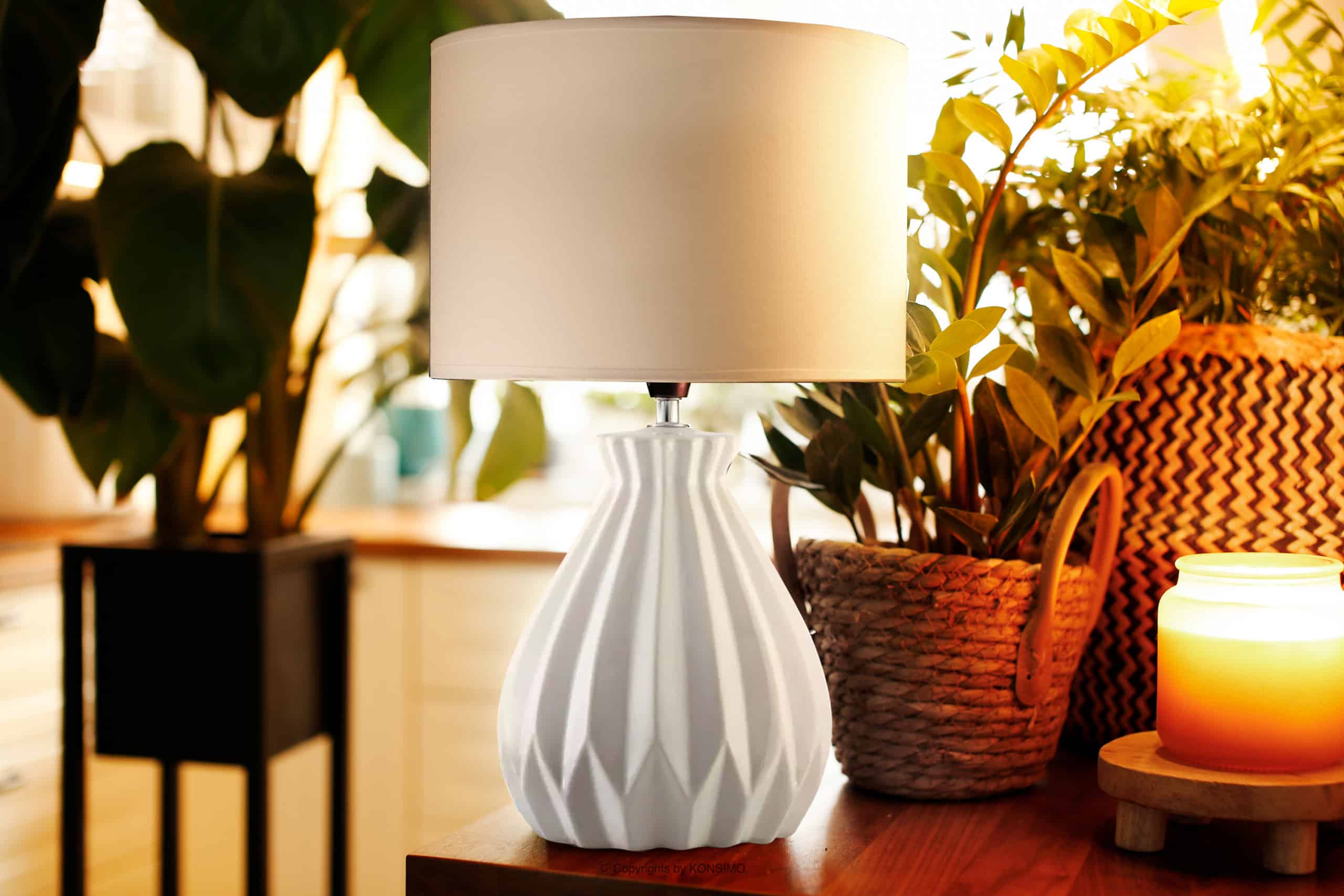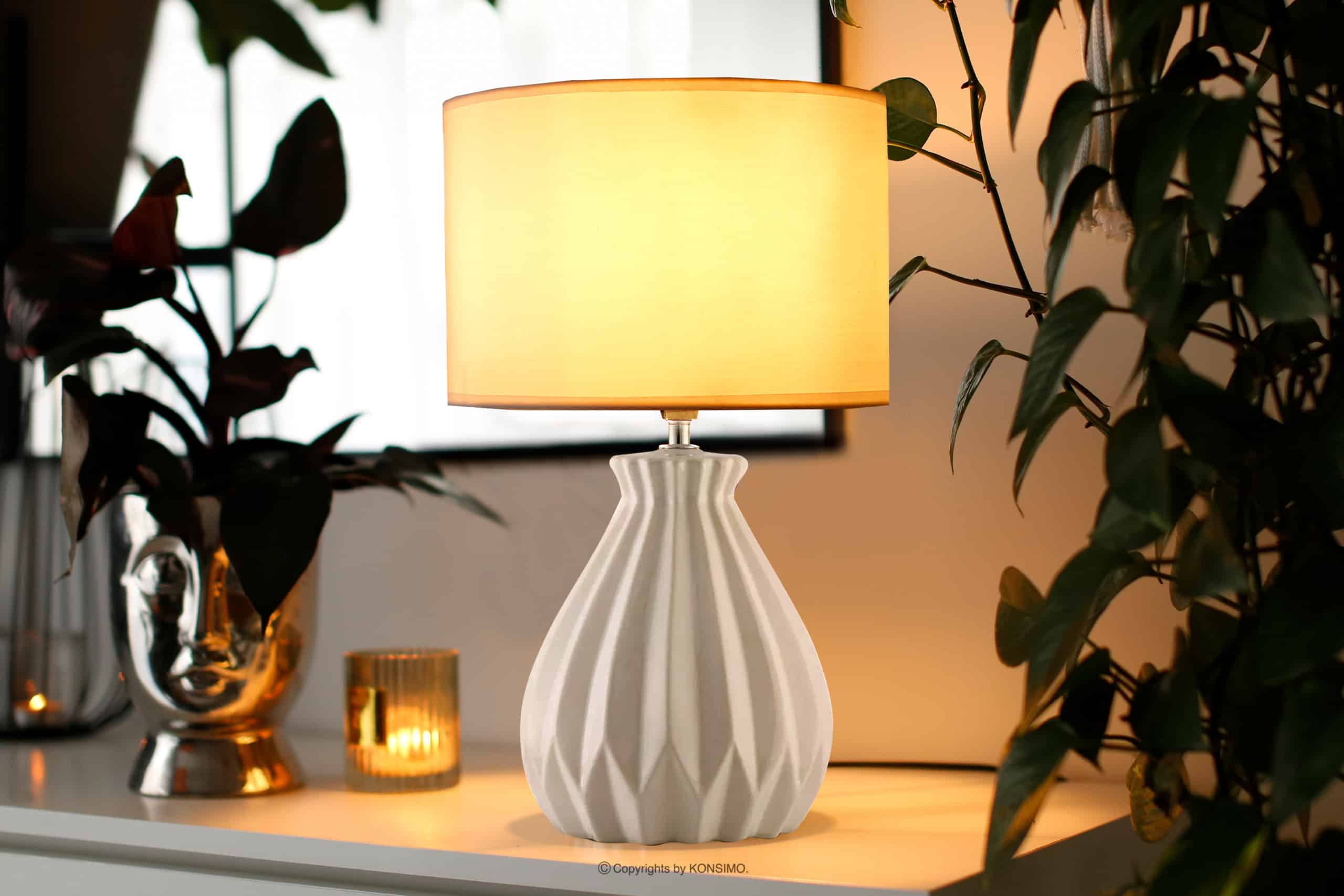 Der Fuß ist aus Keramik gefertigt, während der Lampenschirm aus Stoff besteht.