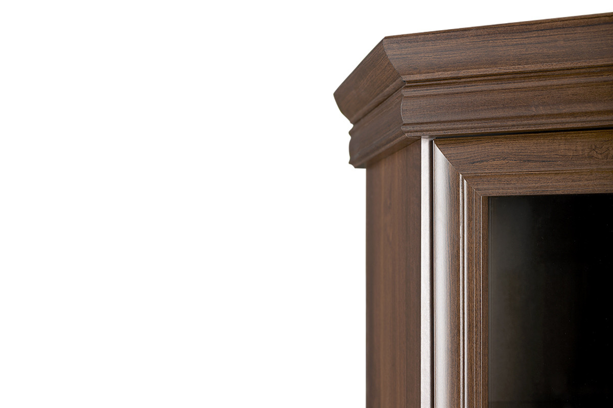 Zusätzlich verfügt die Rückwand über eine spezielle Verstärkung, die Stabilität gewährleistet. Bequem zu öffnende, verglaste Türen des Schrankes ermöglichen nicht nur die Aufbewahrung, sondern auch die elegante Präsentation der dekorativsten Gegenstände des täglichen Gebrauchs. Dieser klassische, stilvolle Aufsatz der Eckschrankkommode bietet in der Wohnung viel zusätzlichen Stauraum.