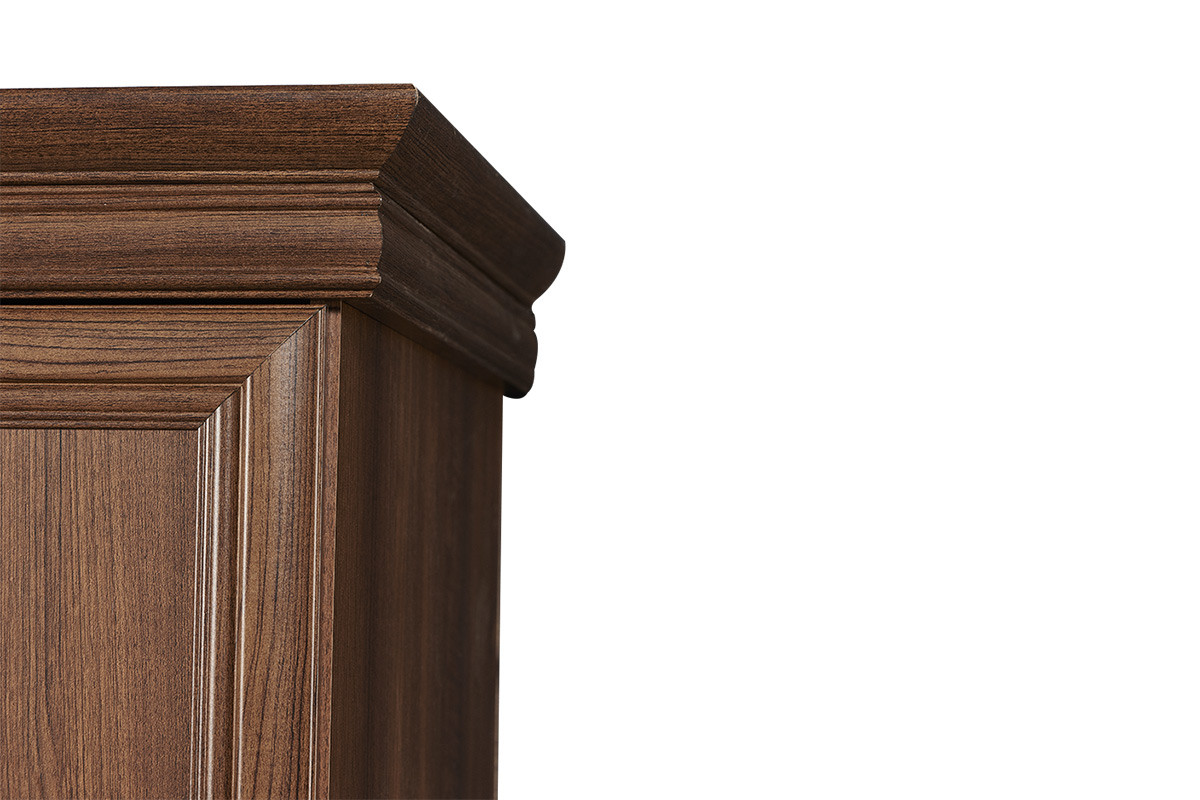 Der Schrank ist aus robusten und dicken Platten gefertigt. Spezielle Verstärkungen an der Rückwand gewährleisten die Stabilität der Konstruktion. In der Mitte der Front des Schranks befindet sich ein Spiegel - ein funktionaler Bestandteil, der in Schlafzimmer, Ankleidezimmer, aber auch Wohnzimmer oder Gästezimmer nützlich ist. Starke Scharniere und rollengeführte Schubladenschienen garantieren jahrelange zuverlässige Nutzung des Schranks.