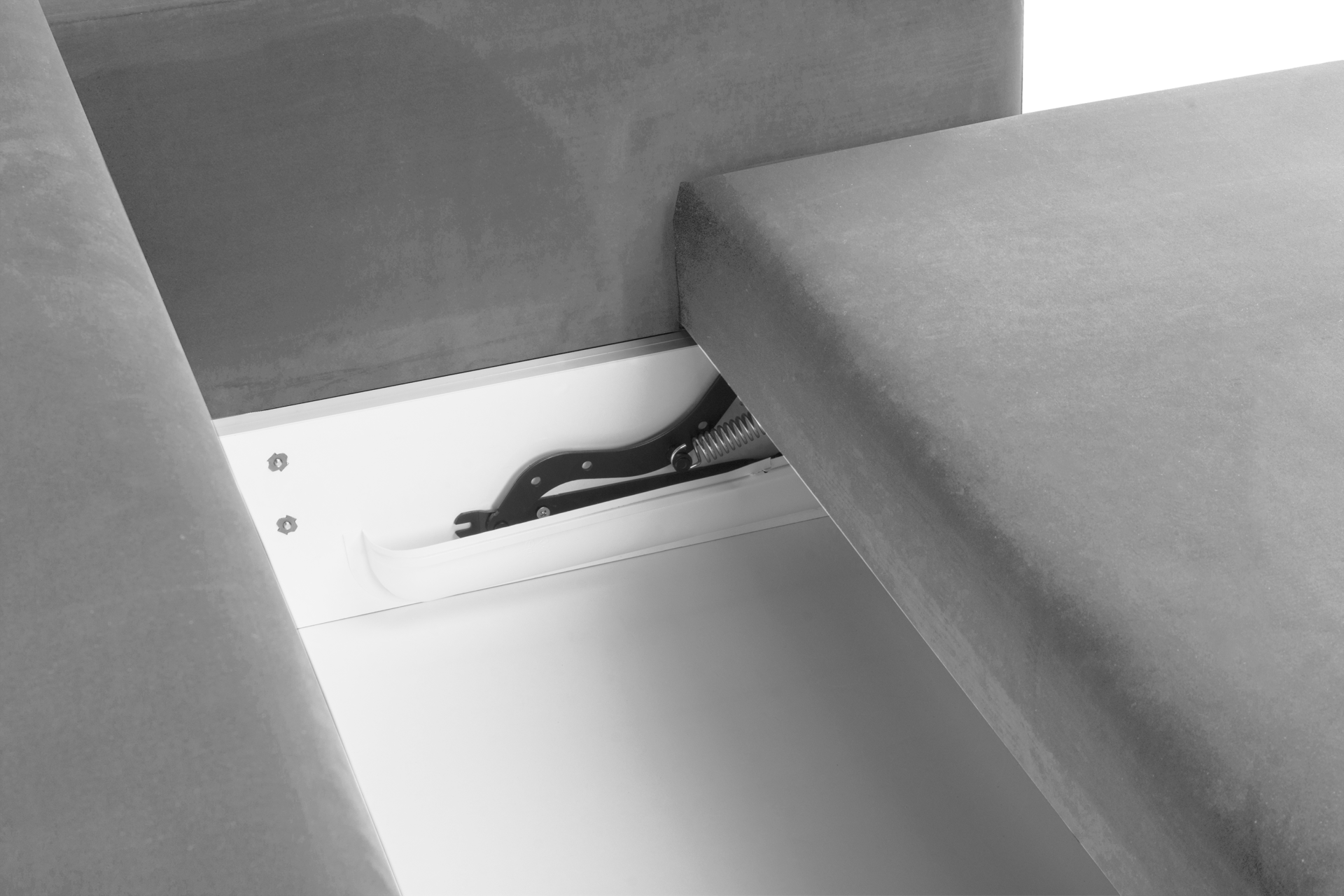 - Gestell: Holzfaserplatte 3,2 mm, innen weiße 16-mm-Spanplatte, außen mit technischem Oberstoff gepolstert