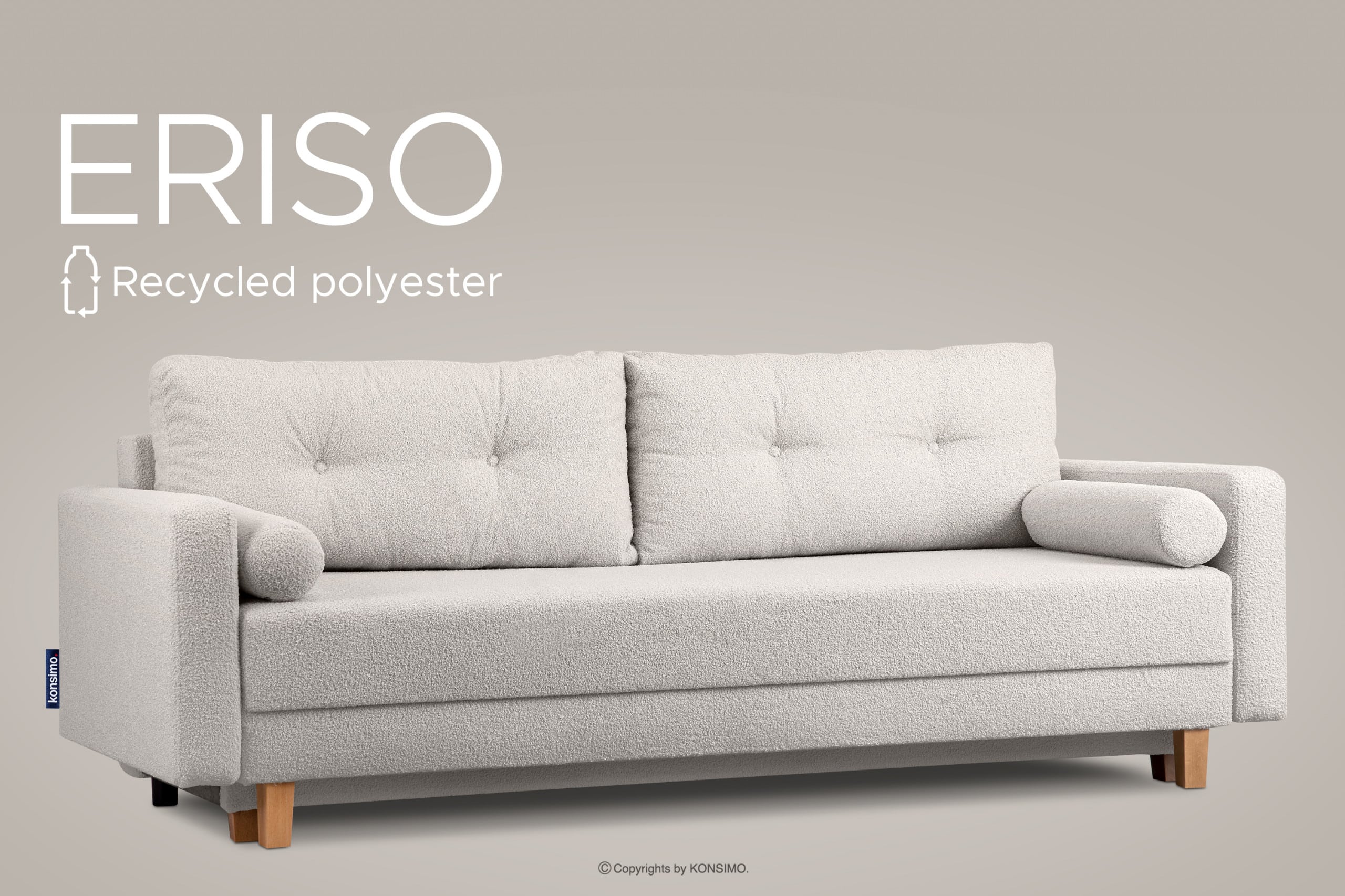 Der Bezug aus hochwertigem Boucle-Gewebe zeichnet sich durch Langlebigkeit und Widerstandsfähigkeit gegen Beschädigungen aus. Zwei Rückenkissen und zwei dekorative Kissen erhöhen den Komfort dieser modernen Couch. Dank der in ästhetischen Tunnel versteckten Reißverschlüsse können die Bezüge leicht abgenommen und schnell gereinigt werden. Der mittelfeste Sitz mit Bonell-Federung und T25-Schaumstoff sorgt für hohen Komfort. Das Sofa fügt sich perfekt in eine minimalistische Wohnzimmergestaltung ein. Die Holzfüße und das hochwertige Material verleihen dem Eriso-Sofa Eleganz und unterstreichen seinen skandinavischen Stil. Die gesamte Konstruktion ist stabil und das Möbelstück langlebig, so dass es lange halten sollte. Der Bezug ist teilweise schmutzabweisend und die Reinigung sollte keine größeren Probleme darstellen.