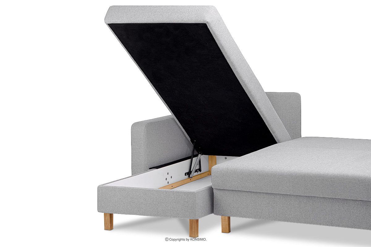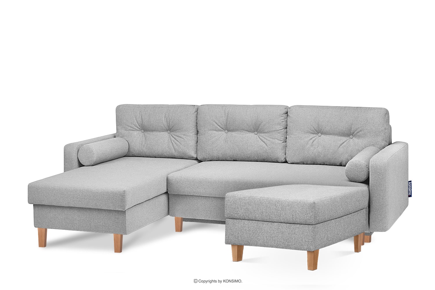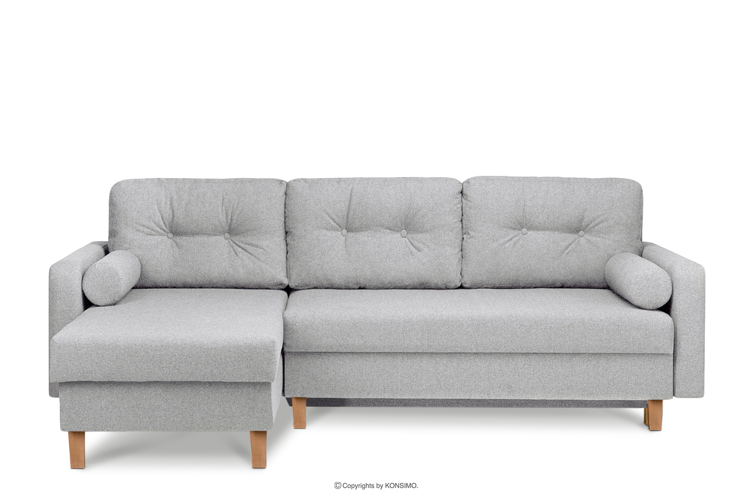 Das graue Ecksofa im skandinavischen Stil, hergestellt aus hochwertigen Materialien und mit einer starken und stabilen Konstruktion, bietet den Bewohnern und Gästen einen komfortablen Rückzugsort. Dank des automatischen DL-Mechanismus lässt es sich bequem ausklappen und bietet Platz zum Schlafen - eine ideale Lösung nicht nur für Gäste. Es eignet sich auch hervorragend für kleine Wohnungen, wo das Sofa als Bett fungiert.