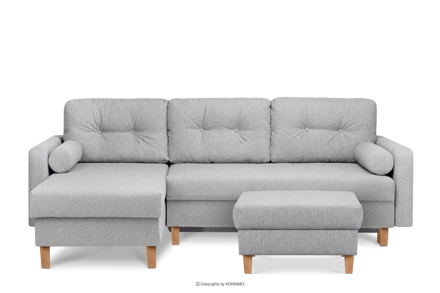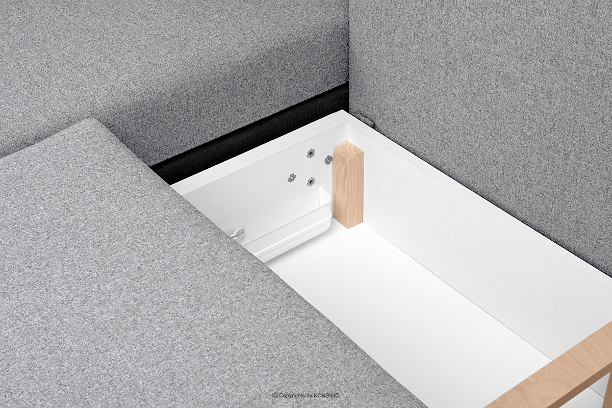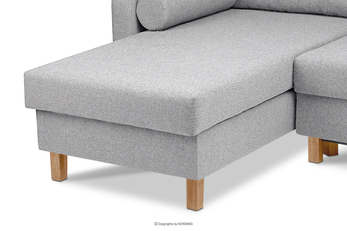 Das graue Ecksofa im skandinavischen Stil, hergestellt aus hochwertigen Materialien und mit einer starken und stabilen Konstruktion, bietet den Bewohnern und Gästen einen komfortablen Rückzugsort. Dank des automatischen DL-Mechanismus lässt es sich bequem ausklappen und bietet Platz zum Schlafen - eine ideale Lösung nicht nur für Gäste. Es eignet sich auch hervorragend für kleine Wohnungen, wo das Sofa als Bett fungiert.