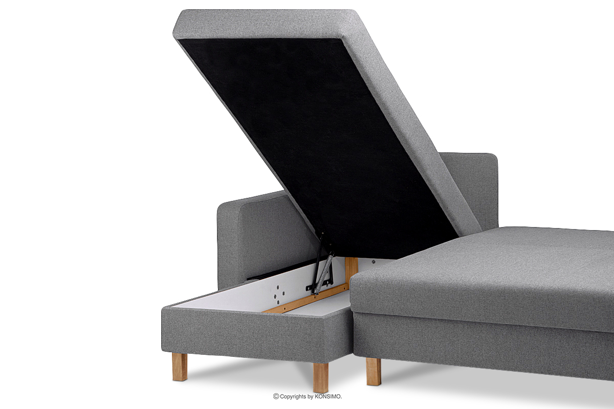 Hergestellt aus hochwertigen Materialien, mit einer starken und stabilen Konstruktion, wird das dunkelgraue Ecksofa im skandinavischen Stil den Bewohnern und Gästen einen komfortablen Rückzugsort bieten. Dank des automatischen DL-Mechanismus lässt es sich bequem ausklappen und bietet Platz zum Schlafen - eine ausgezeichnete Lösung nicht nur für Gäste. Es eignet sich auch hervorragend für kleine Wohnungen, in denen das Sofa als Bett dient.