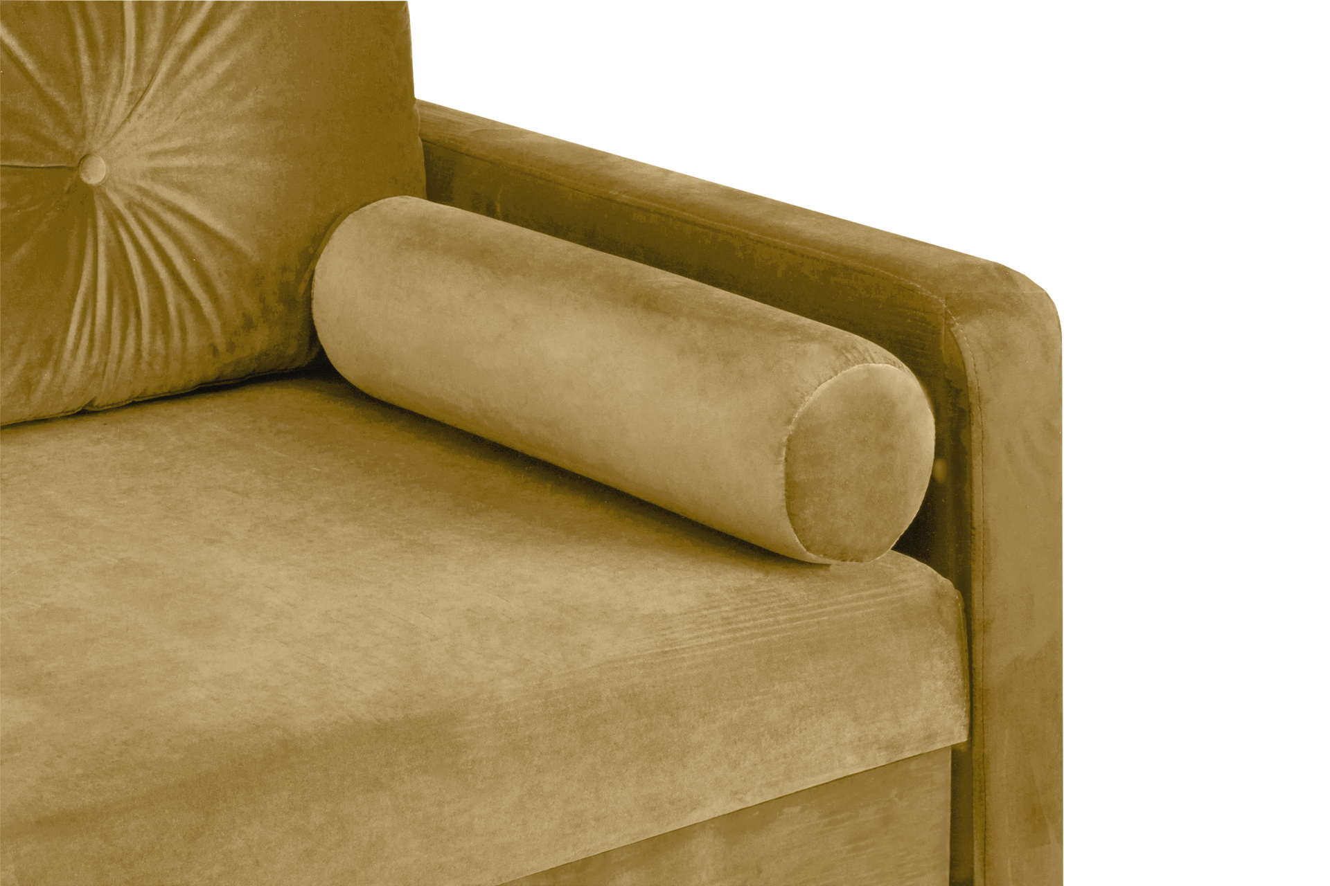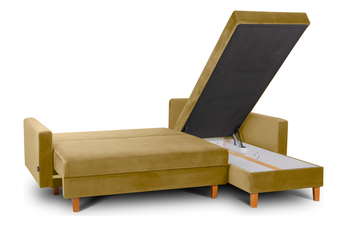 Der gelbe Samtecksofa im skandinavischen Stil, hergestellt aus hochwertigen Materialien und mit einer starken und stabilen Konstruktion, bietet den Bewohnern und Gästen einen komfortablen Rückzugsort. Dank des automatischen DL-Mechanismus lässt sich das Sofa bequem ausklappen und bietet einen Schlafplatz - eine ausgezeichnete Lösung nicht nur für Gäste. Es eignet sich auch hervorragend für kleine Wohnungen, in denen das Sofa als Bett fungiert.