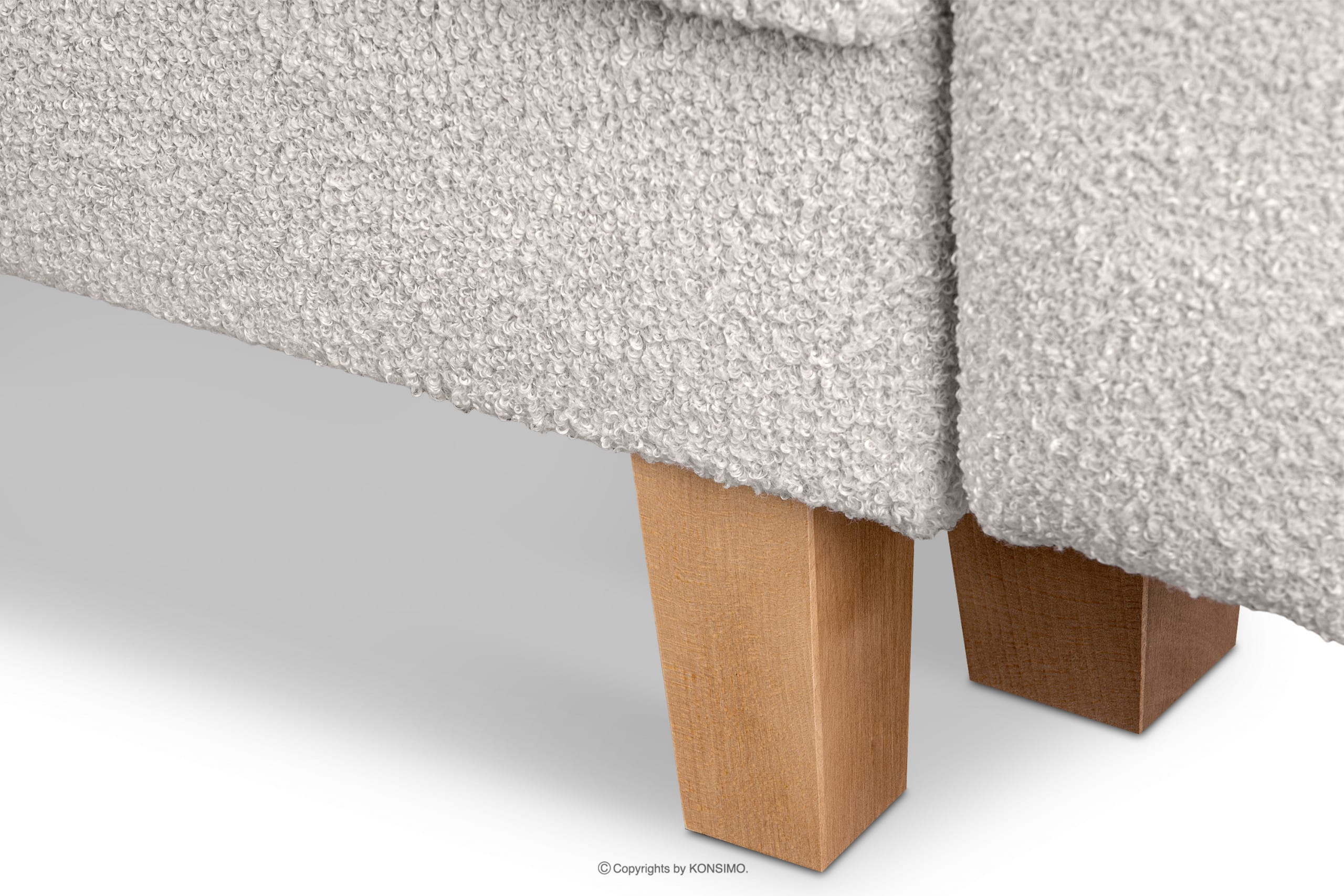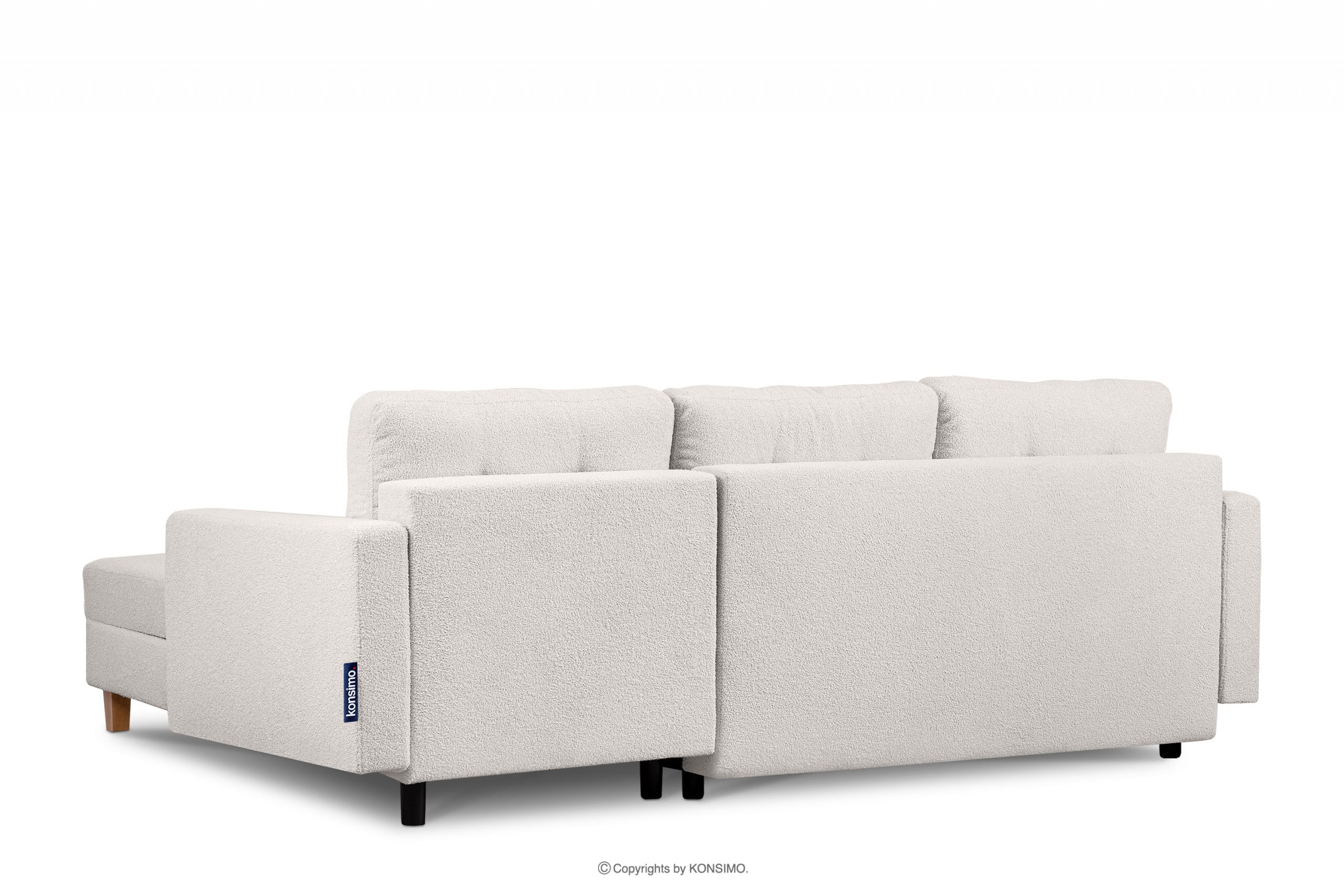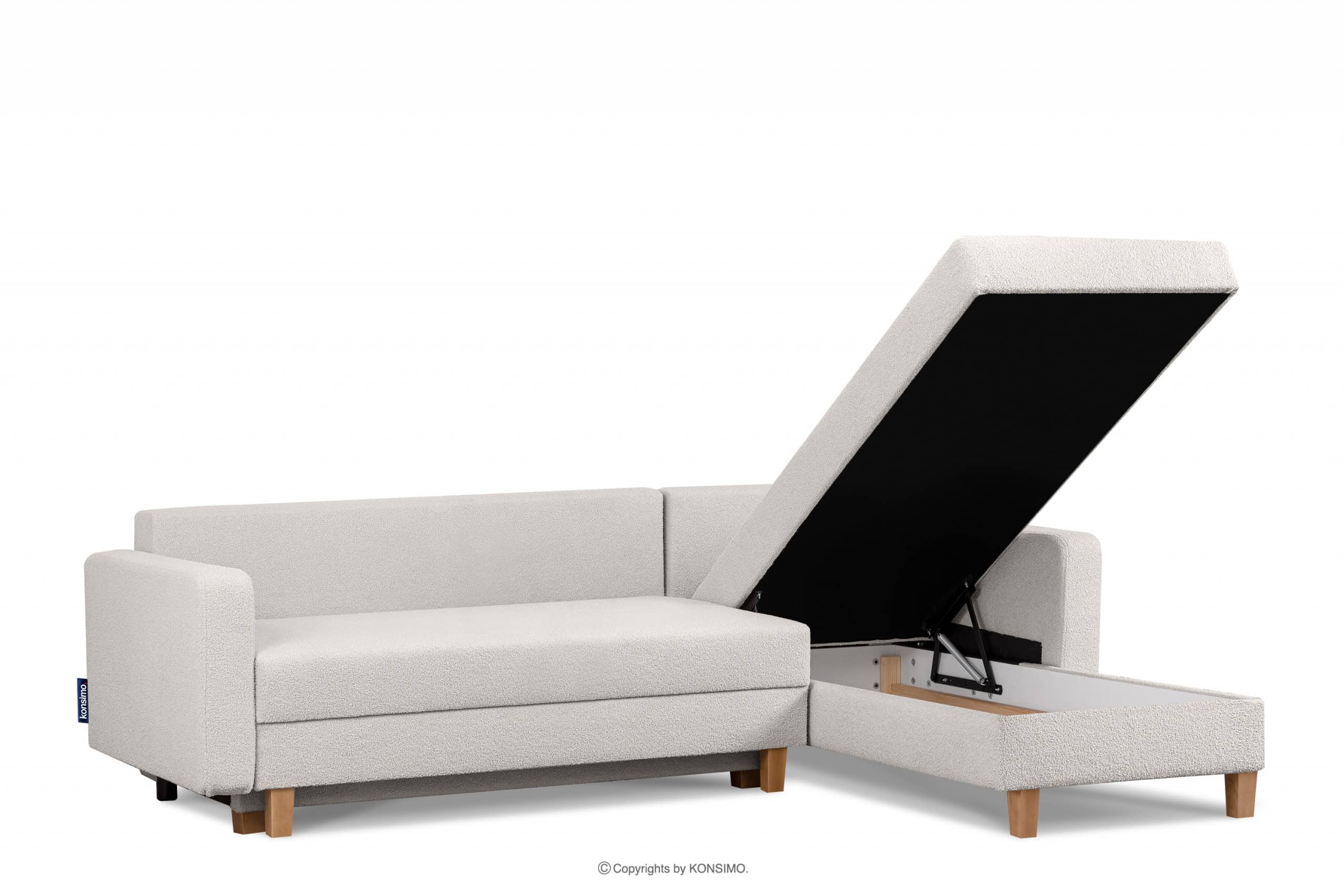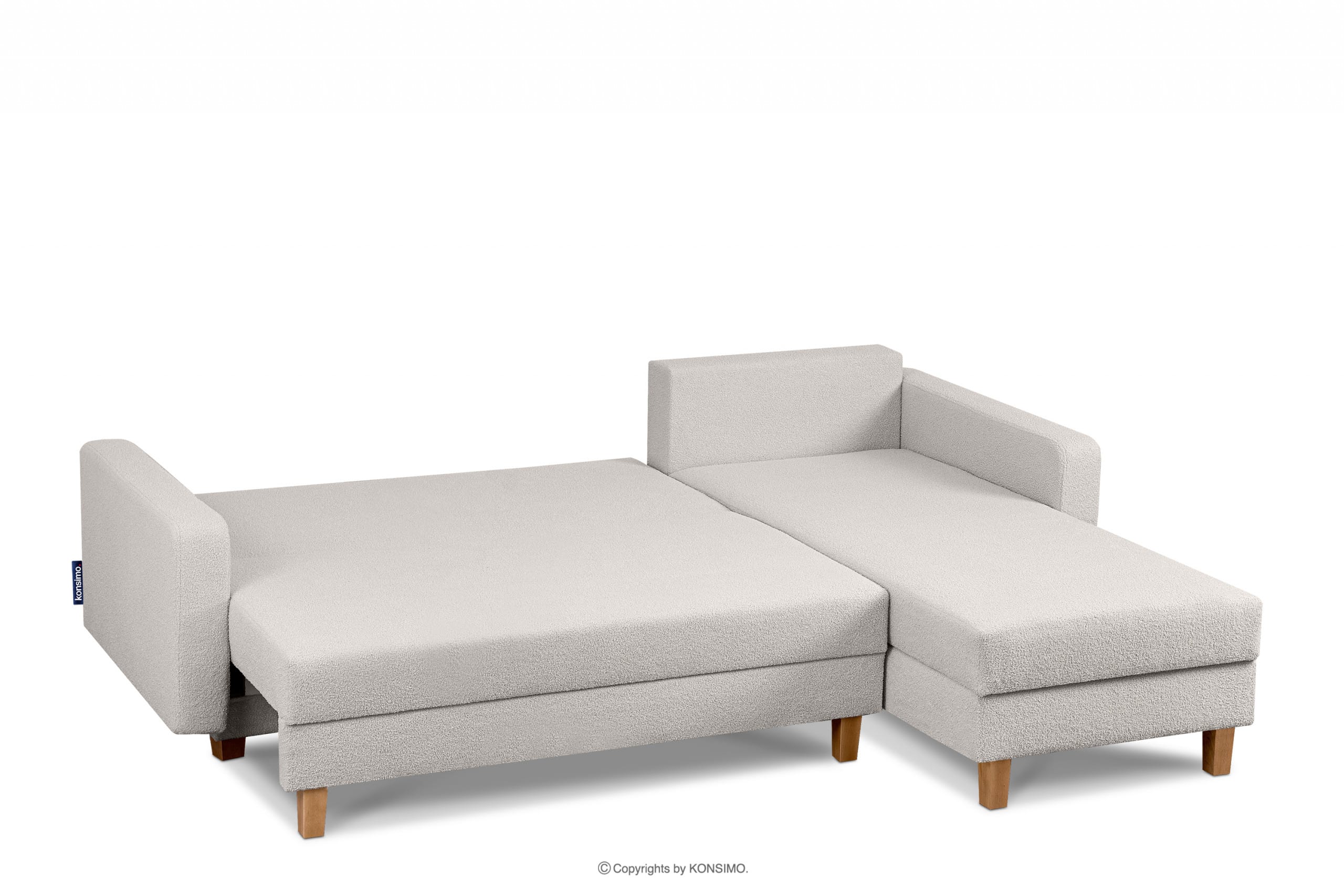 Der große Bettkasten mit Belüftungsschlitzen bietet Platz für alles, was tagsüber verstaut werden muss und nachts gebraucht wird. Das hochwertige Boucle-Gewebe zeichnet sich durch Abrieb- und Schadensbeständigkeit aus und ist zudem einfach sauber zu halten. Die Rücken- und Dekokissen haben Reißverschlüsse in den Tunneln, sodass die Bezüge leicht abgenommen und gewaschen werden können. Dieses funktionale skandinavische Ecksofa ist besonders bequem und praktisch - es eignet sich nicht nur für zu Hause, sondern auch für Hotels oder Wartezimmer.