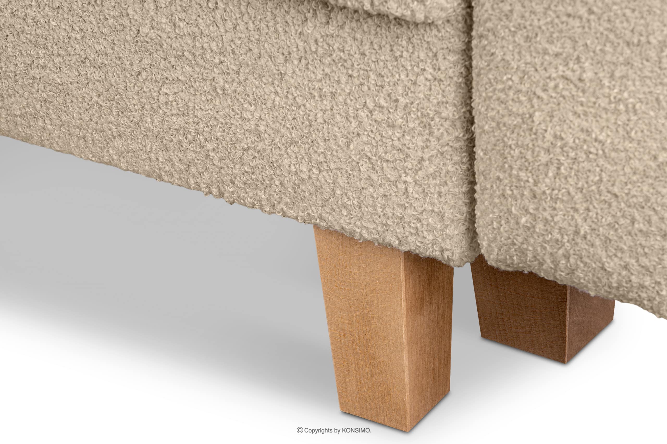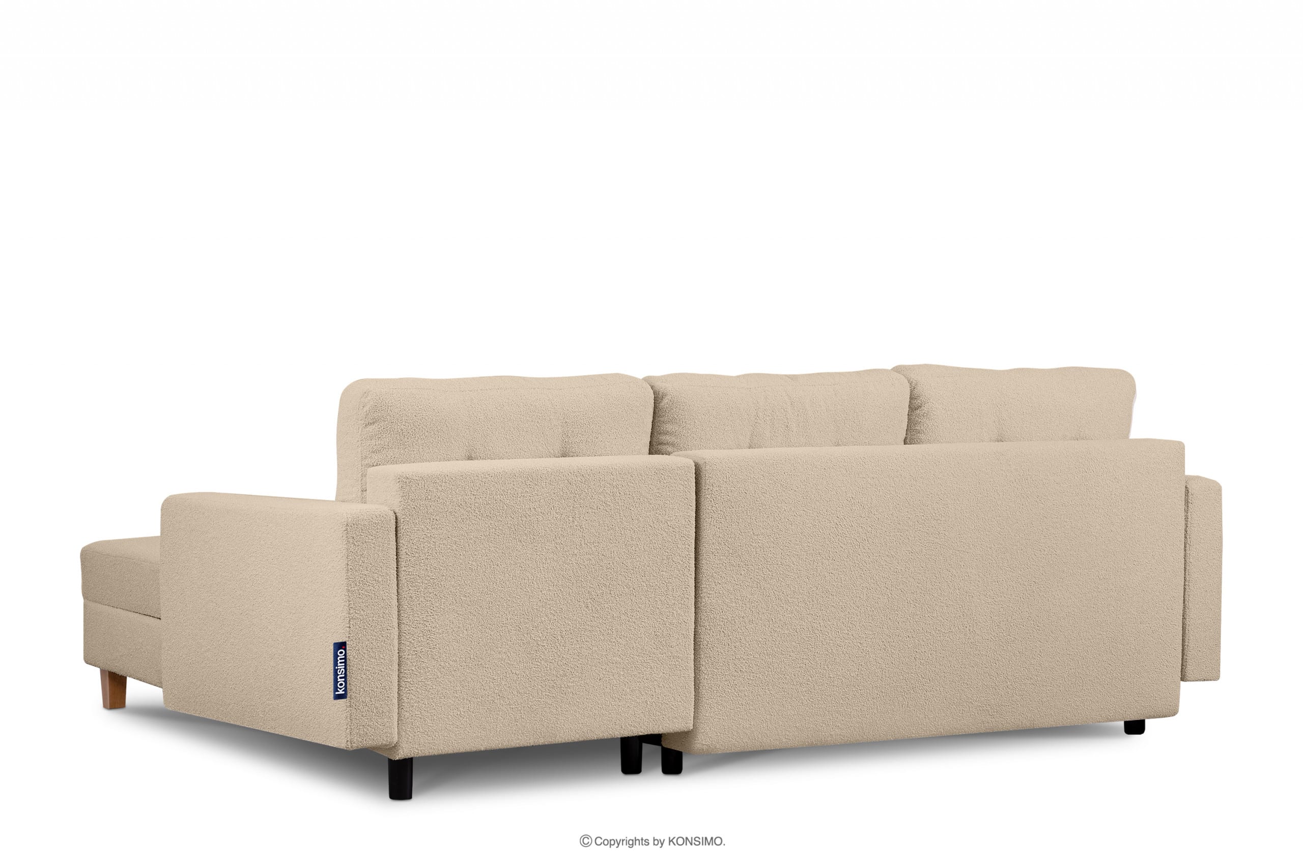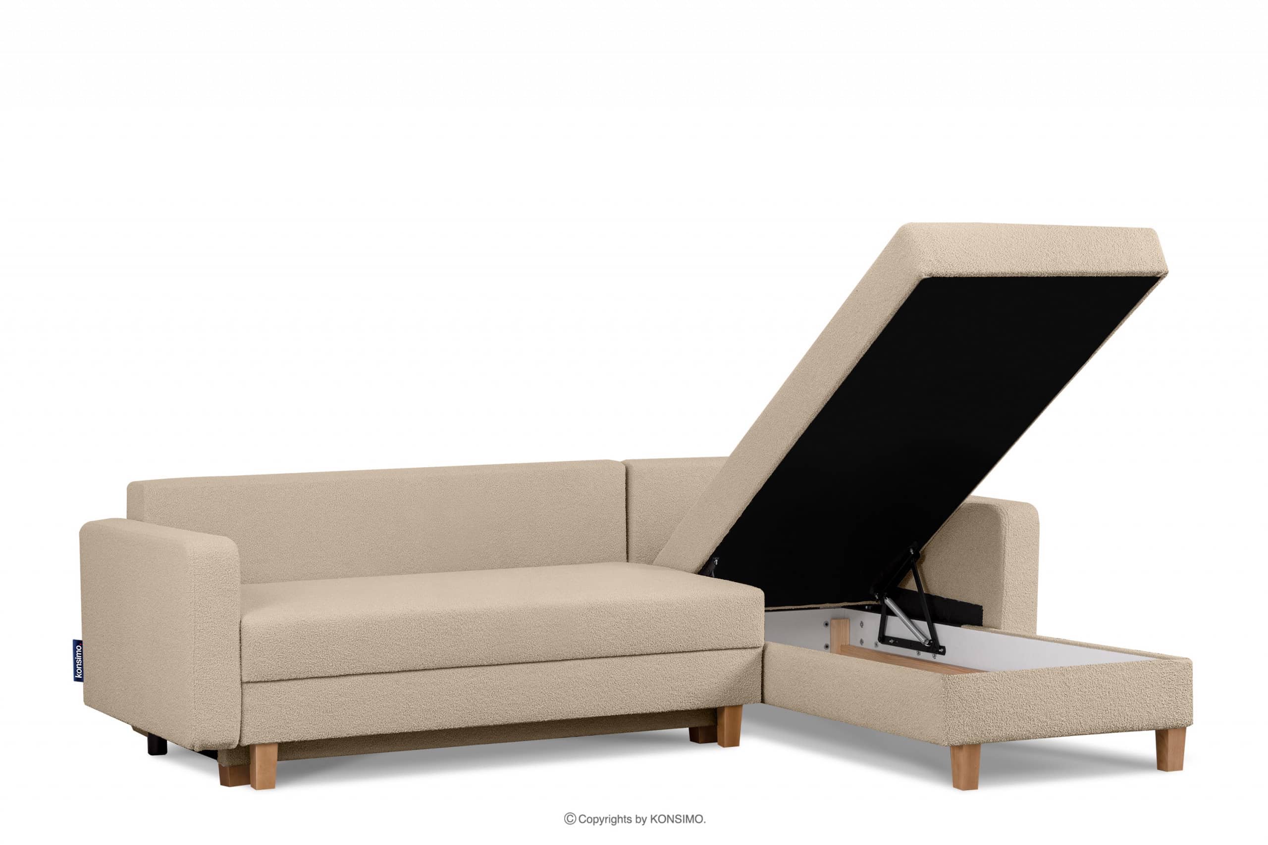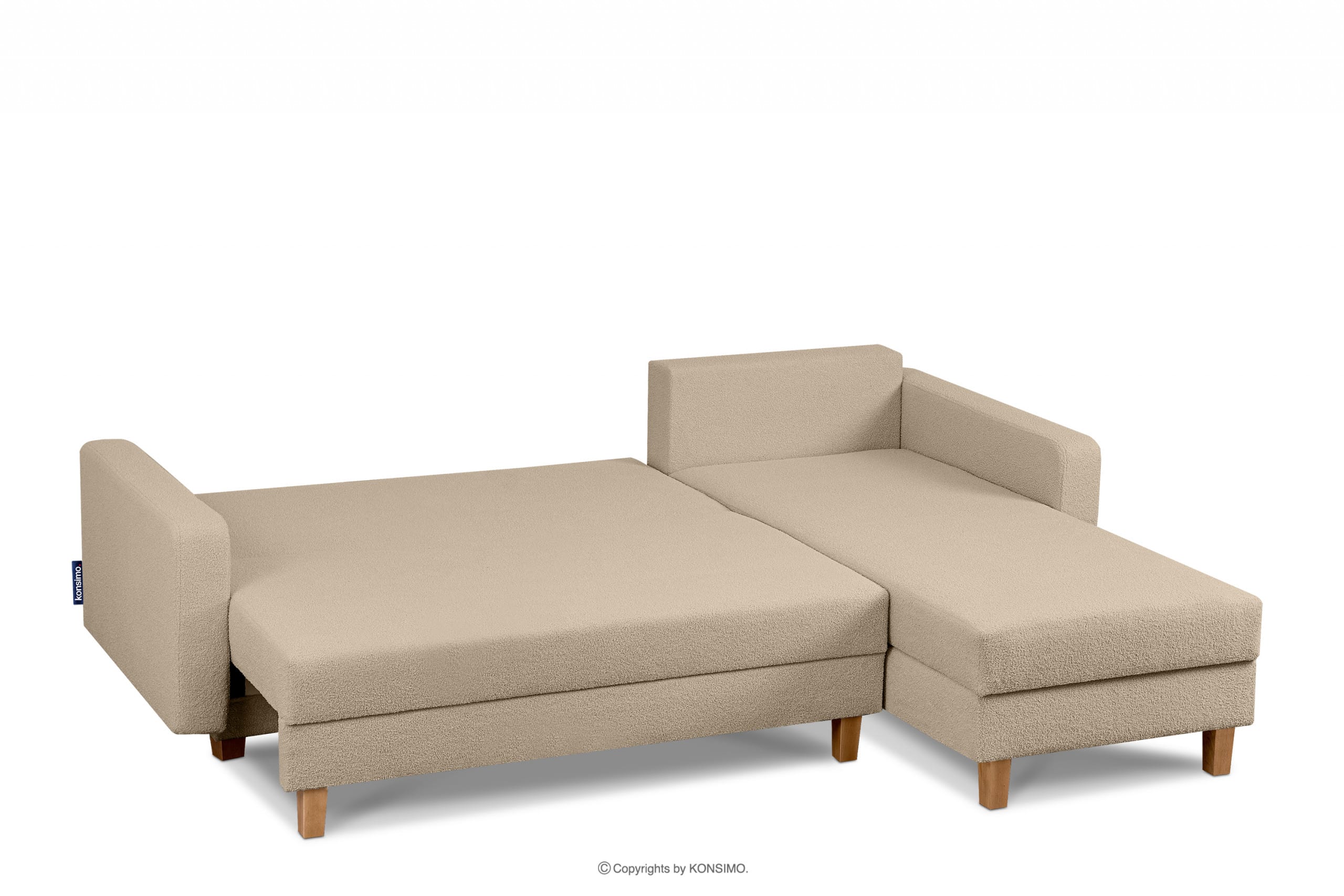 Hergestellt aus hochwertigen Materialien, mit einer starken und stabilen Konstruktion, bietet die Ecksofa in hellem beigen Bouclé im skandinavischen Stil den Bewohnern und Gästen einen komfortablen Rückzugsort. Dank des automatischen DL-Mechanismus bietet es auch eine Schlafmöglichkeit - eine ausgezeichnete Lösung nicht nur für Gäste. Es eignet sich auch hervorragend für kleine Wohnungen, in denen das Sofa als Bett dient.