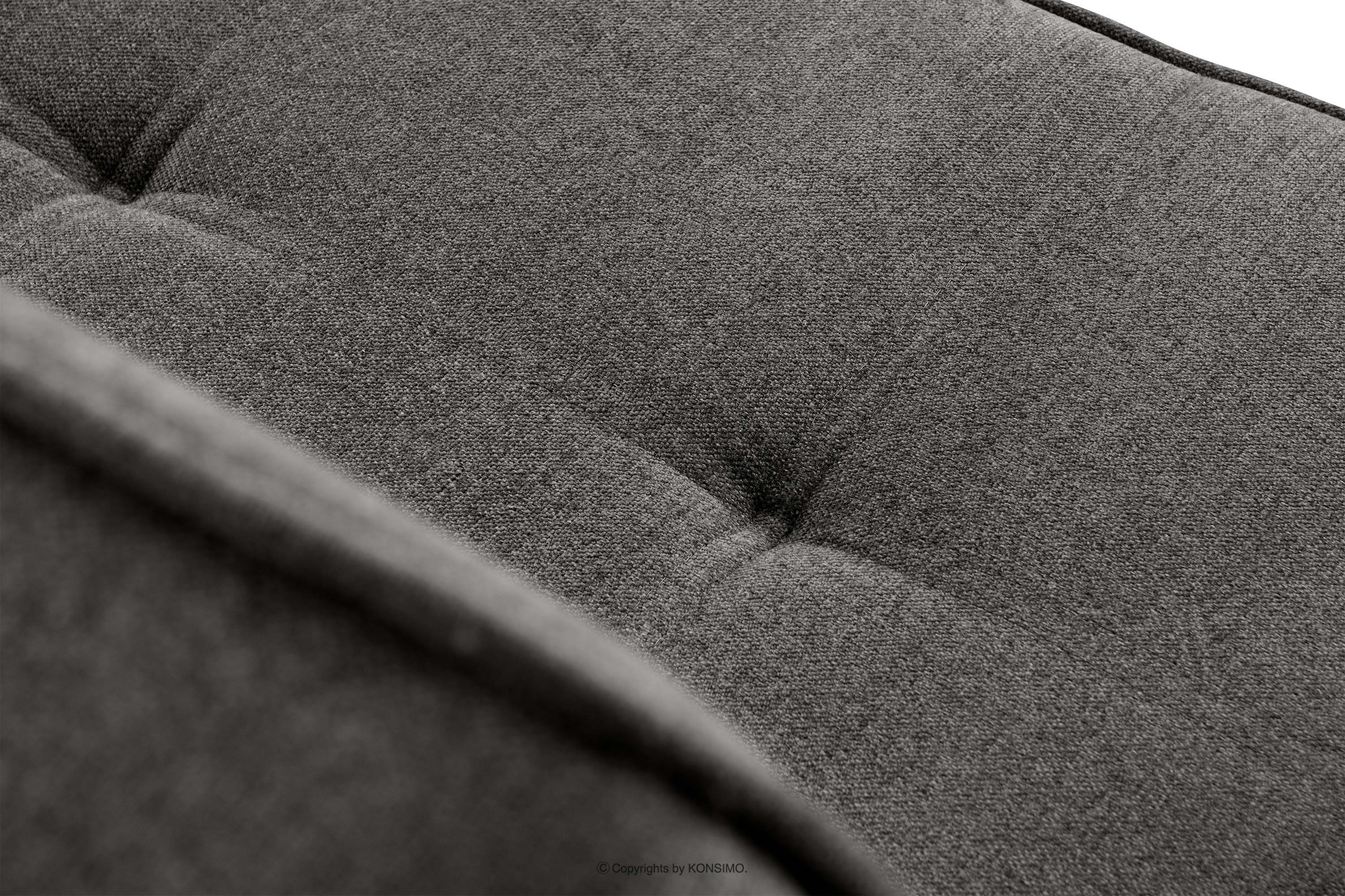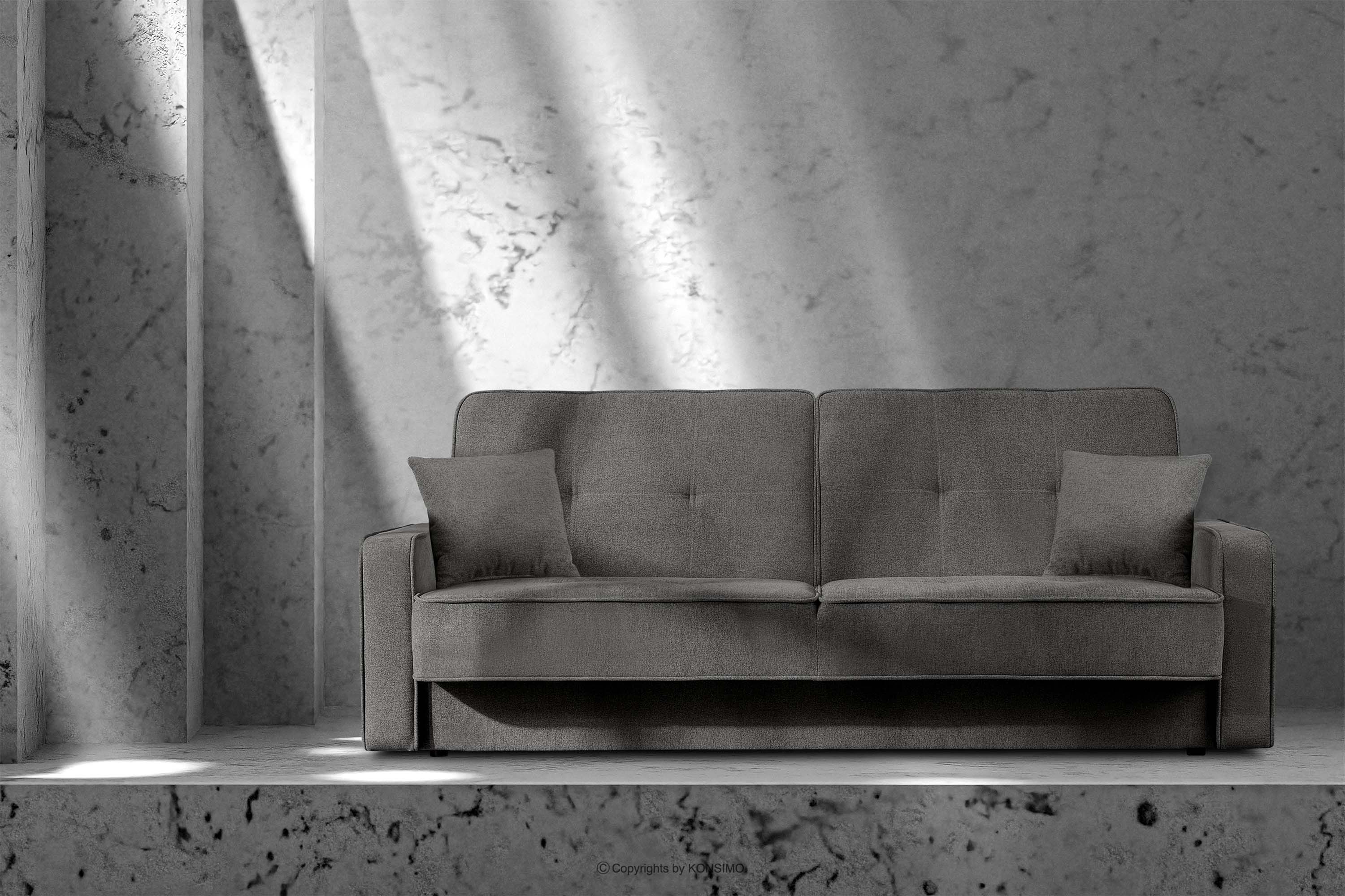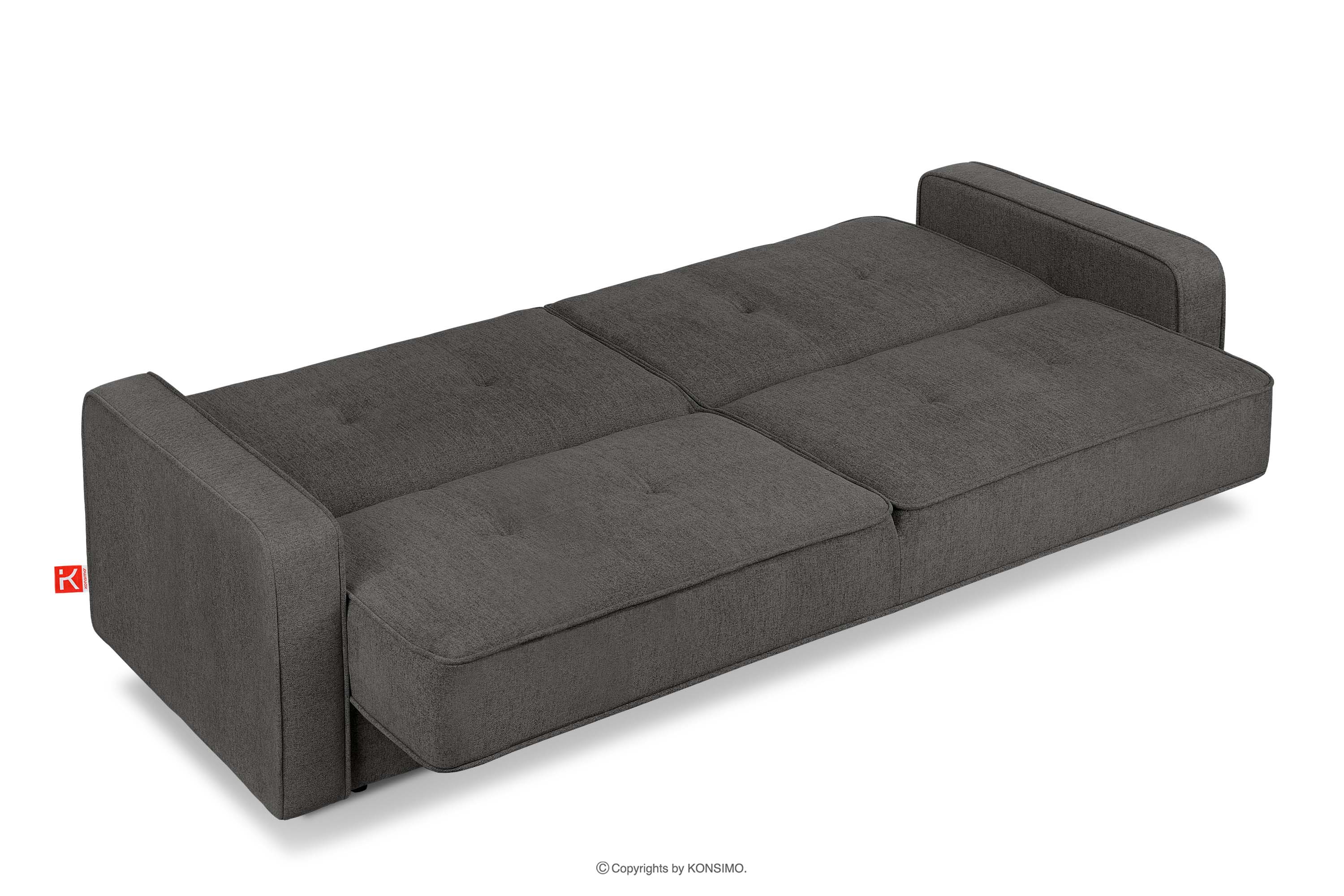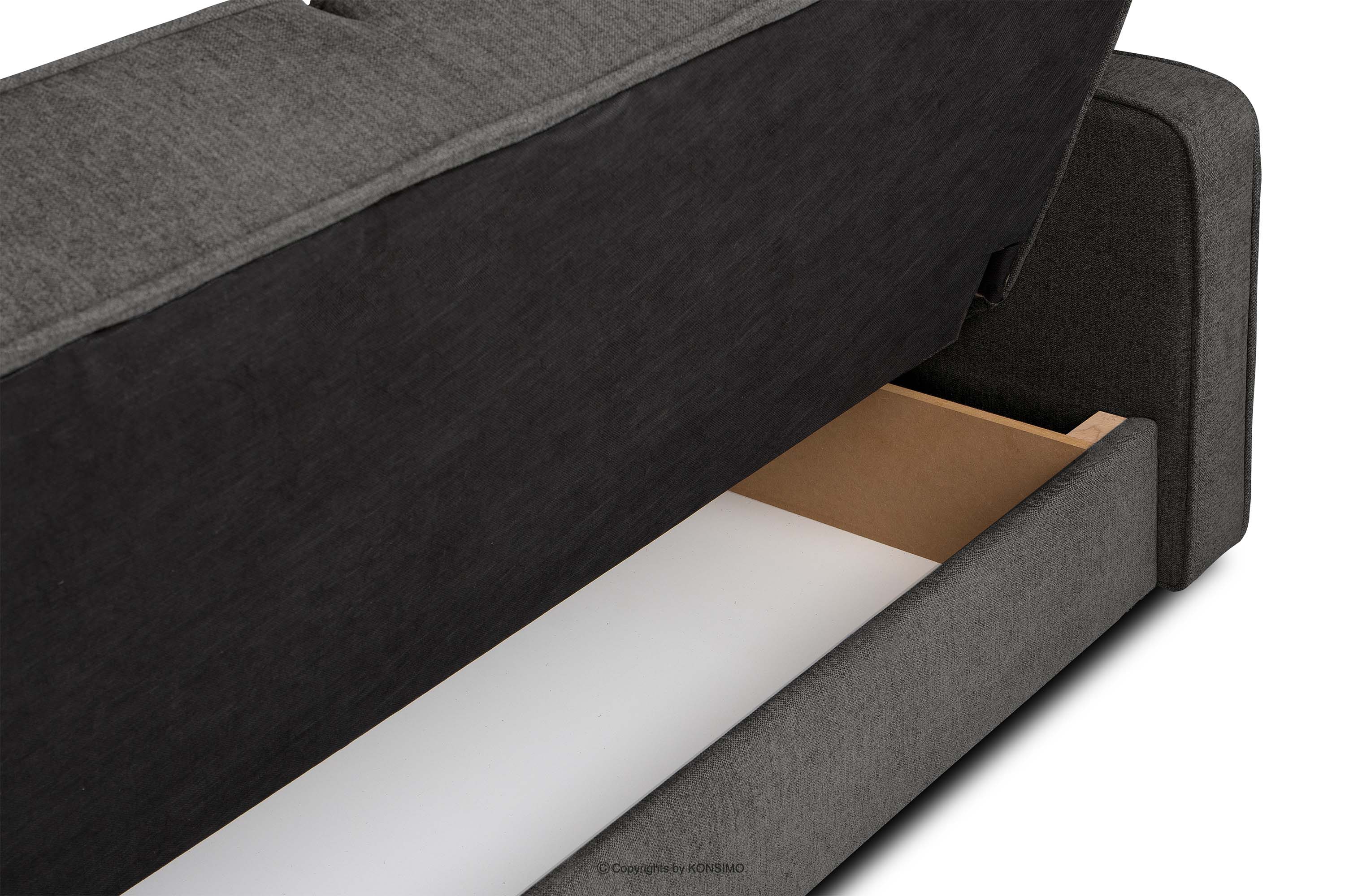 Das Schlafsofa für das Wohnzimmer aus graphitfarbenem Gewebestoff wird tagsüber zu einem funktionalen Sofa für die ganze Familie und nachts zu einem großen und bequemen Bett. Der praktische Mechanismus der Schlaffunktion - das automatische Schlafsofa - erleichtert das Auf- und Zusammenklappen dieses modernen Sofas erheblich. Es ist mit einem geräumigen Bettzeugbehälter ausgestattet.