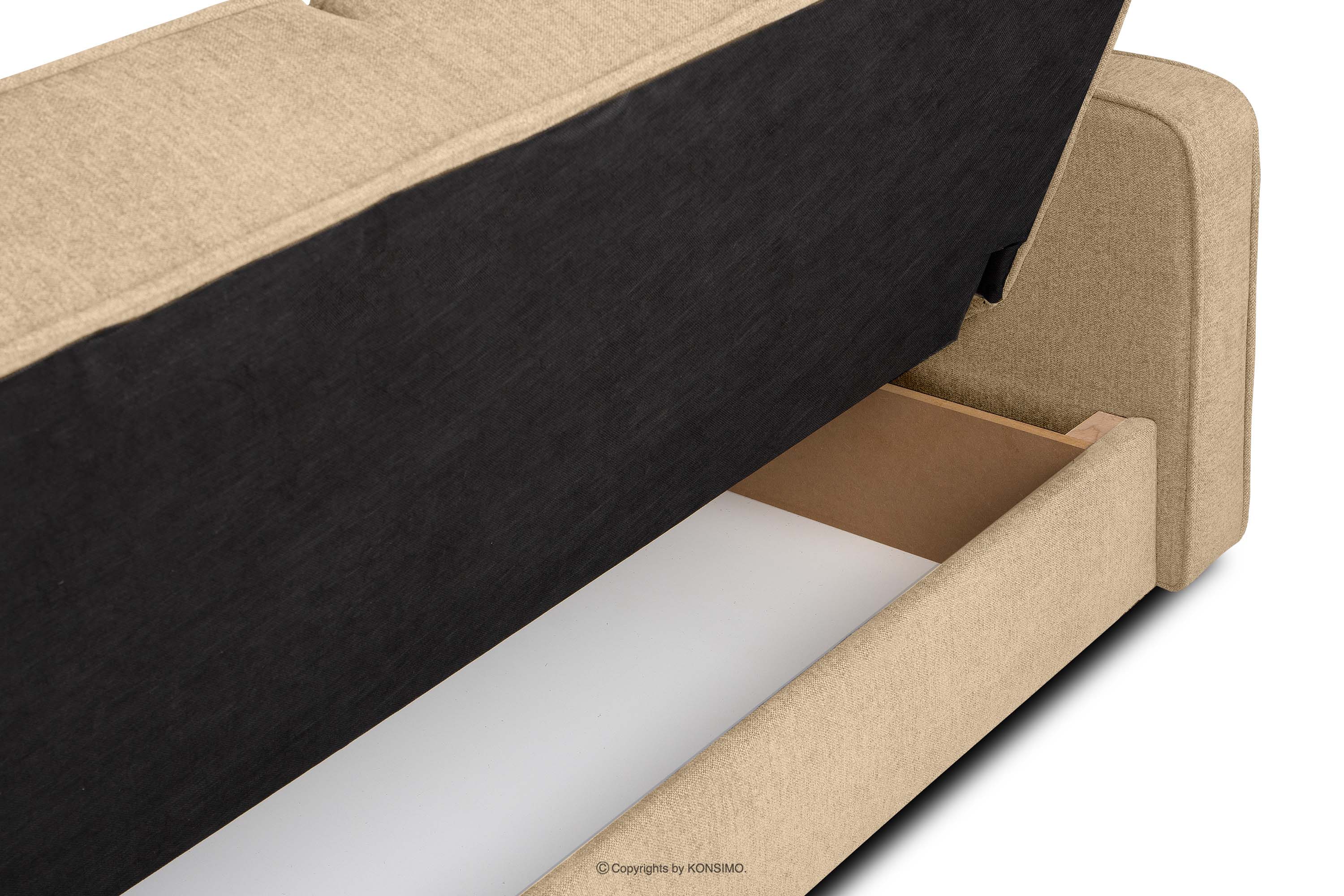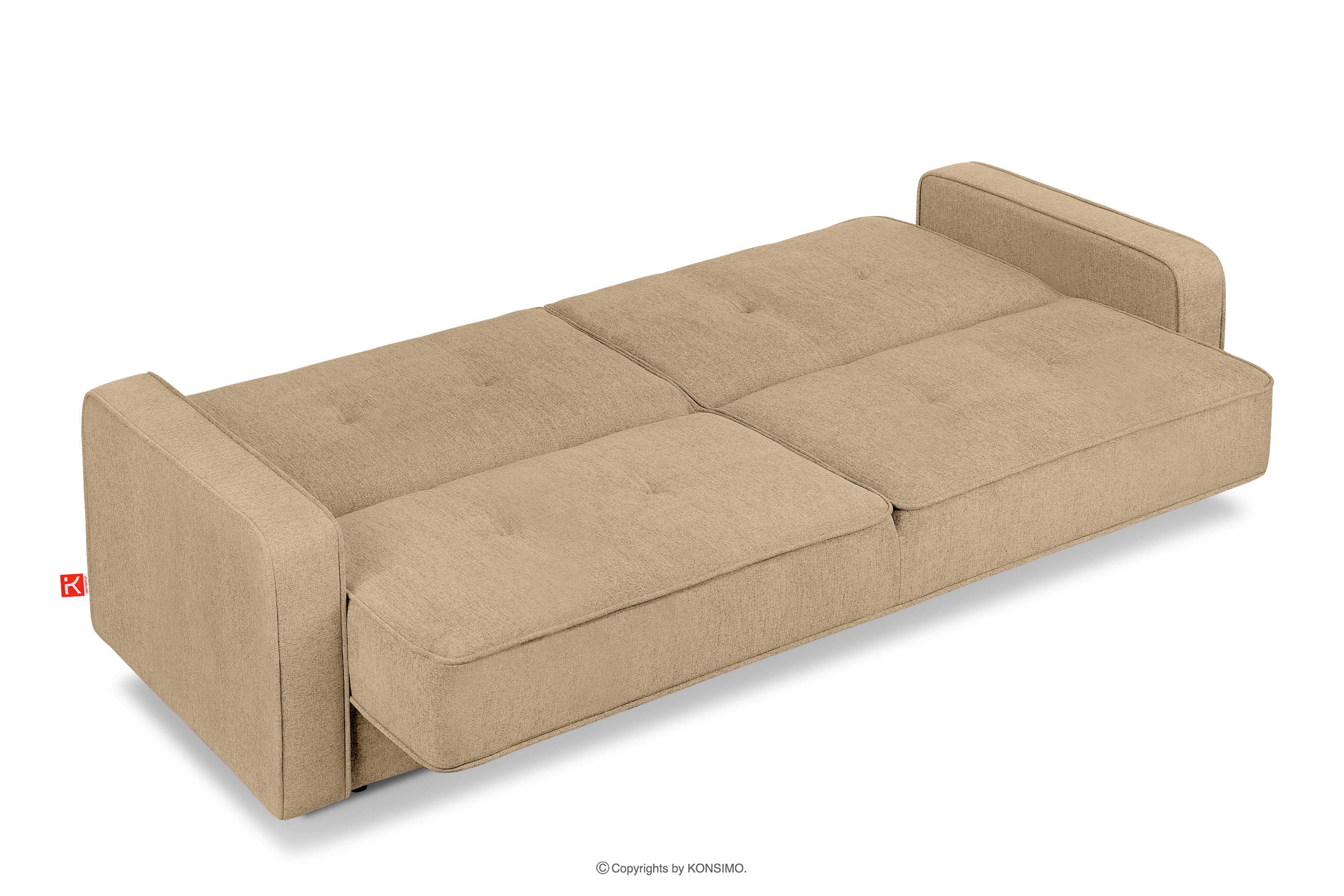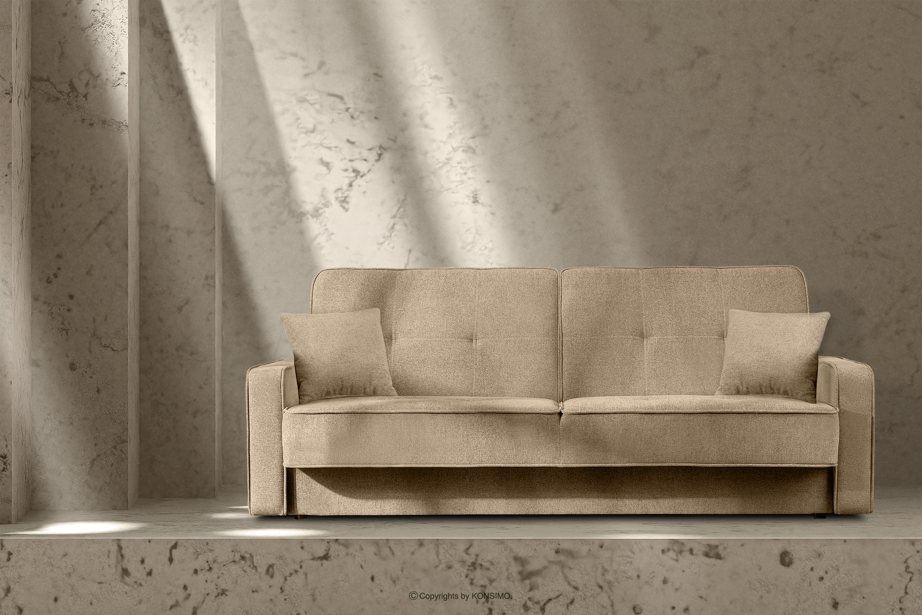 Das ausklappbare Wohnzimmersofa in cremefarbenem Karostoff wird tagsüber zu einem funktionalen Sofa für die ganze Familie und nachts zu einem großen und bequemen Bett. Der praktische Mechanismus der Schlaffunktion - das automatische Schlafsofa - erleichtert das Auf- und Zusammenklappen dieses modernen Sofas erheblich. Es ist mit einem geräumigen Bettzeugbehälter ausgestattet. Der hochwertige, griffsympathische Stoff mit dekorativer Steppung ist nicht nur abriebfest, sondern auch leicht sauber zu halten.