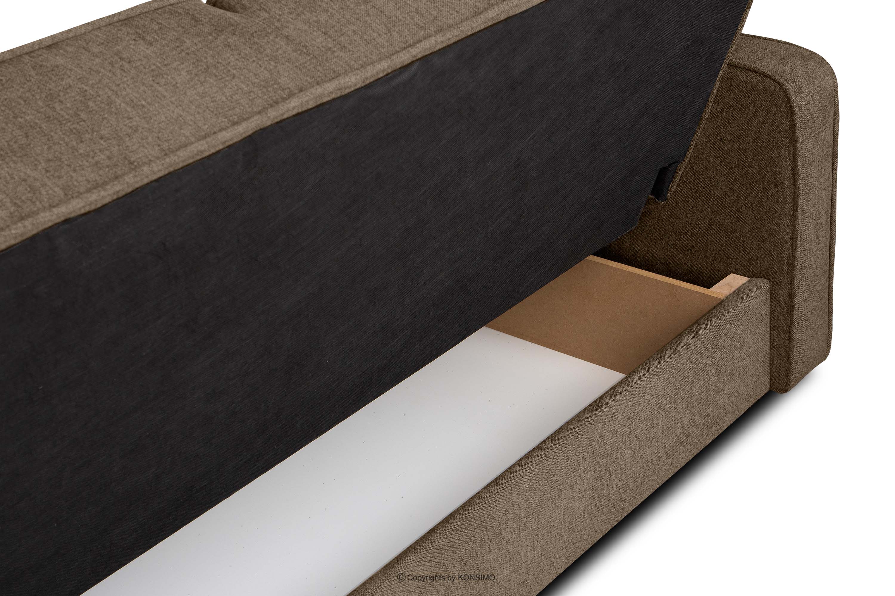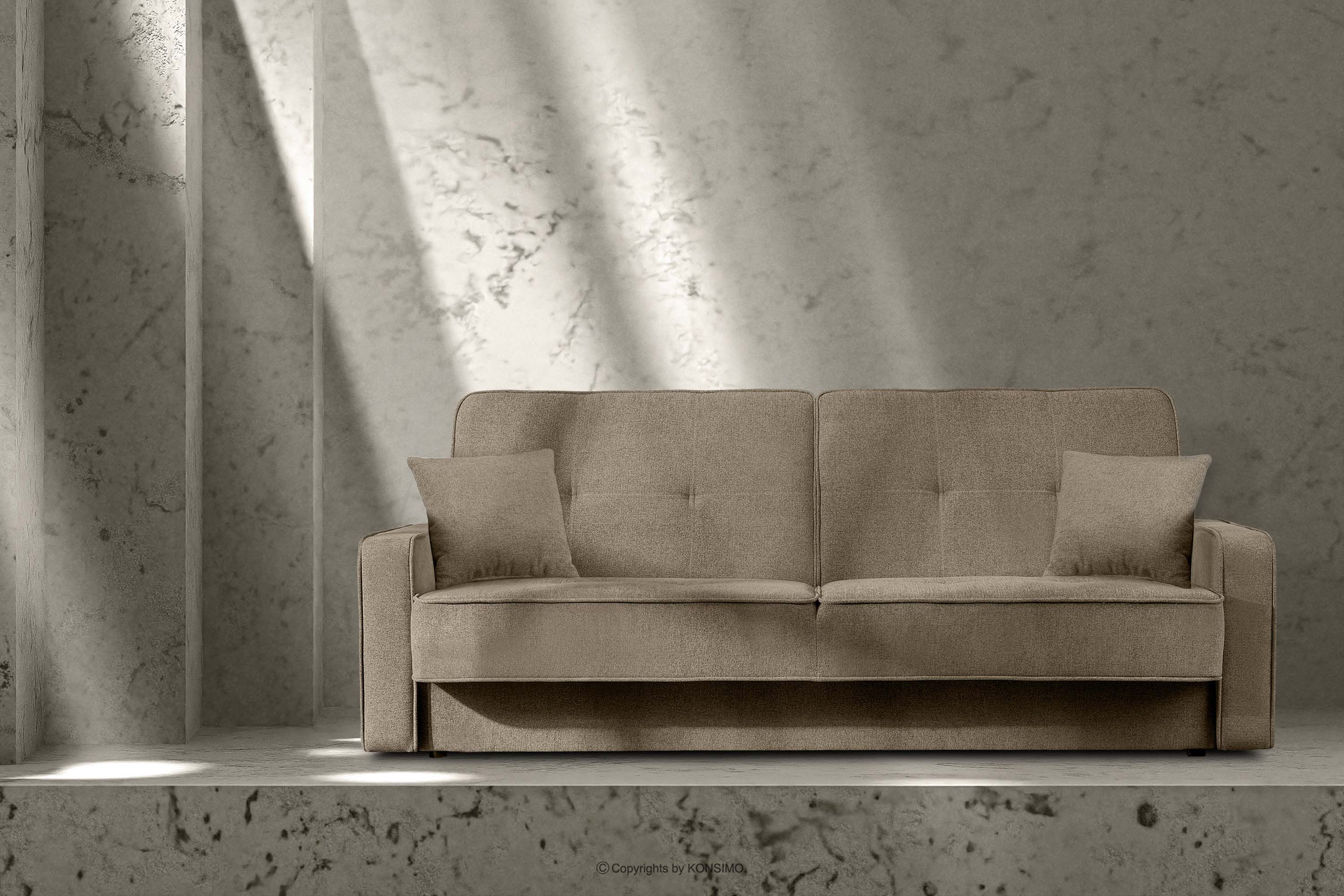 Das ausklappbare Wohnzimmersofa aus kariertem Stoff in Braun wird tagsüber zum Funktionssofa für die ganze Familie und nachts zum großen und bequemen Bett. Der praktische Mechanismus der Schlaffunktion - die Schlafsofa-Automatik - erleichtert das Auf- und Zusammenklappen dieses modernen Sofas erheblich. Es ist mit einem geräumigen Bettzeugbehälter ausgestattet. Der hochwertige, griffsympathische Stoff mit dekorativer Steppung ist nicht nur abriebfest, sondern auch leicht sauber zu halten.