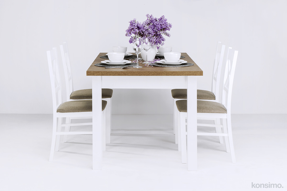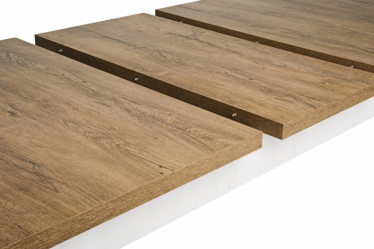 Der unkonventionelle, elegante und gleichzeitig äußerst praktische Tisch aus der LEMAS-Kollektion eignet sich perfekt für kleine und große Esszimmer, Küchen oder Wohnzimmer. Die solide, langlebige Tischplatte aus melaminbeschichteter Spanplatte hält mühelos auch sehr schwerem Gewicht stand. Die schlichten Beine mit klassischer Form gewährleisten Stabilität der Konstruktion. Wenn Gäste zum Abendessen kommen, vergrößert sich der Tisch und bietet Platz für bis zu acht Personen.