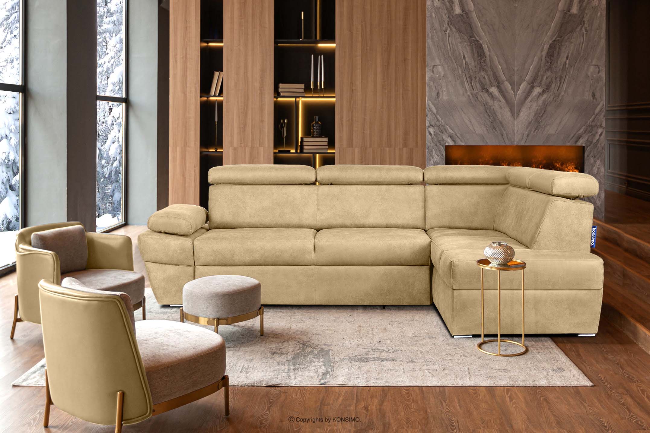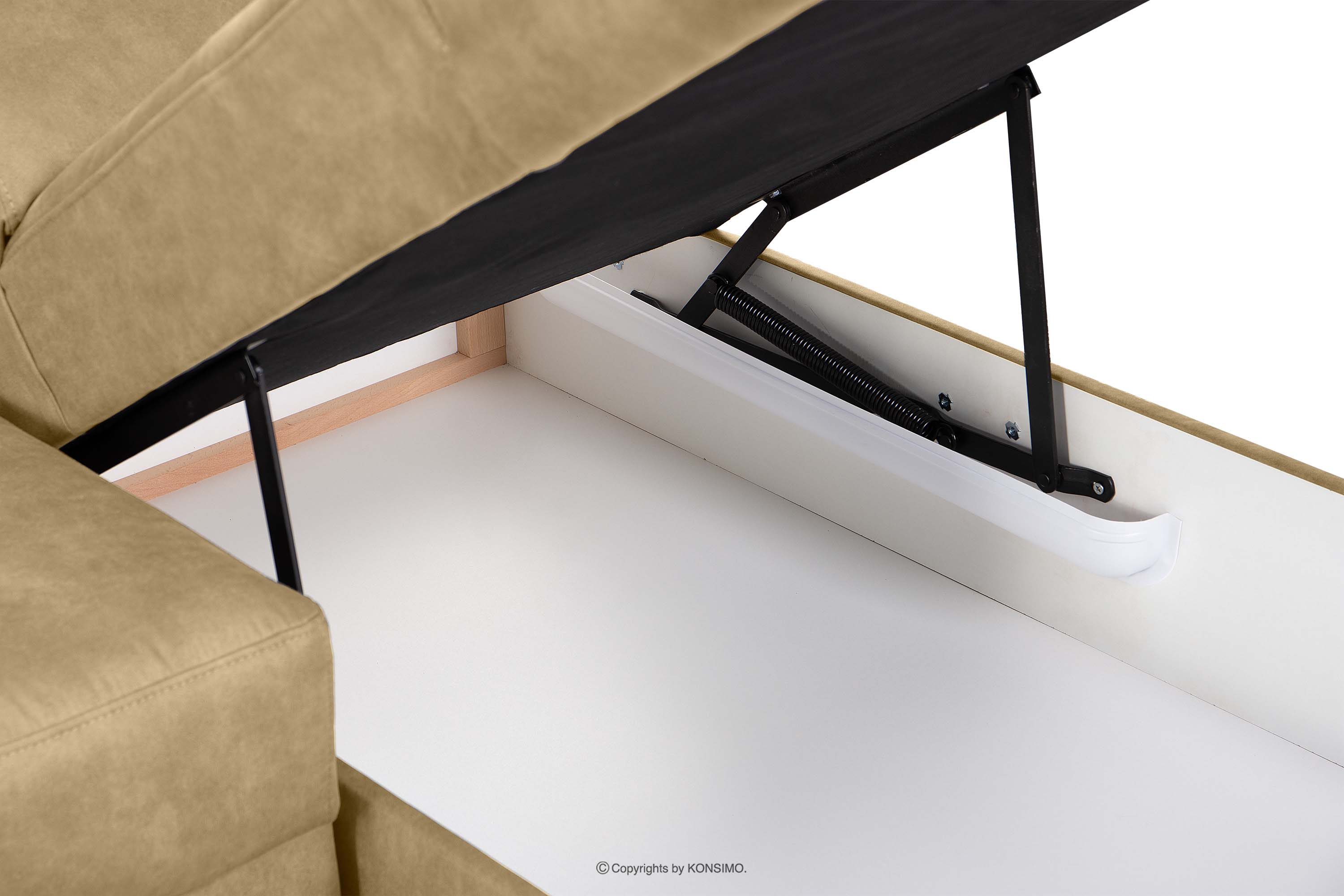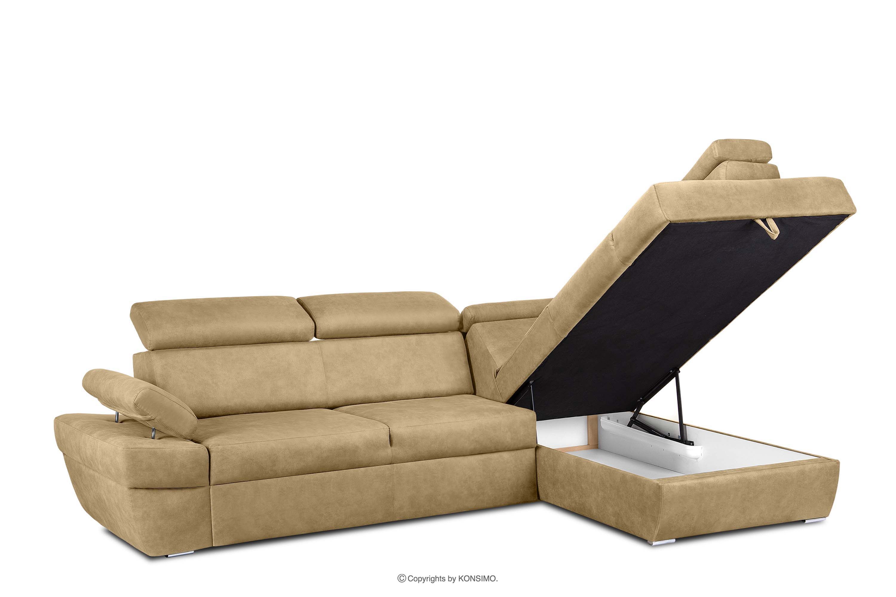 Das Ecksofa mit Schlaffunktion aus sandfarbenem lederähnlichem Stoff right aus der modernen Kollektion RATLO ist ein Vorschlag für Anspruchsvolle: langlebig, pflegeleicht, aus robusten und langlebigen Materialien gefertigt. Leicht ausklappbar und mit einer großen Truhe ausgestattet, ist es perfekt für kleine Wohnungen. Die Polsterung aus lederähnlichem Stoff ist extrem abriebfest und widerstandsfähig.