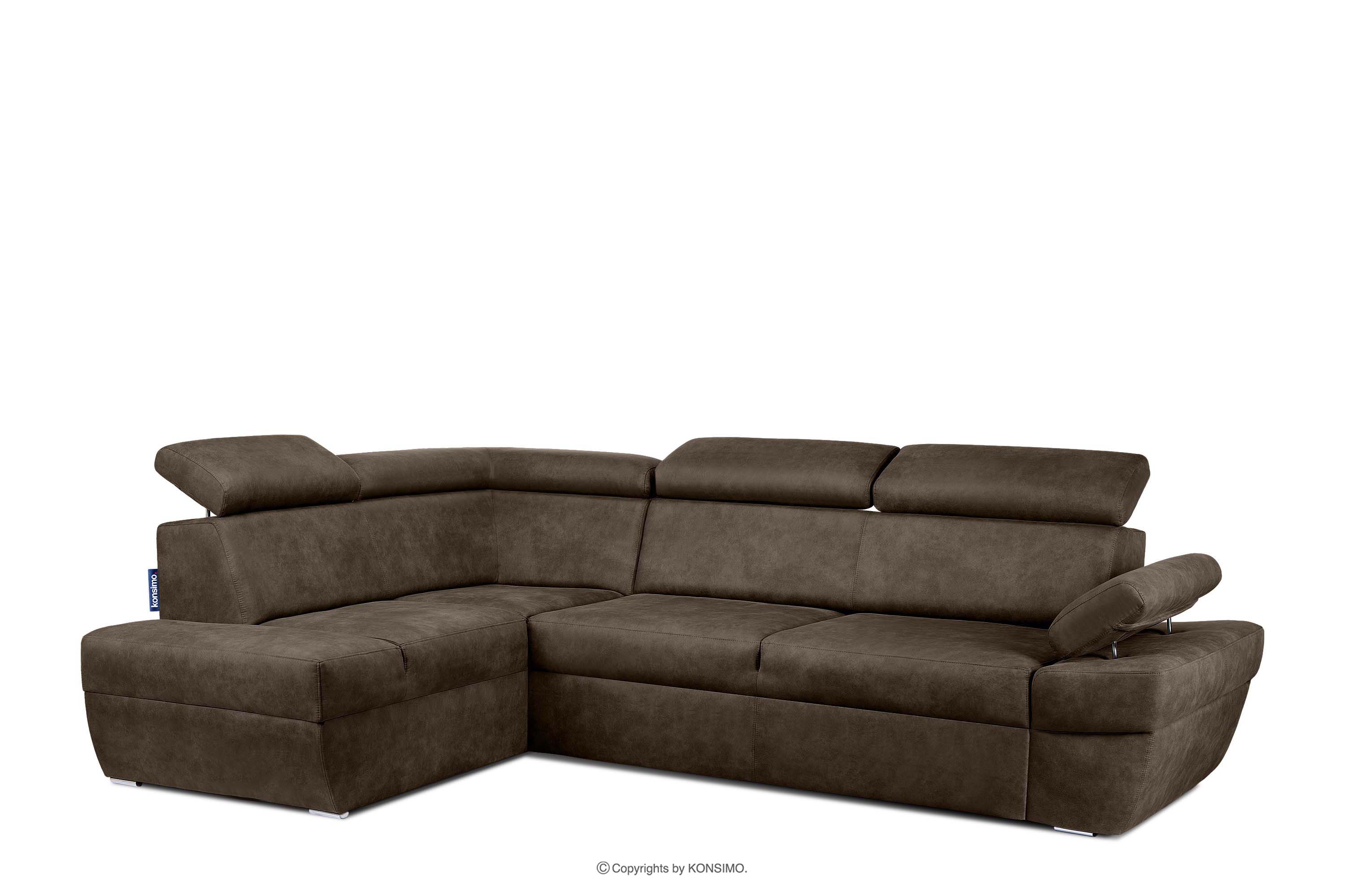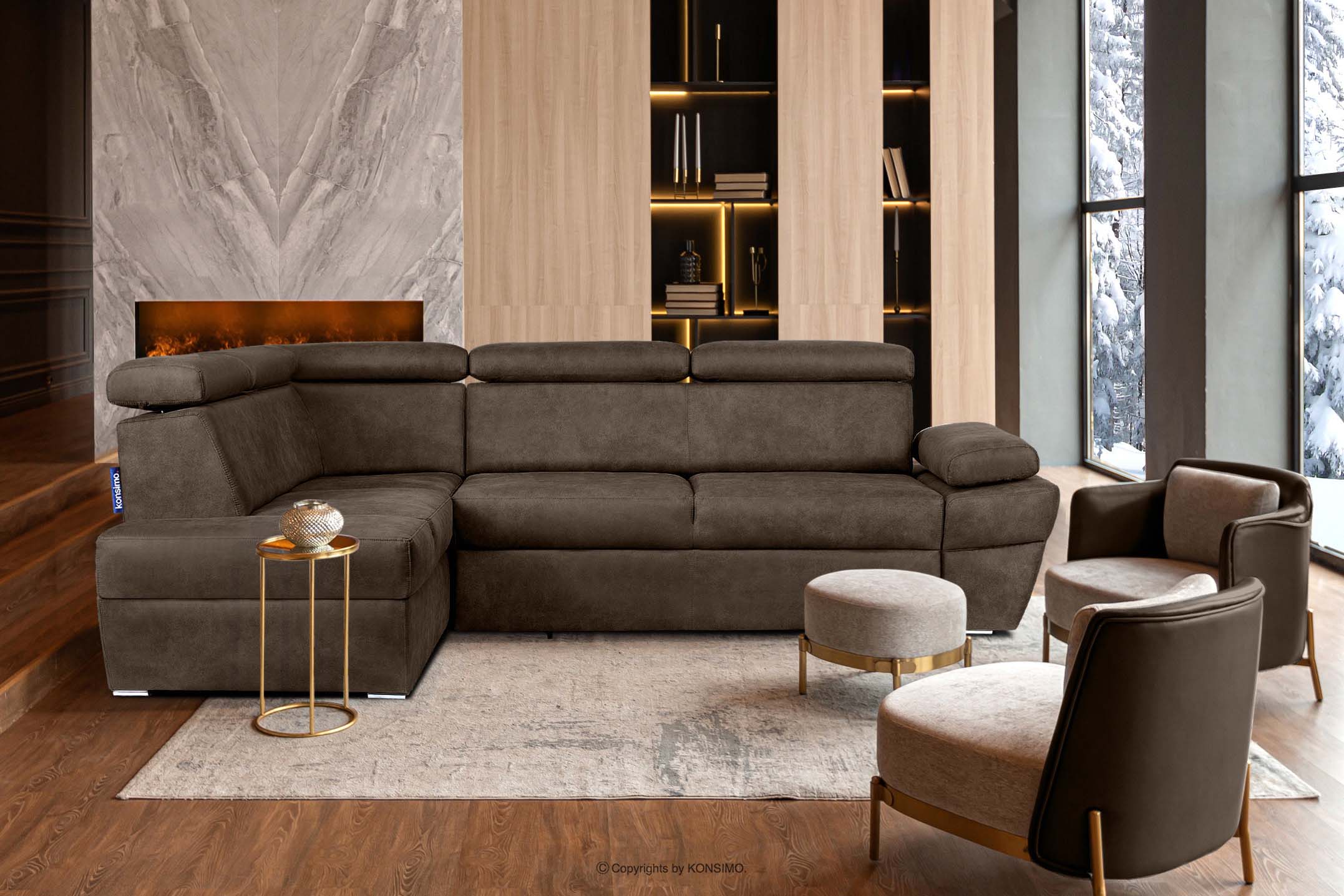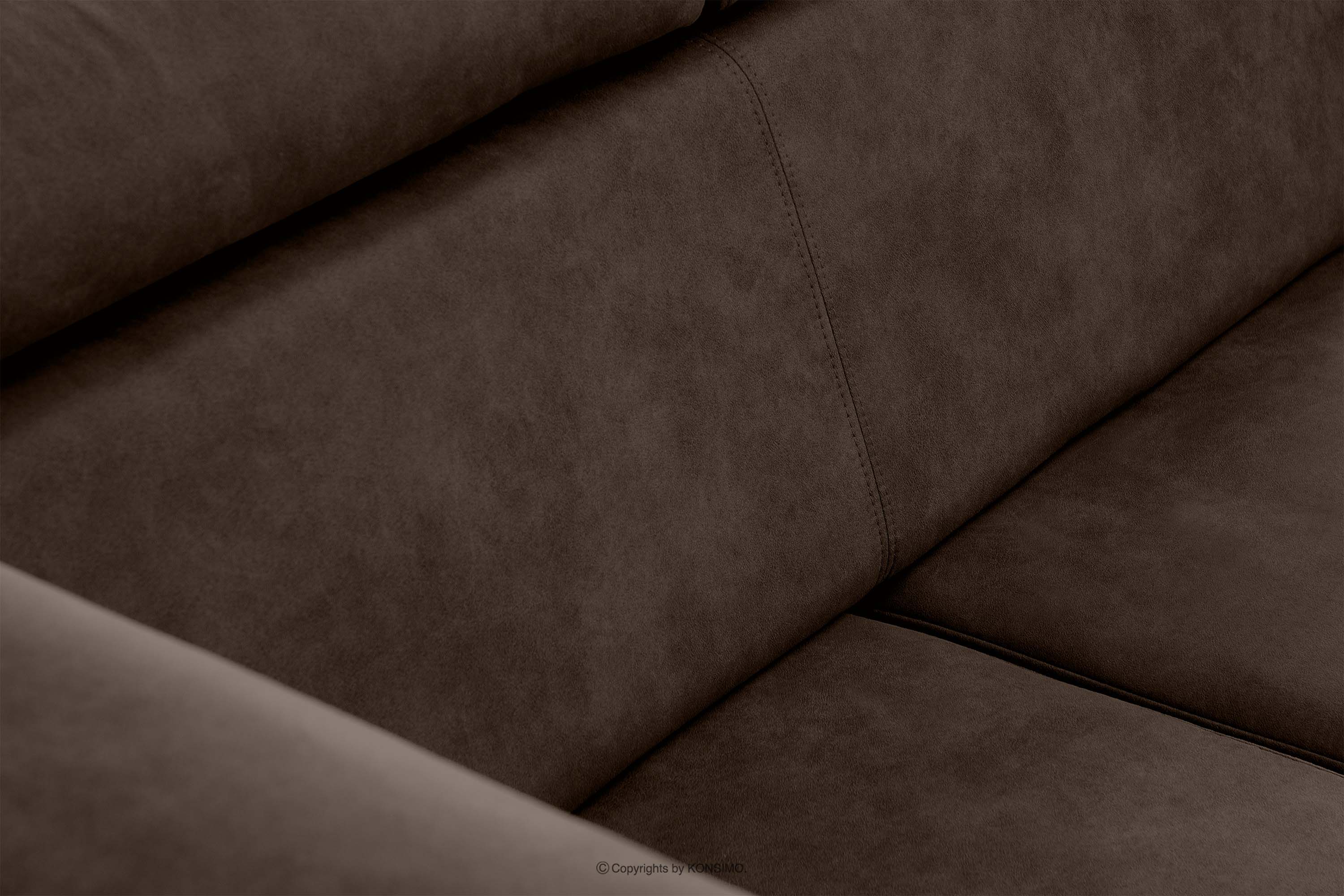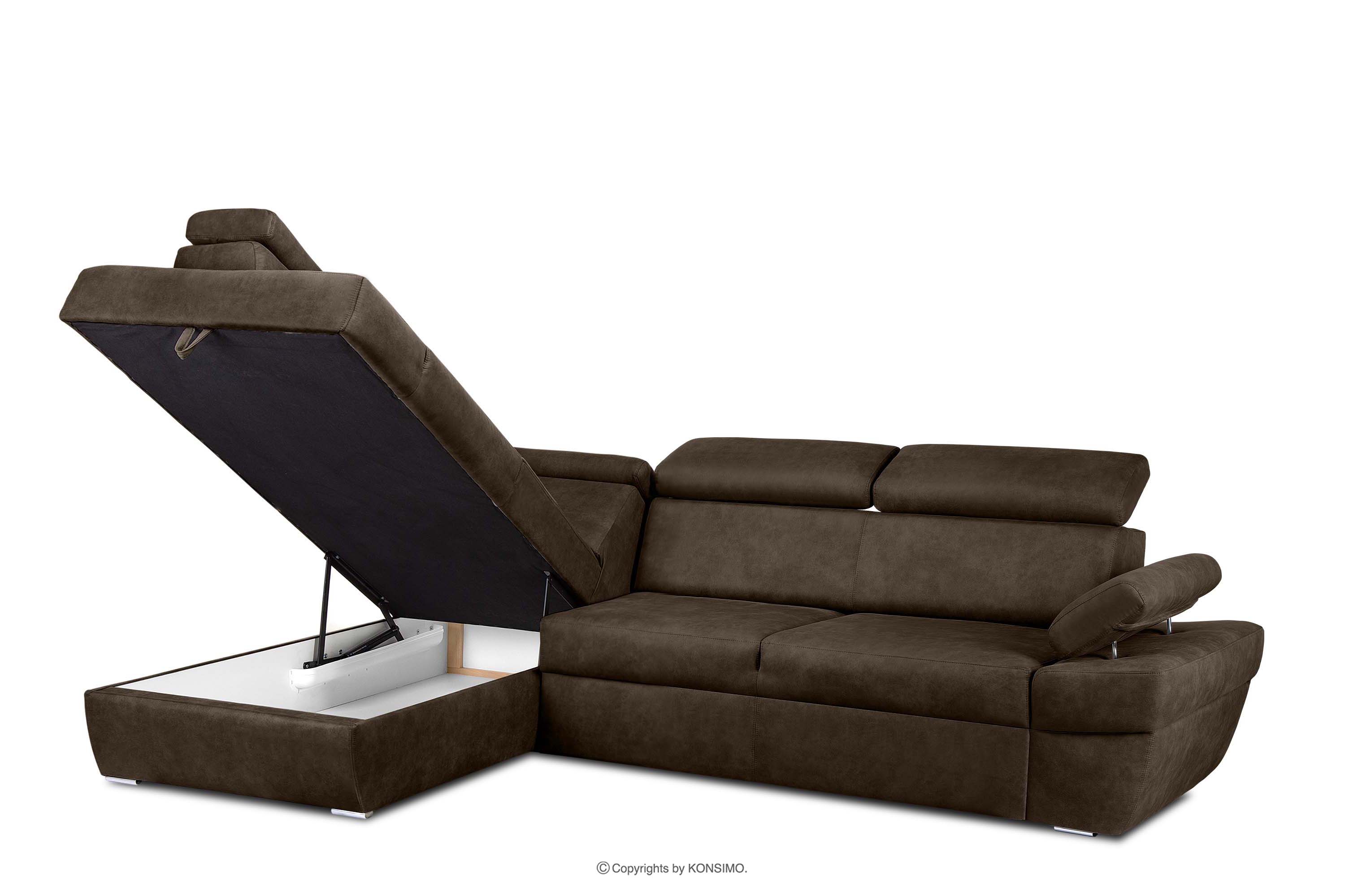 Das Ecksofa mit Schlaffunktion aus lederähnlichem Stoff in Dunkelbraun links aus der modernen Kollektion RATLO ist ein Vorschlag für Anspruchsvolle: langlebig, pflegeleicht, aus robusten und langlebigen Materialien gefertigt. Leicht aufklappbar und mit einer großen Truhe ausgestattet, ist es perfekt für kleine Wohnungen. Der lederähnliche Stoffbezug ist extrem widerstandsfähig gegen Abrieb und Beschädigungen.
