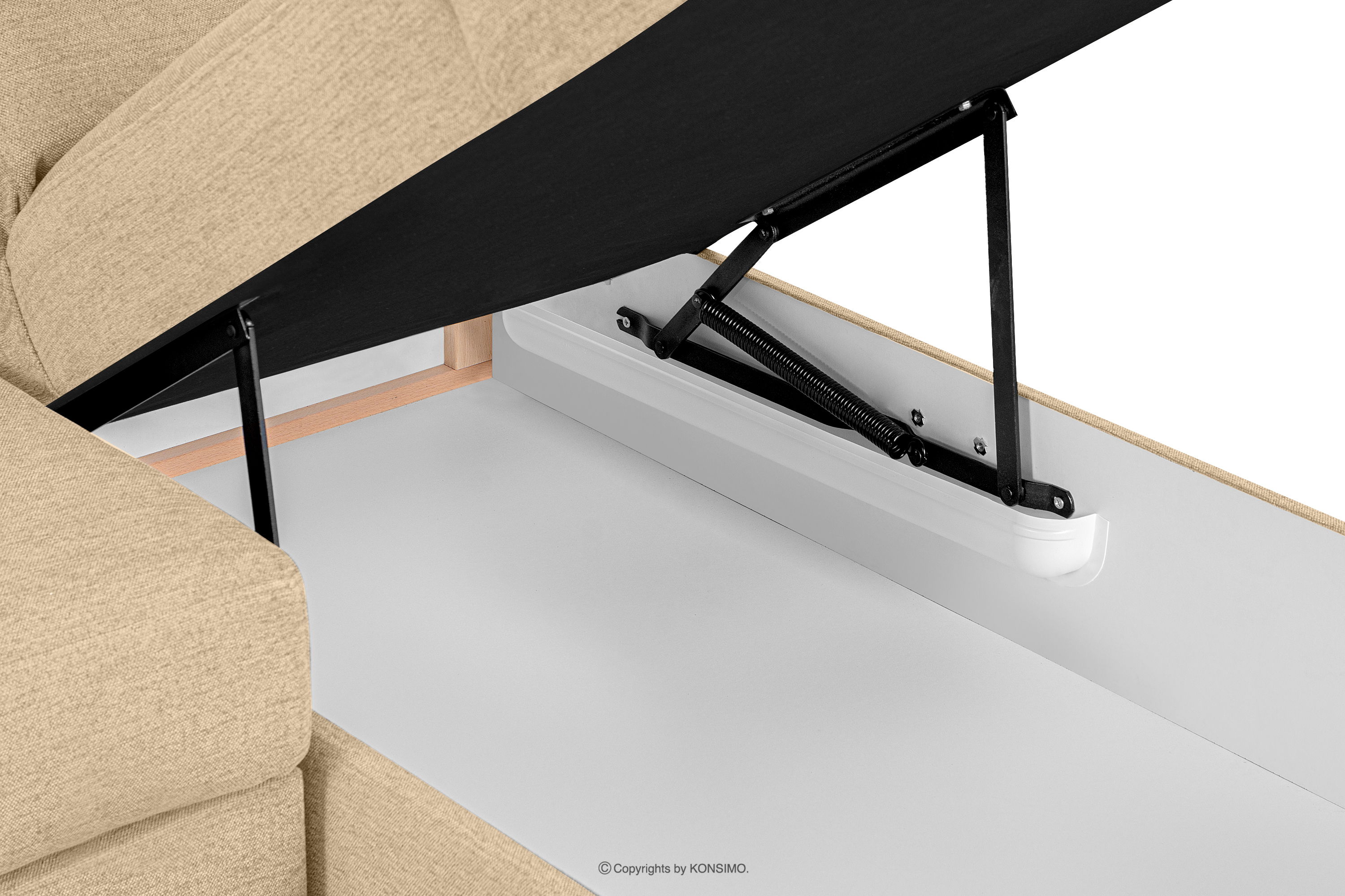 Strapazierfähiges, pflegeleichtes Ecksofa mit Schlaffunktion und Bettkasten ecru links, aus soliden und langlebigen Materialien, aus der Kollektion moderner Möbel RATLO ist ein Vorschlag für Anspruchsvolle. Leicht aufklappbar und mit einer großen Truhe ausgestattet, ist es perfekt für kleine Wohnungen. Der angenehm zu berührende Webstoff ist extrem abriebfest und widerstandsfähig gegen Beschädigungen.