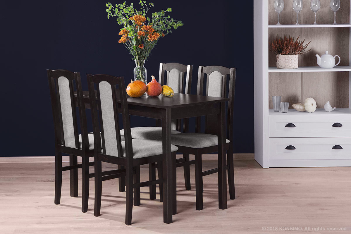 Der moderne Tisch aus der EVENI-Kollektion ist eine hervorragende Wahl für klassische Wohnzimmer, Esszimmer oder Küchen. Die Beine und der Rahmen sind aus massivem Buchenholz gefertigt, wodurch die gesamte Konstruktion außergewöhnlich stabil und langlebig ist. Die Tischplatte besteht aus einer 16 mm laminierten Spanplatte.