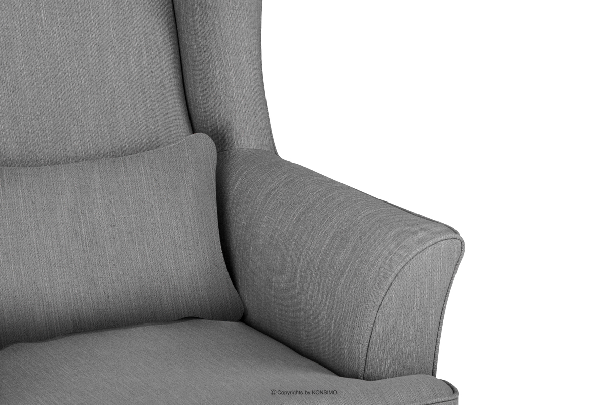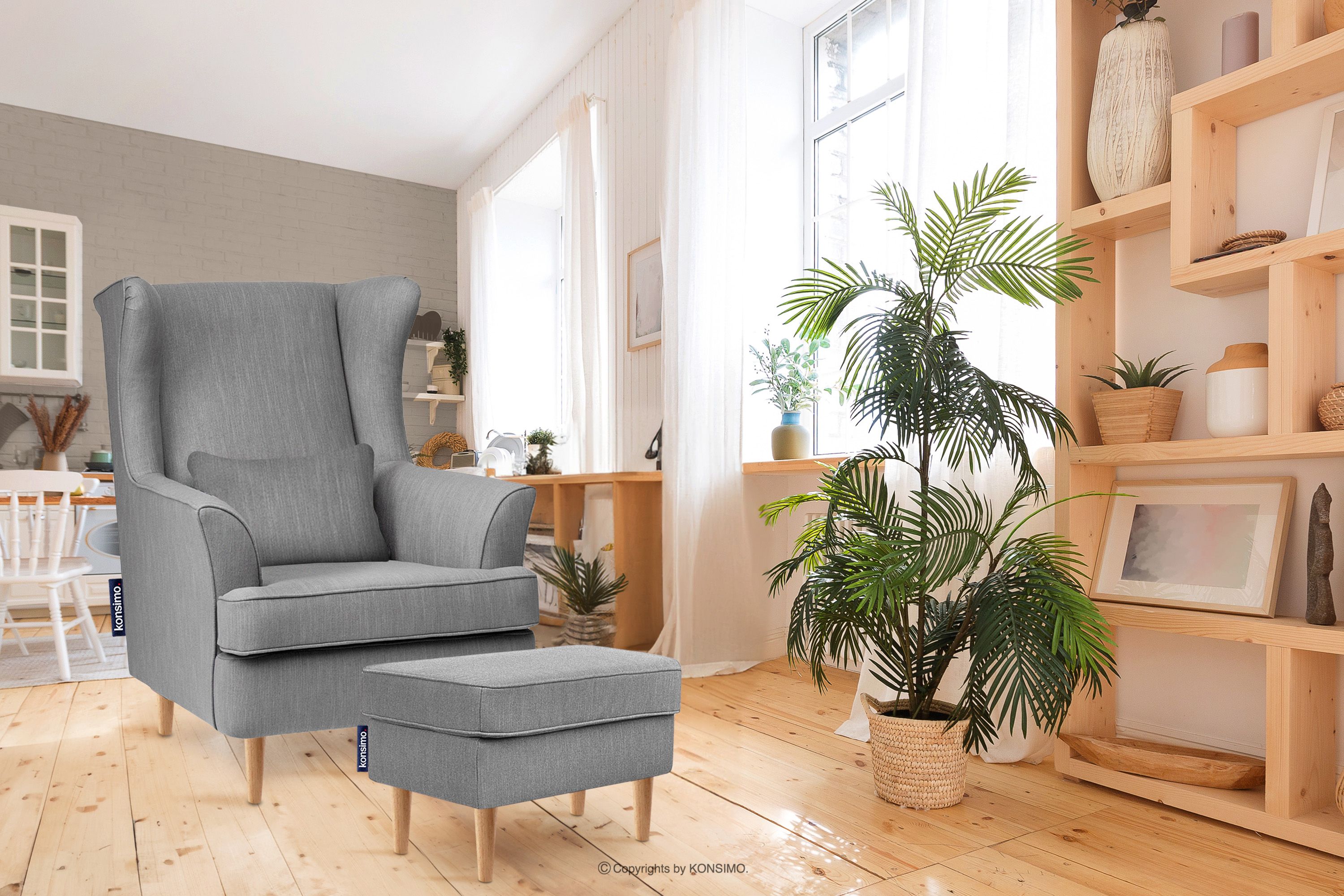 Der bequeme Ohrensessel in hellem Grau auf Beinen verleiht dem Wohnzimmer oder Schlafzimmer eine außergewöhnliche Atmosphäre. Die besondere Farbe, weiche Linien und Elemente aus Massivholz präsentieren sich perfekt zusammen. Er passt zu klassischen und skandinavischen Arrangements. Er eignet sich hervorragend als zentraler Punkt im Wohnzimmer in einer auffälligen Farbe. Zusätzlich bieten das mittelharte Sitzpolster, die optimal geformte, weiche Rückenlehne und Seitenwangen Entspannung und perfekte Erholung jeden Tag.