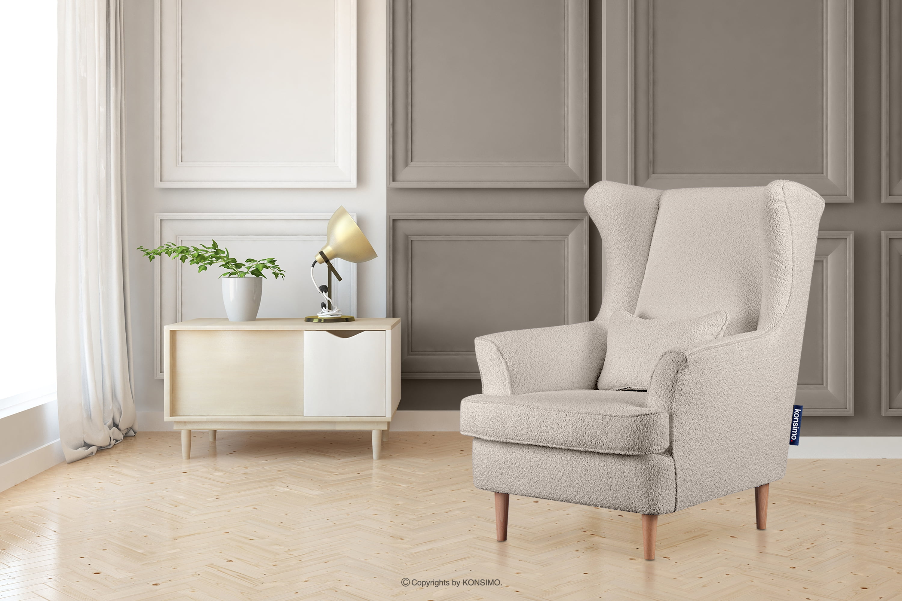 Der außergewöhnlich solide und bequeme Ohrensessel in hellem Beige aus der Kollektion STRALIS passt sowohl in private Innenräume als auch in Hotels oder Restaurants. Der Nutzungskomfort wird durch den angenehmen, hochwertigen Teddy-Stoffbezug erhöht. Die stabile Konstruktion wird von massiven Beinen aus Massivholz unterstützt. Die mittelharte Sitzfläche sowie die optimal geformte, weiche Rückenlehne und Seiten bieten Entspannung und eine perfekte Erholung jeden Tag.