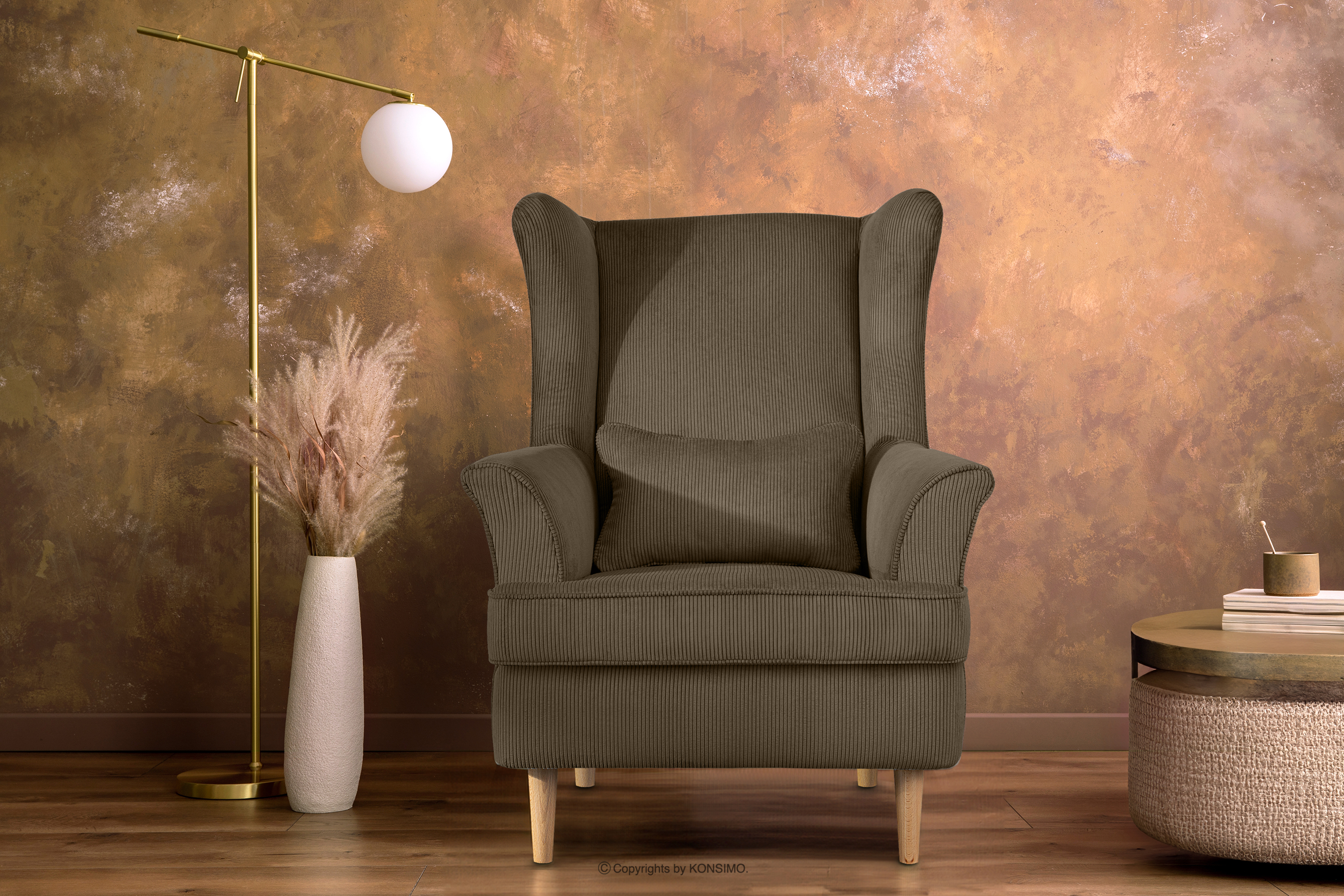 Der Ohrensessel aus Kordstoff auf Holzbeinen in kühlem Braun bringt eine ungewöhnliche Atmosphäre in das Wohn- oder Schlafzimmer. Die einzigartige Farbe, die weichen Linien und die Massivholzelemente passen hervorragend zusammen. Er passt in klassische und skandinavische Einrichtungen. Er eignet sich hervorragend als Mittelpunkt des Wohnzimmers, Büros oder Schlafzimmers. Die mittelfeste Sitzfläche und die optimal geformte, weiche Rückenlehne und die Seitenteile sorgen für Entspannung und perfekte Erholung an jedem Tag.