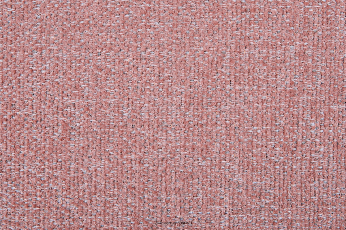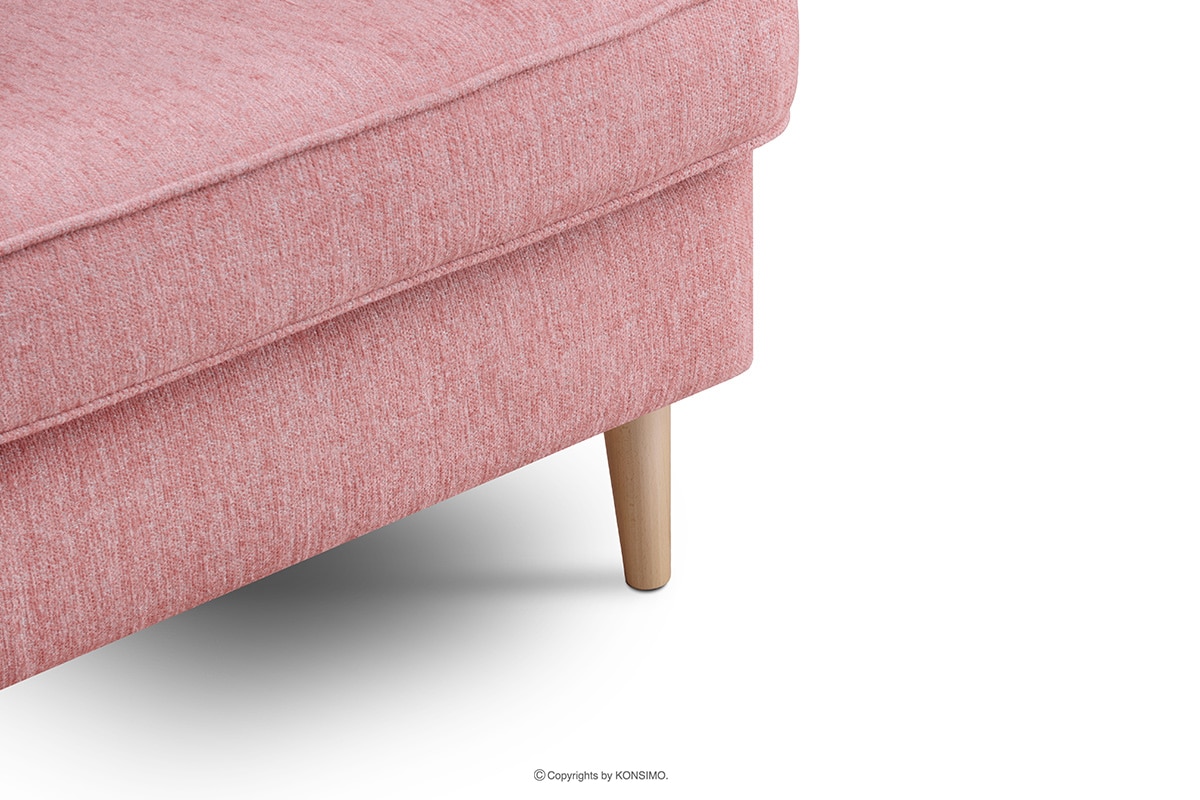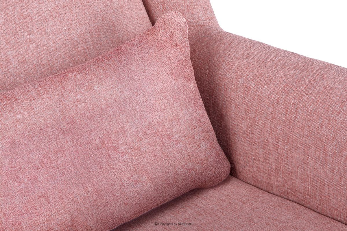 Skandinavisches Sofa mit geflochtenem Stoff in rosa Farbe, verziert mit dekorativen Kissen mit auffälligem Muster. Das Möbelstück wird durch Holzbeine betont, die unterschiedliche Höhen haben - vorne 14 cm und hinten 16 cm. Im Sitz wurde hochelastischer HR 3042-Schaumstoff in Verbindung mit einer Wellenfeder verwendet, die dafür sorgt, dass das Sitzpolster nicht einsinkt und viele Jahre hält.