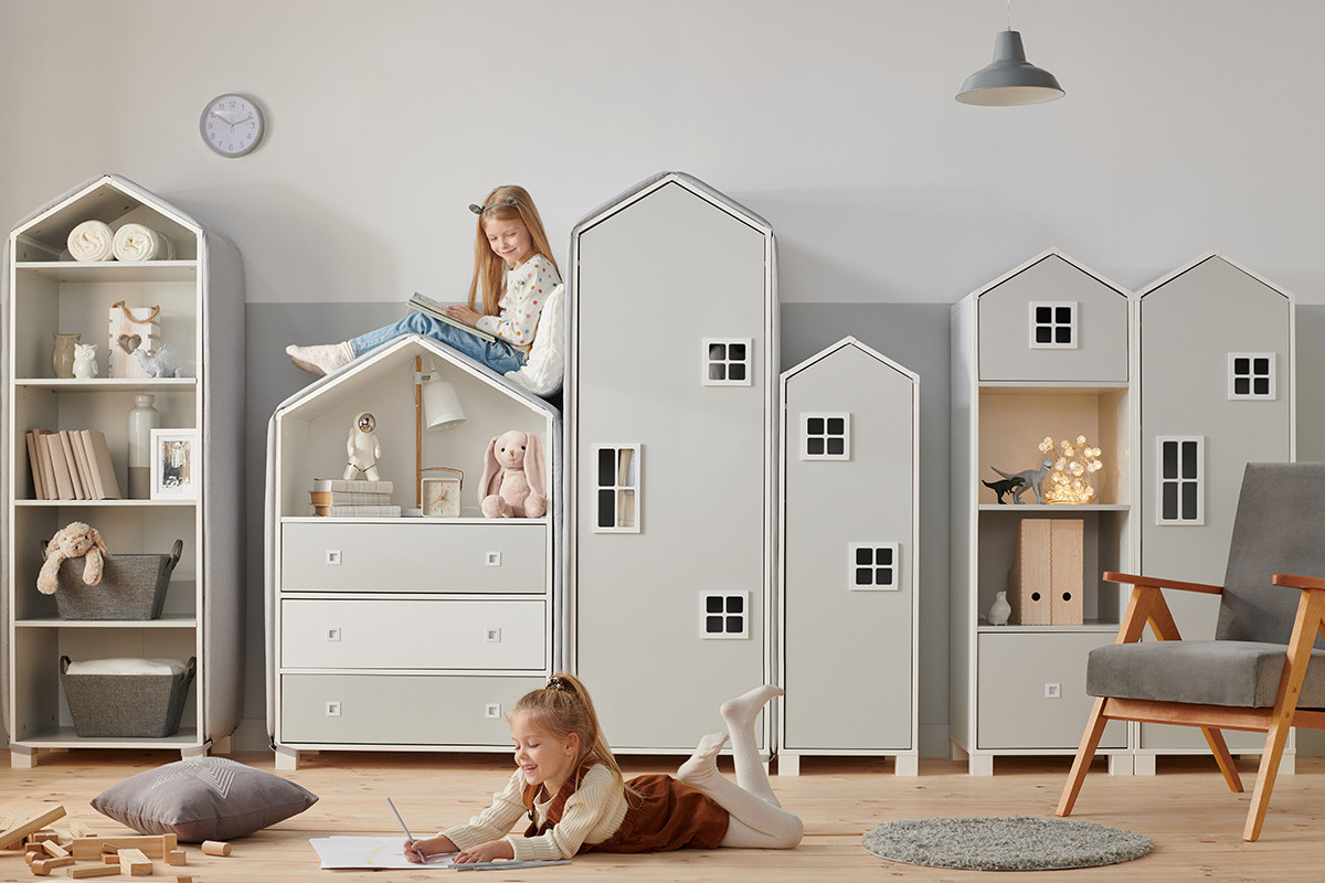 Der Schrank mit Dach aus der MIRUM-Kollektion bietet Platz für viele Kinderkleidung. Er ist unter anderem mit einer Kleiderstange ausgestattet. Bezug: grau.