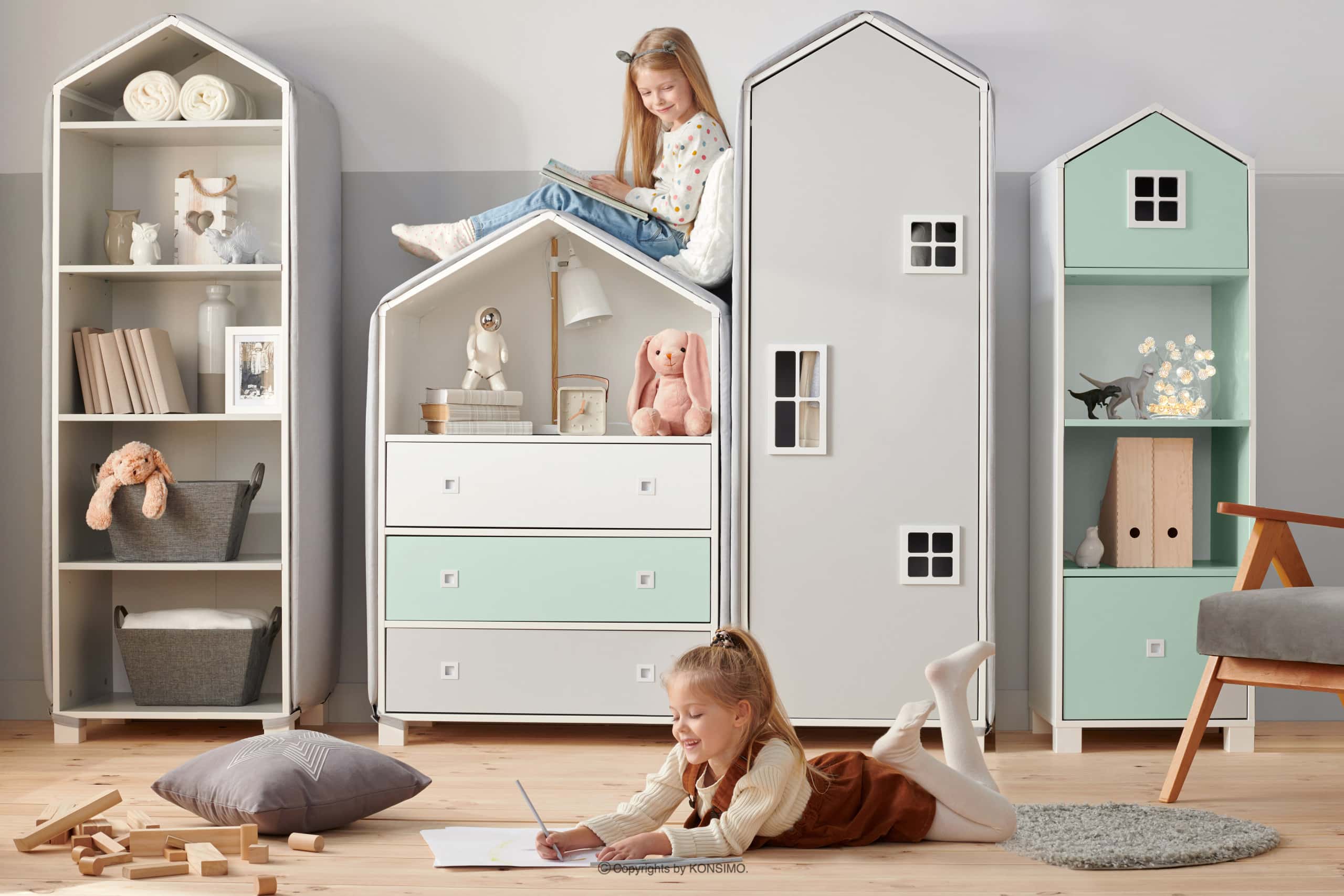 Ein bezauberndes Regal wird den Raum perfekt schmücken. In Kombination mit anderen Möbeln - Kinderhäusern schafft es eine magische Atmosphäre. In solch einer Umgebung fühlt sich das Kind besonders wohl - angenehmes, pastellgraues Aussehen, abgerundete Kanten, die Form eines Puppenhauses, die der Fantasie viel Raum lässt! Das Regal mit Dach MIRUM sieht sowohl alleine großartig aus als auch in Begleitung anderer Kinderzimmermöbel aus dieser Kollektion, um eine märchenhafte Häuserstraße zu schaffen.
