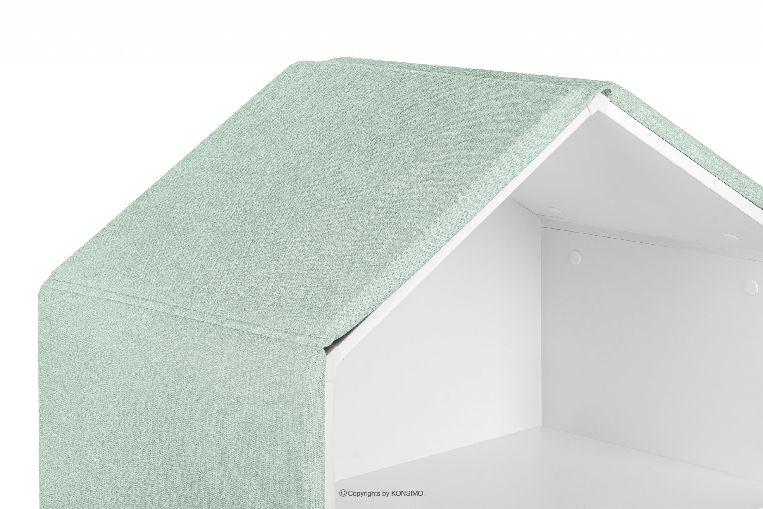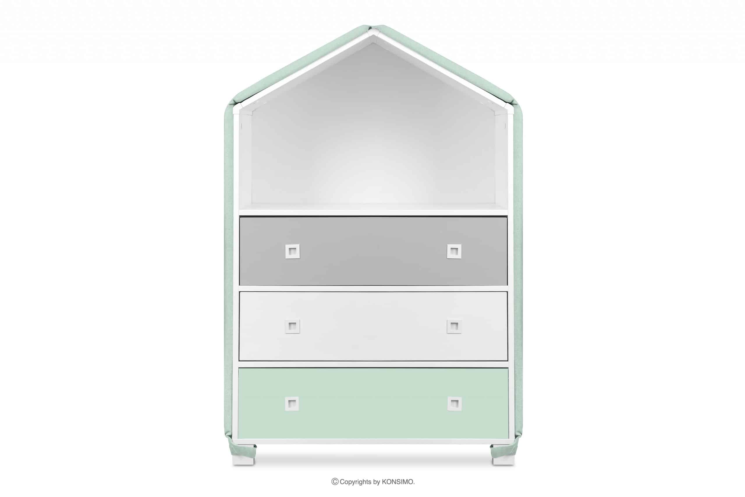 Die Abdeckung passt zu einer grauen, rosa und mintfarbenen Kommode.