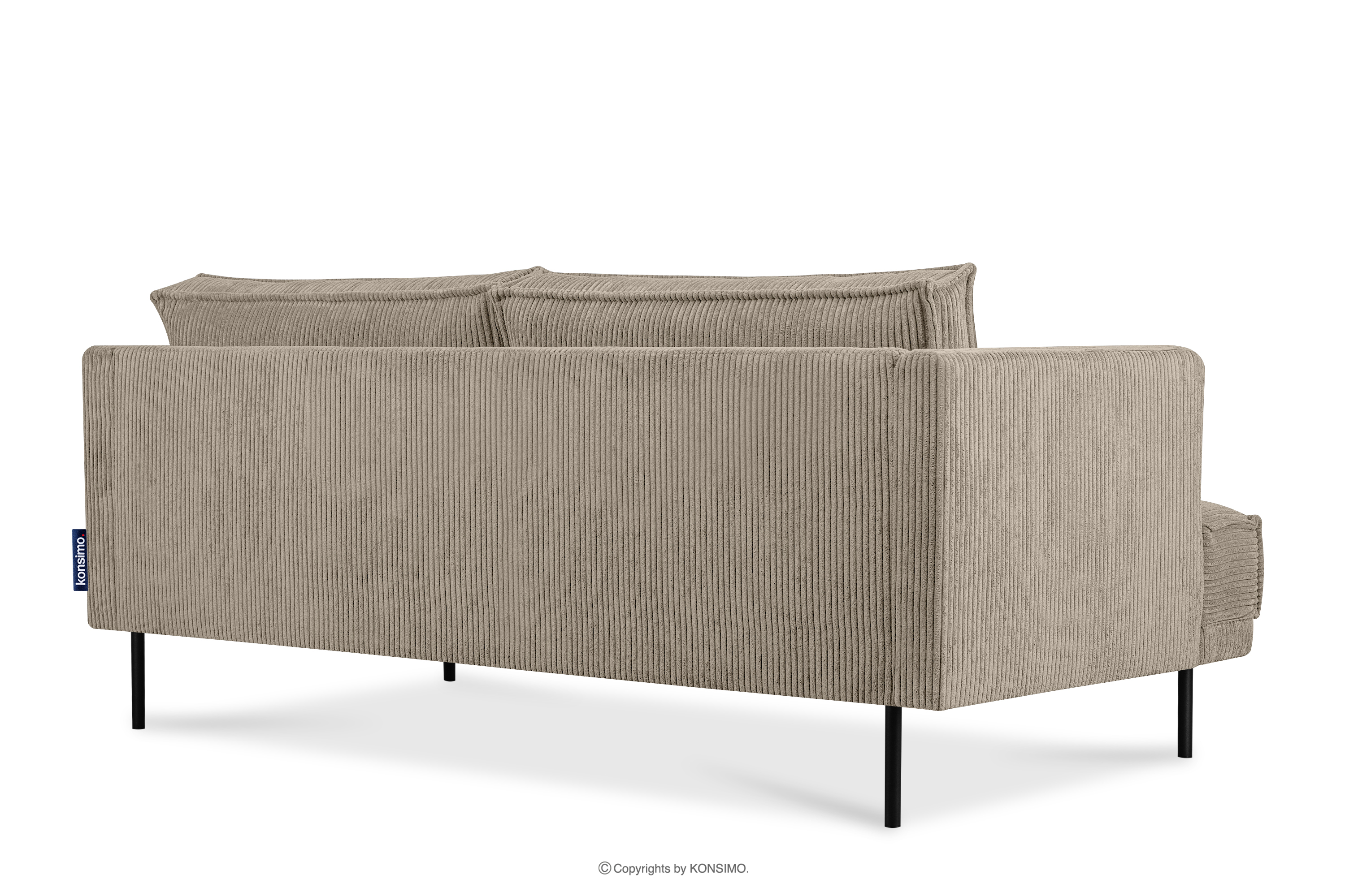 Das Dreisitzer-Sofa aus Cord-Stoff mit beigen Velours-Kissen ist ein echtes Schmuckstück in der Möbelindustrie, das nicht nur außergewöhnlichen Komfort, sondern auch Funktionalität und Ästhetik vereint. Sein einzigartiges Design mit hohen Beinen verleiht dem Interieur Leichtigkeit und Geräumigkeit und ist zudem sehr praktisch. Die Tatsache, dass das Sofa nicht direkt auf dem Boden steht, erleichtert die Reinigung der Unterseite, was äußerst praktisch ist.