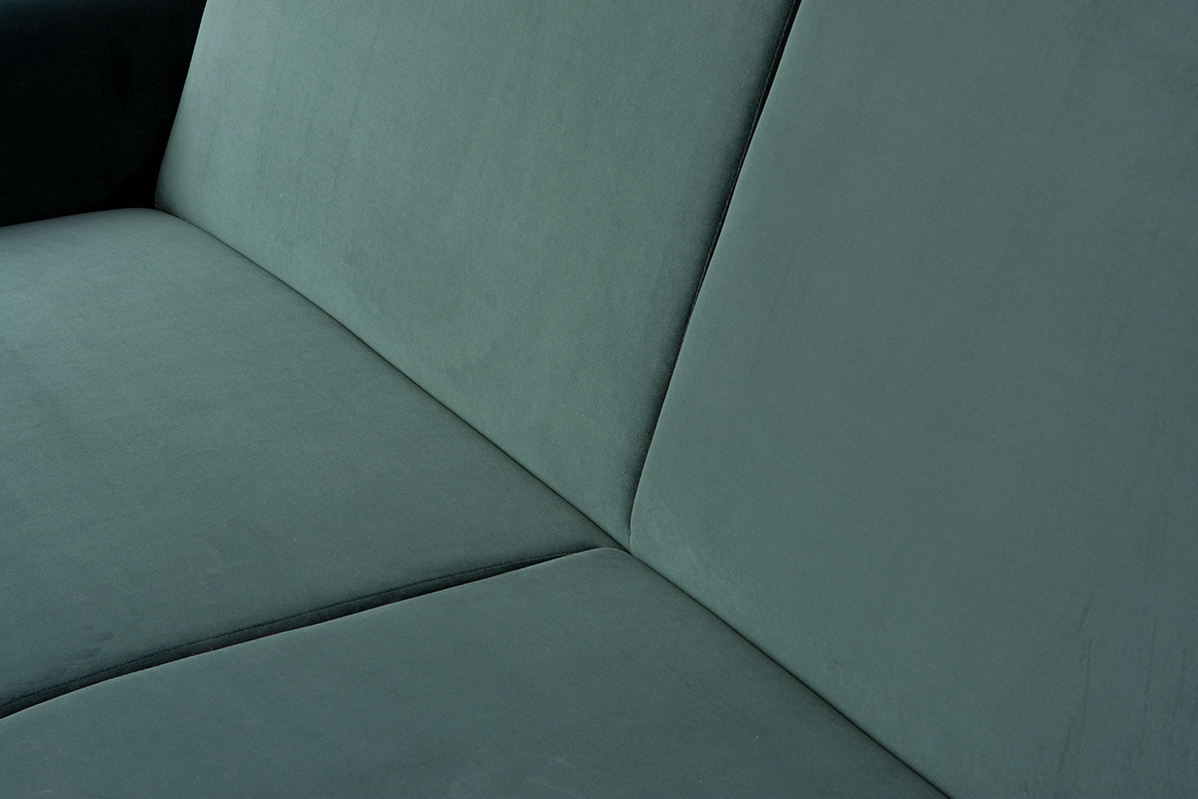 Dies ist eine besonders nützliche Option in einem Wohnzimmer, das gleichzeitig als Schlaf- und Wohnzimmer fungieren soll. Das Sofa ist an allen Seiten mit Veloursstoff bezogen, auch an der Rückseite der Liege, was es ebenfalls von anderen Sofas ähnlicher Bauart unterscheidet, die in diesem Bereich meist mit schwarzem Uni-Stoff bezogen sind. Sowohl die Sessel als auch die Sofas haben hohe Rückenlehnen, was bei dieser Art von Möbeln selten ist.