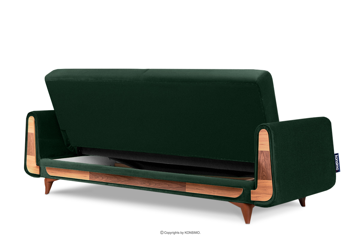 Das ausziehbare grüne Velours-Sofa ist ein Möbelstück im Vintage-Stil. Das Sofa wurde so gefertigt, dass es höchsten Ansprüchen gerecht wird. Ein zusätzlicher Vorteil des Sofas, abgesehen von seinem Aussehen, ist die Tatsache, dass es mit einer Klick-Klack-Entfaltungsfunktion ausgestattet ist, die es Ihnen ermöglicht, es schnell und leise zu entfalten und den Platz zum Schlafen vorzubereiten.
