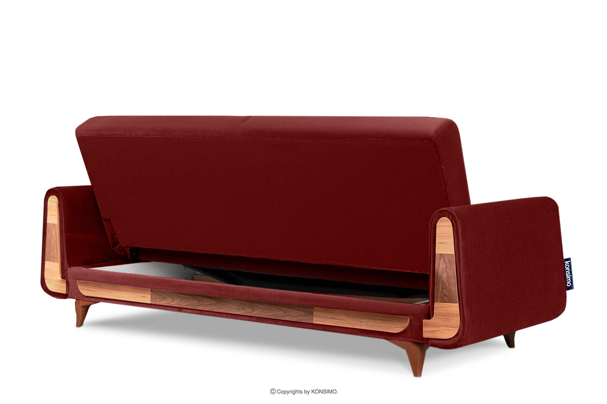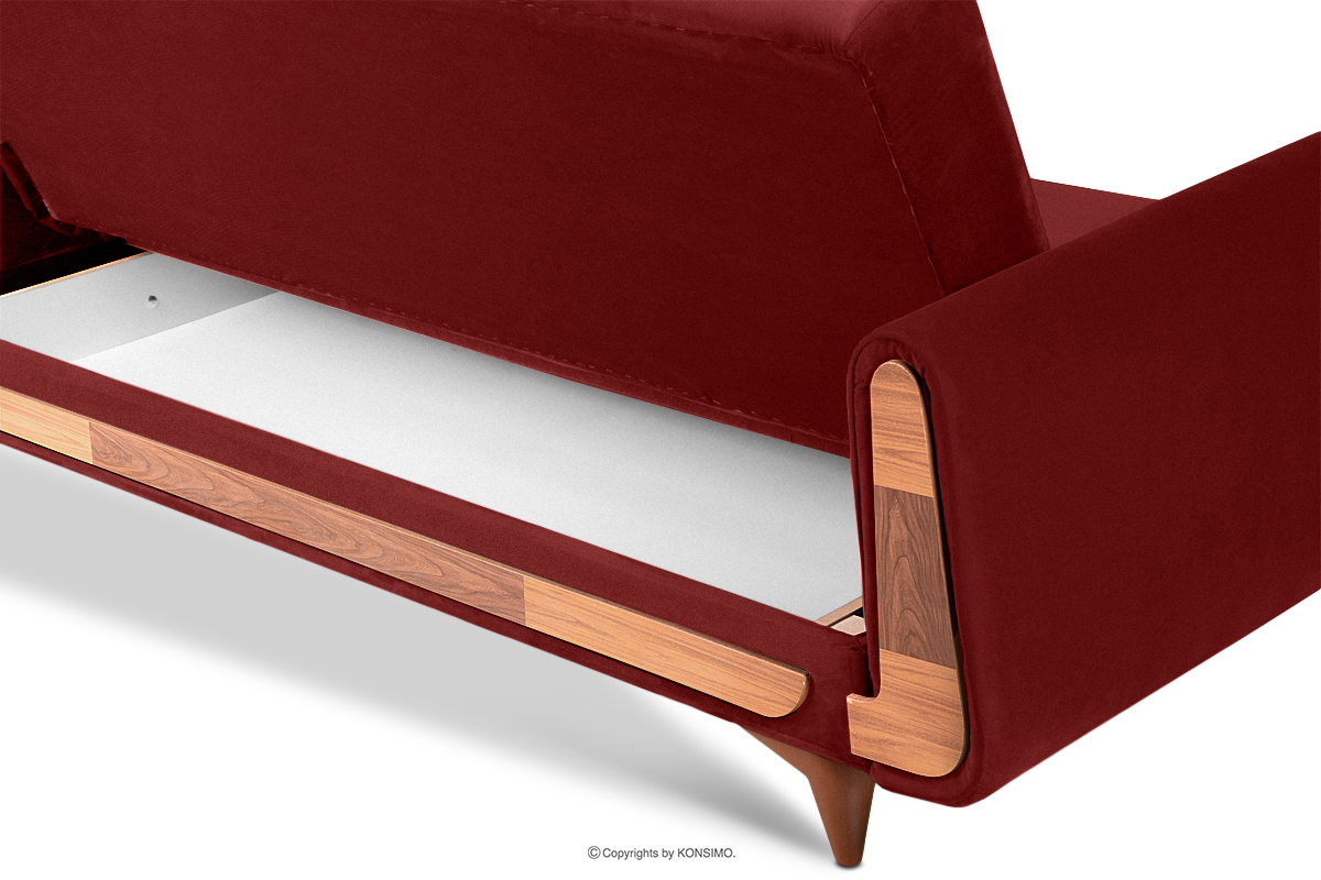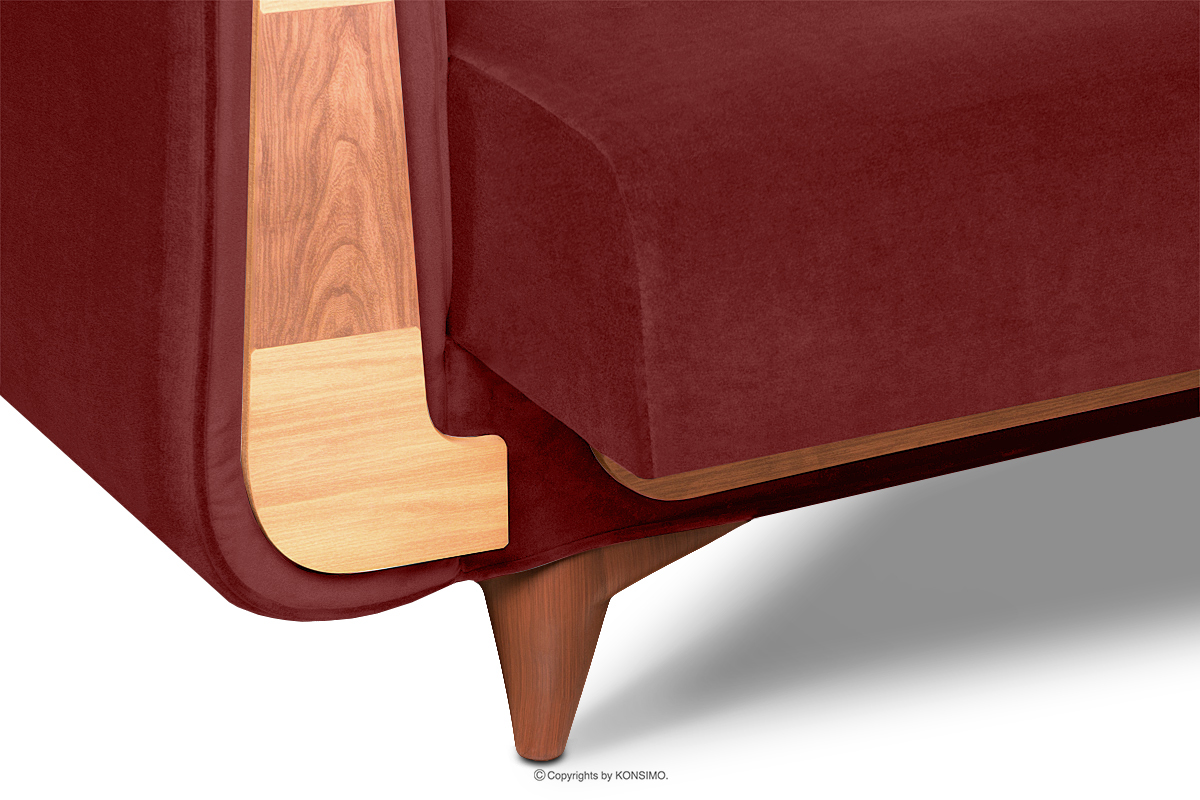 Das ausziehbare rote Velours-Sofa ist ein Möbelstück im Vintage-Stil. Das Sofa wurde so gefertigt, dass es höchsten Ansprüchen gerecht wird. Ein zusätzlicher Vorteil des Sofas, abgesehen von seinem Aussehen, ist die Tatsache, dass es mit einer Klick-Klack-Entfaltungsfunktion ausgestattet ist, die es Ihnen ermöglicht, es schnell und leise zu entfalten und den Platz zum Schlafen vorzubereiten.