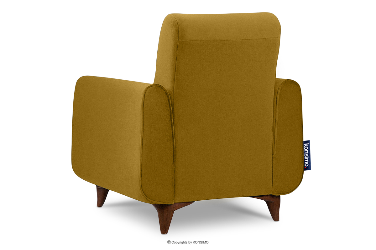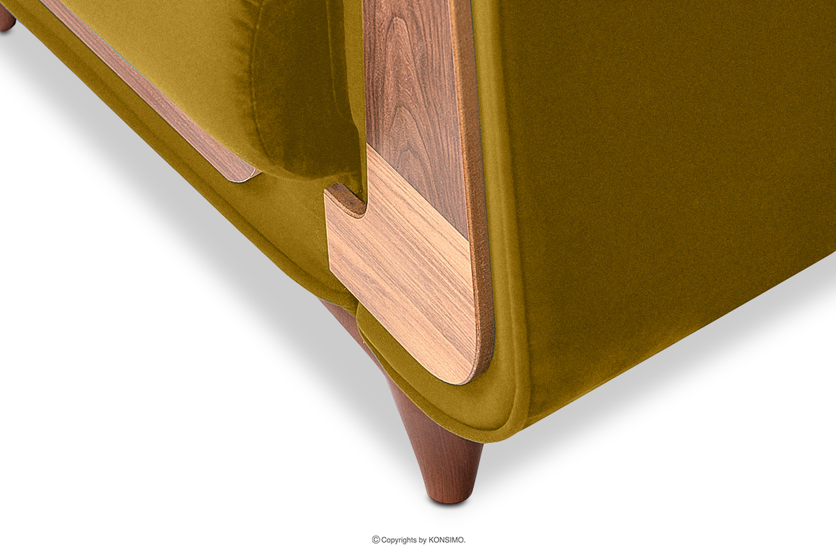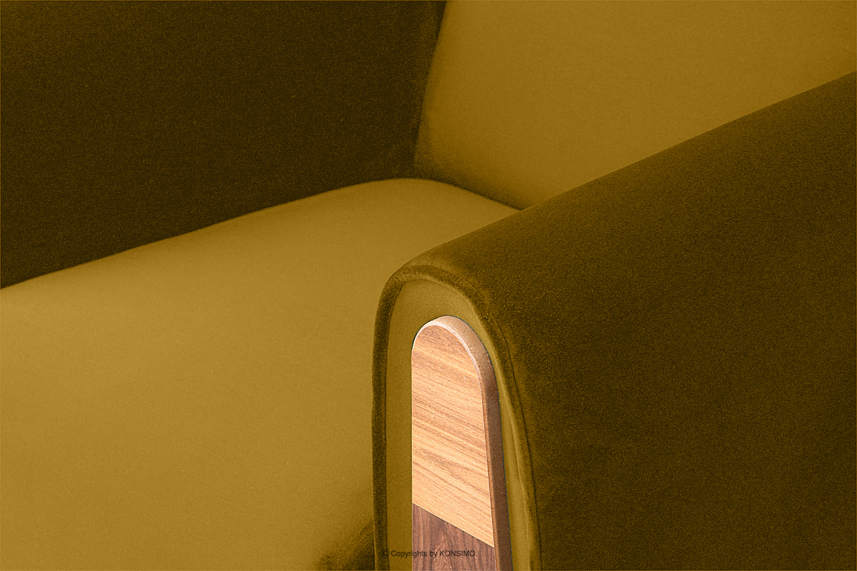 Der Lounge-Sessel aus gelbem Velours ist ein Möbelstück im Vintage-Stil. Er wurde für höchste Ansprüche gefertigt. Das Design wurde von der kommunistischen Zeit inspiriert, aber unsere Designer entschieden sich zusätzlich für Einsätze, die vom skandinavischen Stil inspiriert sind. GUSTAVO ist an allen Seiten, einschließlich der Rückenlehne, mit Veloursstoff gepolstert und hebt sich dadurch von anderen Möbeln ähnlicher Bauart ab, die in diesem Bereich meist mit schwarzem Uni-Stoff bezogen sind.
