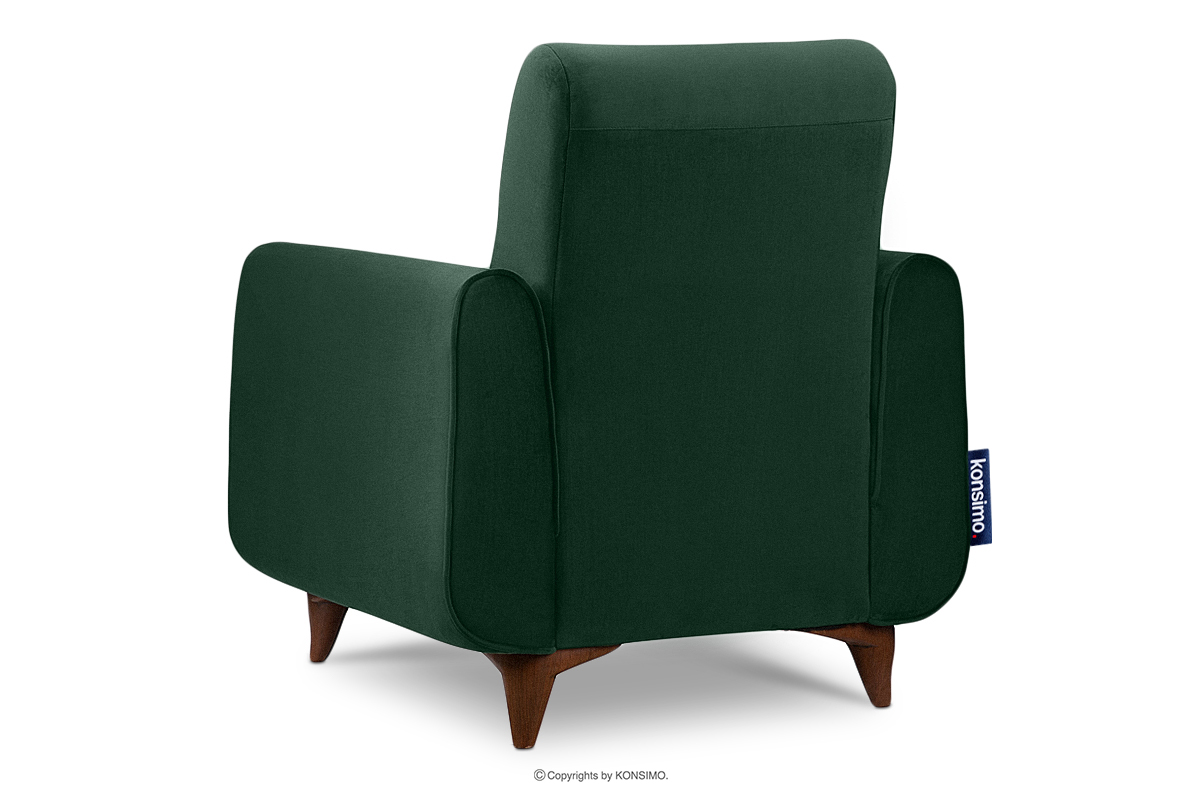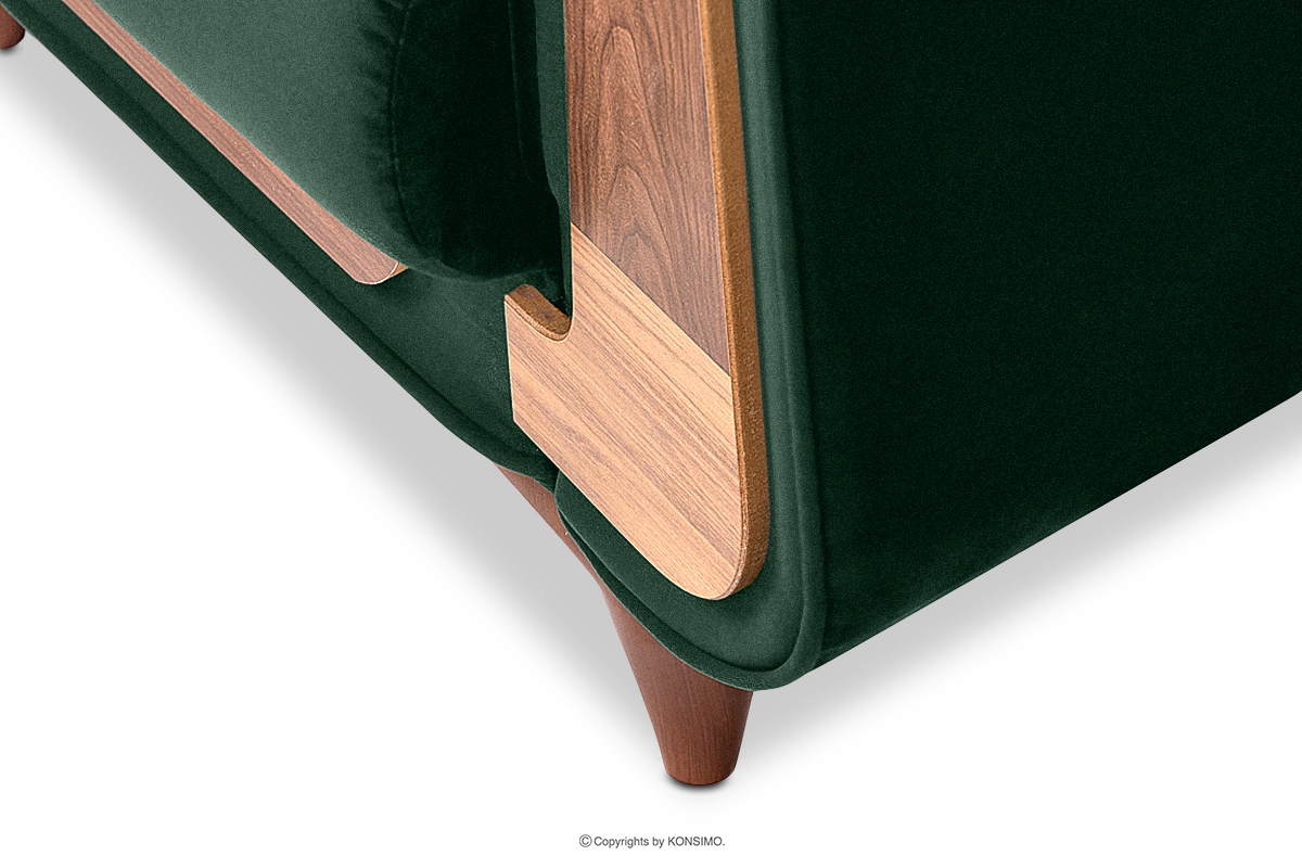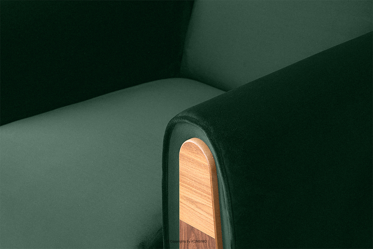 Der grüne Sessel aus Velours ist ein Möbelstück im Vintage-Stil. Er wurde hergestellt, um den höchsten Ansprüchen zu genügen. Das Design wurde von der kommunistischen Zeit inspiriert, aber unsere Designer entschieden sich zusätzlich für Einsätze, die vom skandinavischen Stil inspiriert sind. GUSTAVO ist an allen Seiten, einschließlich der Rückenlehne, mit Veloursstoff gepolstert und hebt sich dadurch von anderen Möbeln ähnlicher Bauart ab, die in diesem Bereich meist mit schwarzem Uni-Stoff bezogen sind.