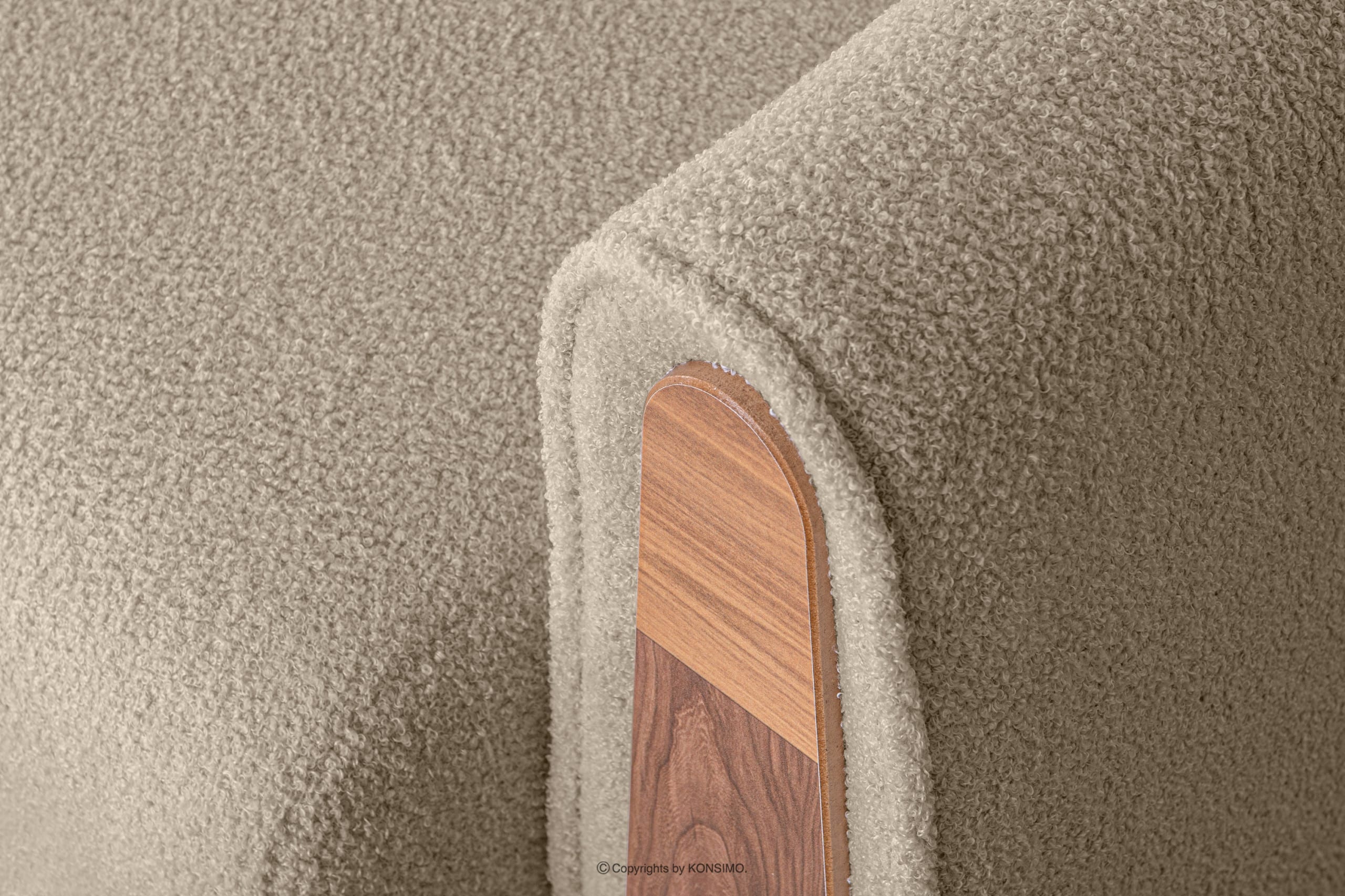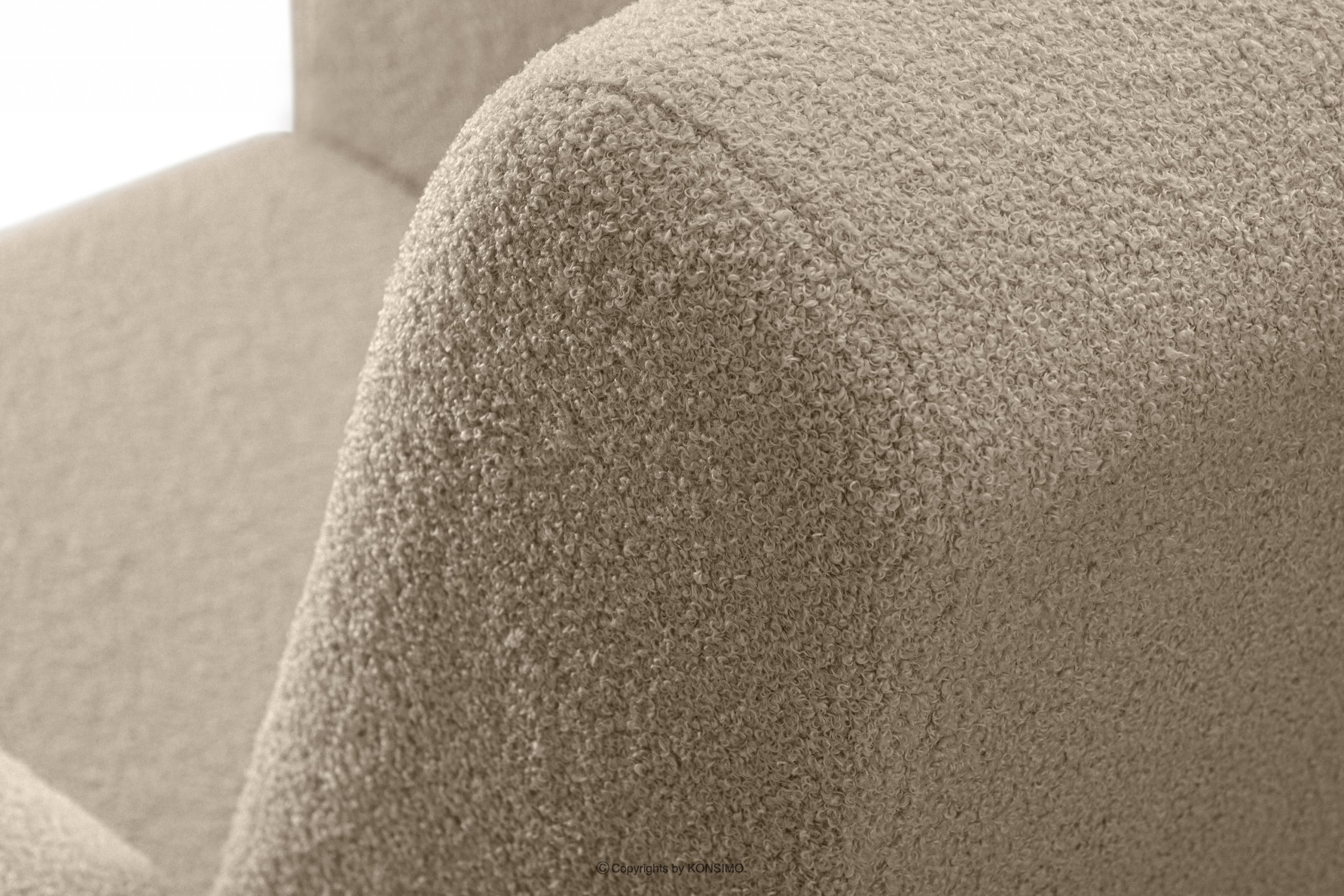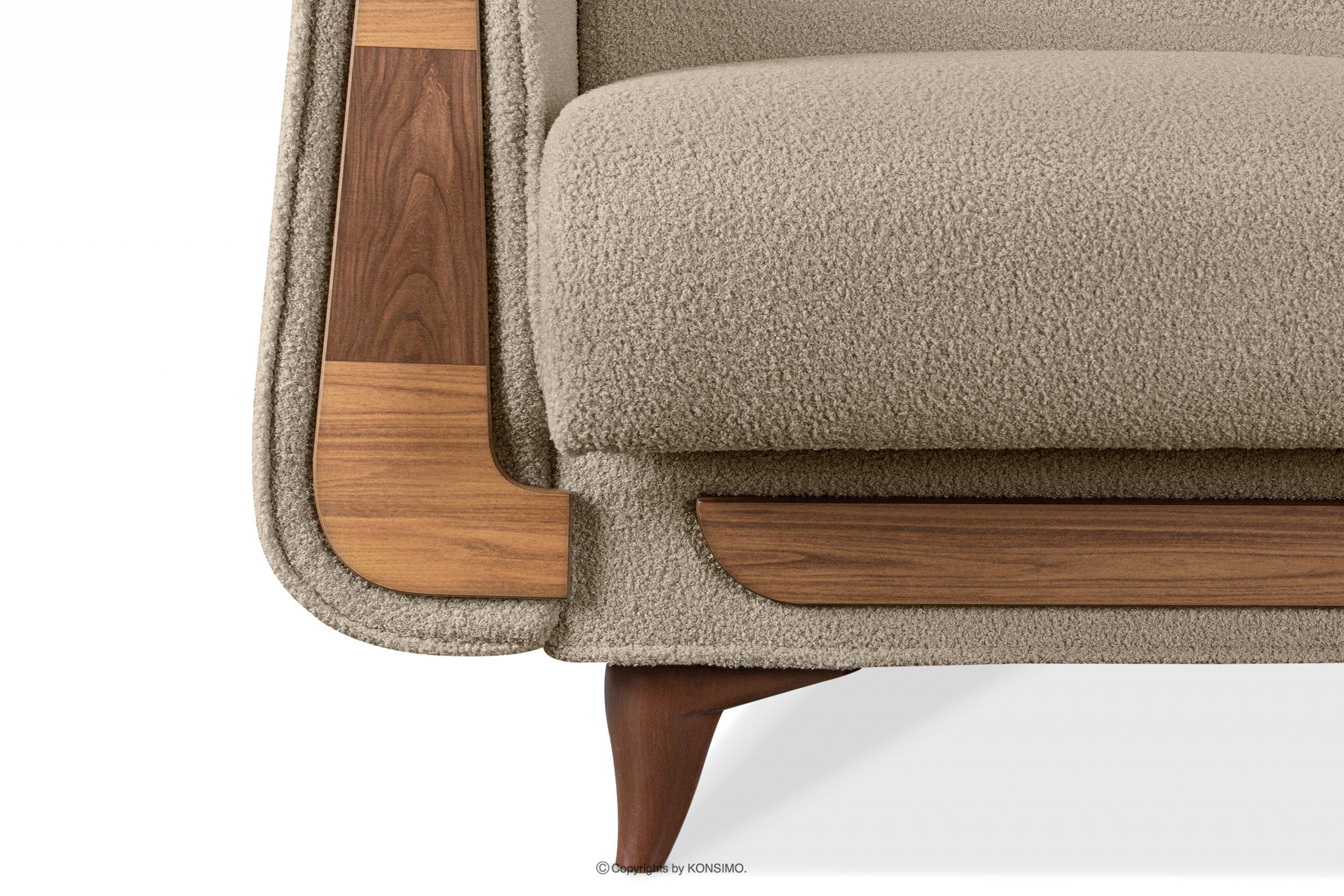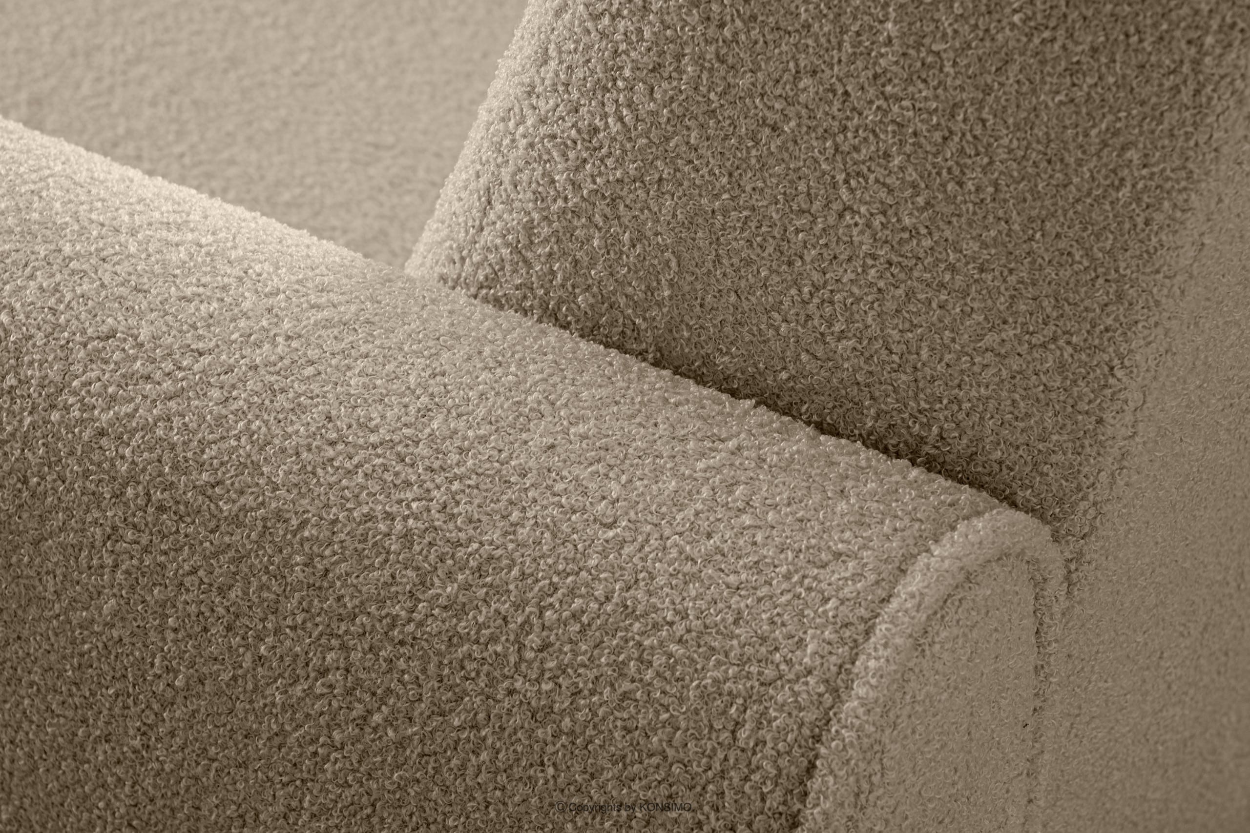 Der Sessel in cremefarbenem Lammstoff ist ein Möbelstück im Vintage-Stil. Er wurde für höchste Ansprüche gefertigt. Das Design wurde von der Zeit der Volksrepublik Polen inspiriert, aber unsere Designer entschieden sich zusätzlich für Einsätze, die vom skandinavischen Stil inspiriert sind. GUSTAVO ist an allen Seiten, einschließlich der Rückenlehne, mit Veloursstoff gepolstert und hebt sich dadurch von anderen Möbeln ähnlicher Bauart ab, die in diesem Bereich üblicherweise mit schwarzem Uni-Stoff bezogen sind.