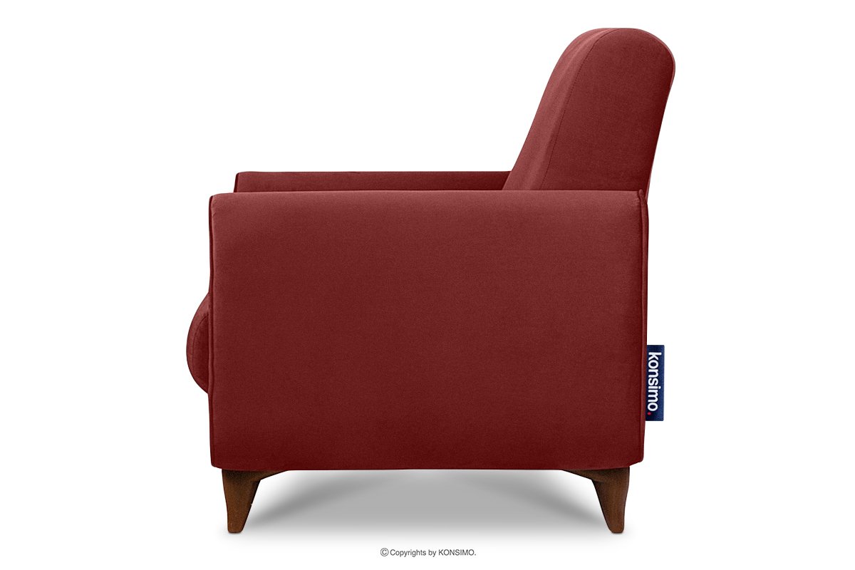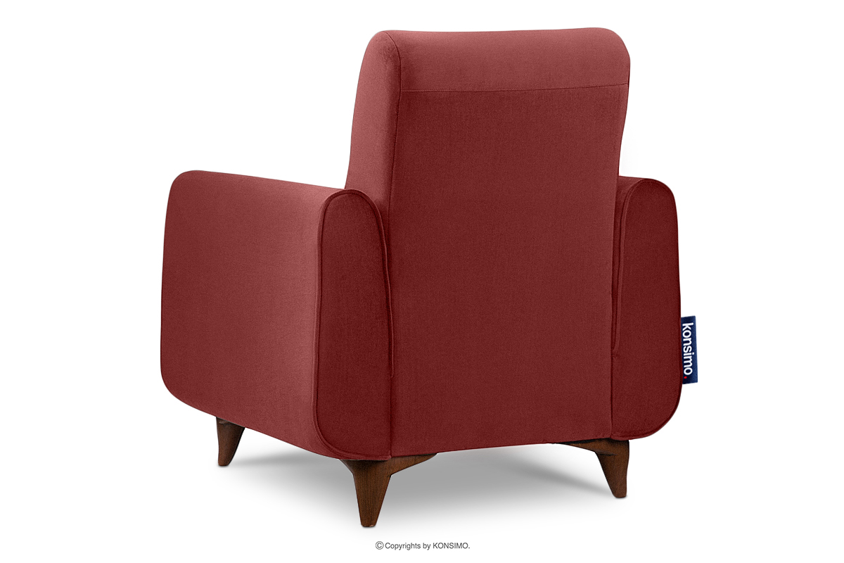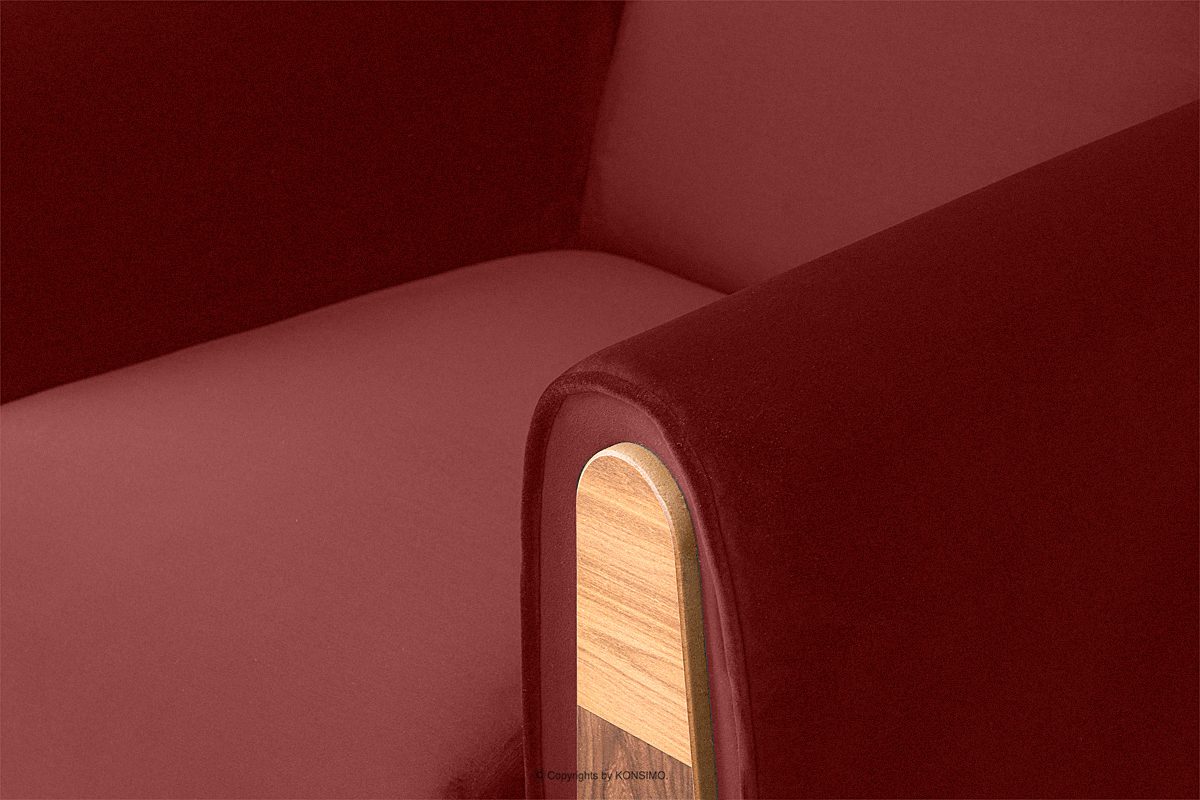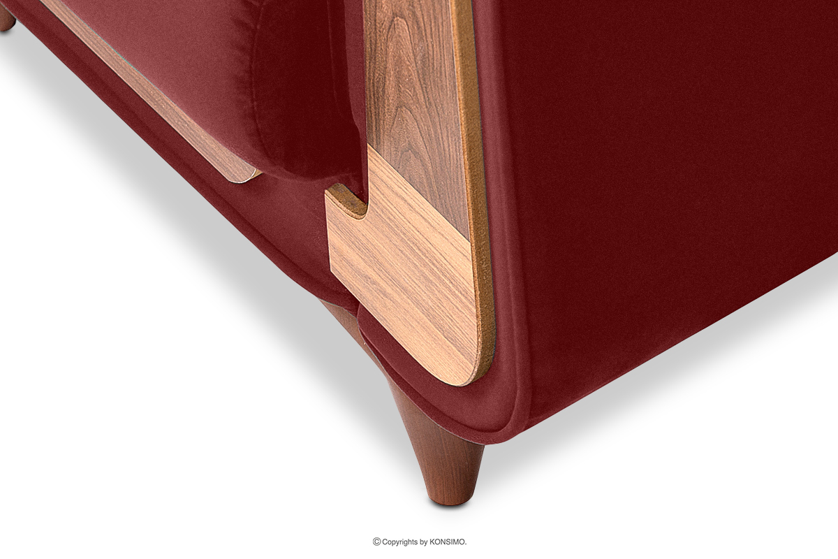 Der Lounge-Sessel aus rotem Velours ist ein Möbelstück im Vintage-Stil. Er wurde für höchste Ansprüche gefertigt. Das Design wurde von der kommunistischen Zeit inspiriert, aber unsere Designer entschieden sich zusätzlich für Einsätze, die vom skandinavischen Stil inspiriert sind. GUSTAVO ist an allen Seiten, einschließlich der Rückenlehne, mit Veloursstoff gepolstert und hebt sich dadurch von anderen Möbeln ähnlicher Bauart ab, die in diesem Bereich meist mit schwarzem Uni-Stoff bezogen sind.