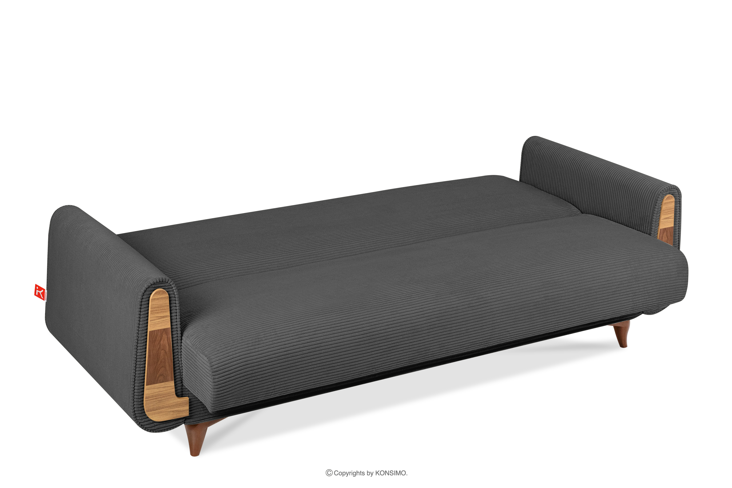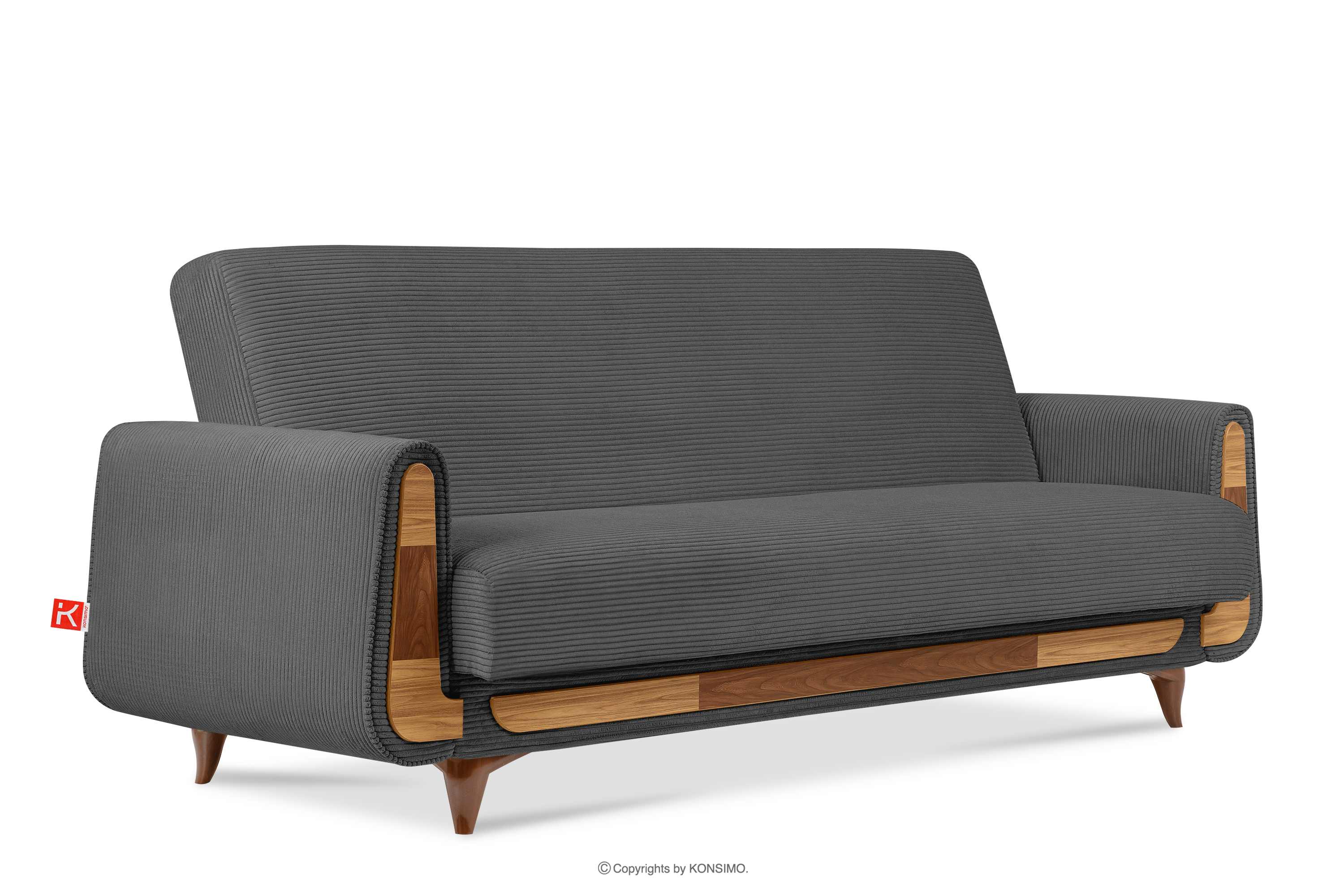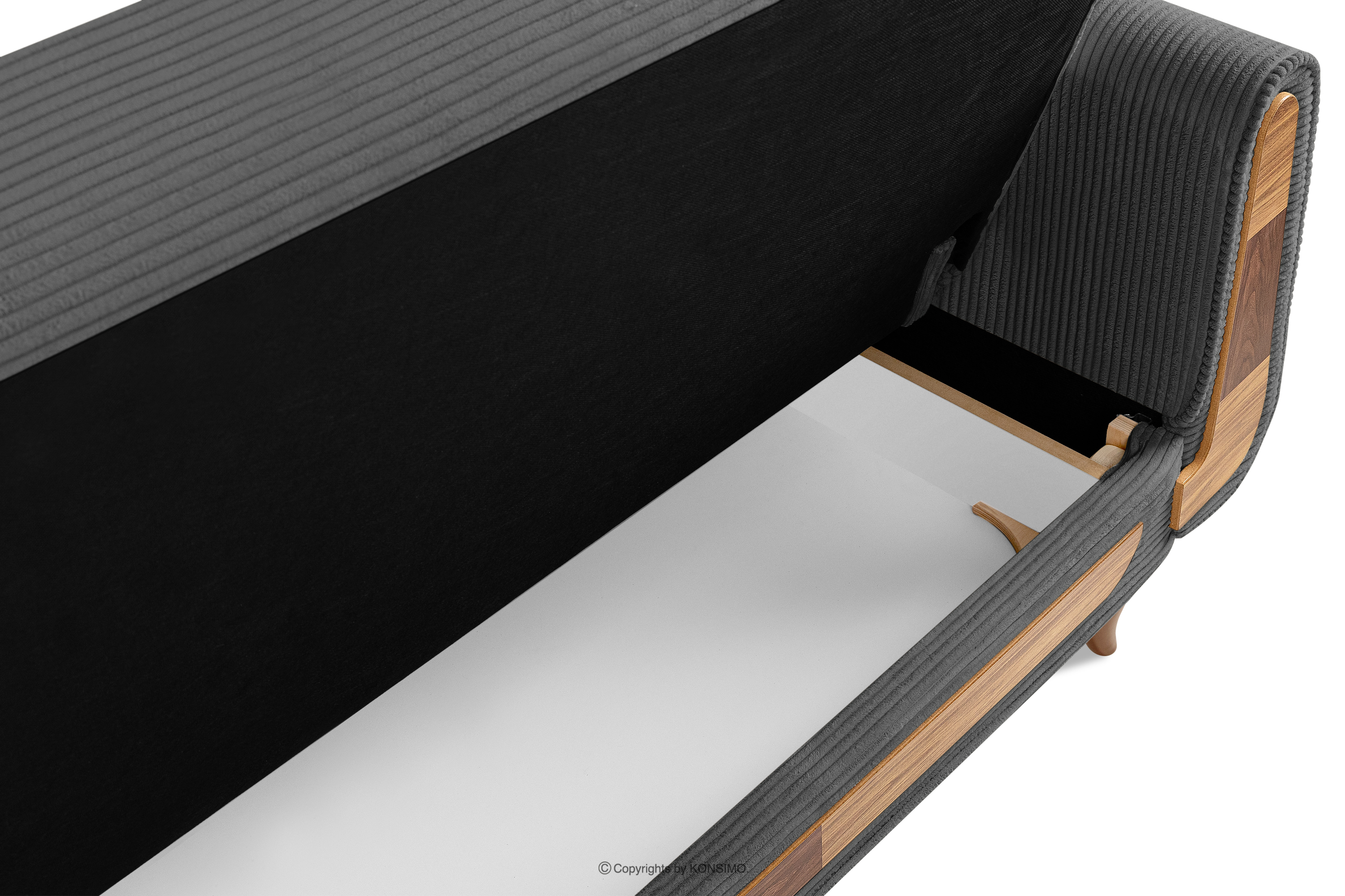 Das dreisitzige ausziehbare Sofa aus Kordstoff in Dunkelgrau ist ein Möbelstück im Vintage-Stil. Es wurde für höchste Ansprüche gefertigt. Es findet auch in eleganten und loftartigen Räumen seinen perfekten Platz. Der Stoff, mit dem das Sofa gepolstert ist, fühlt sich sehr angenehm an und ist leicht zu reinigen. Ein weiterer großer Vorteil ist die Schlaffunktion und ein Behälter für die Aufbewahrung von Bettzeug, was die Ordnung definitiv erleichtert.