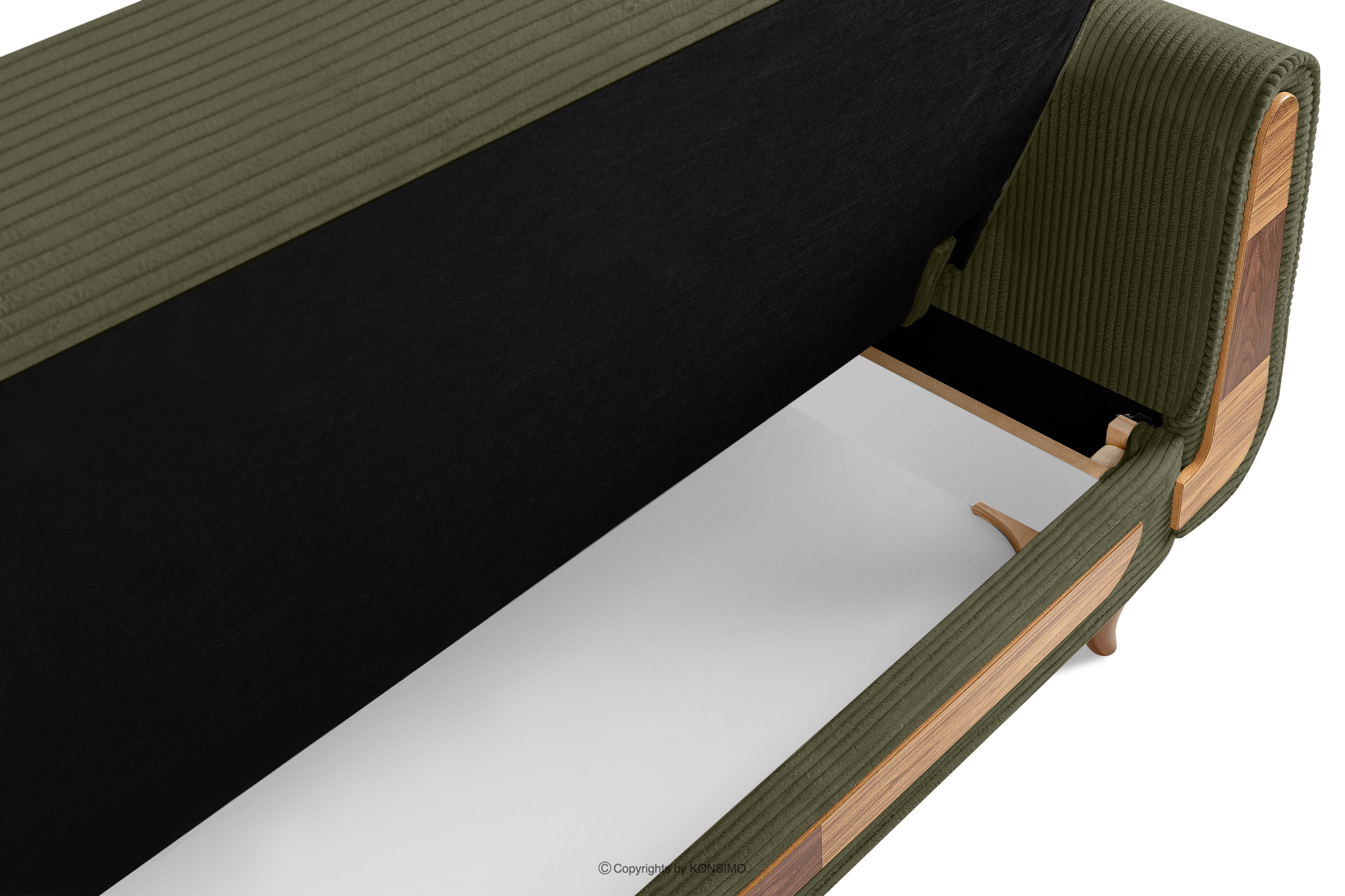 Das dreisitzige ausziehbare Sofa aus olivgrünem Kordstoff ist ein Möbelstück im Vintage-Stil. Es wurde für höchste Ansprüche gefertigt. Es findet auch in eleganten und loftartigen Räumen seinen perfekten Platz. Der Stoff, mit dem das Sofa gepolstert ist, fühlt sich sehr angenehm an und ist leicht zu reinigen. Ein weiterer großer Vorteil ist die Schlaffunktion und ein Behälter für die Aufbewahrung von Bettzeug, was die Ordnung definitiv erleichtert.
